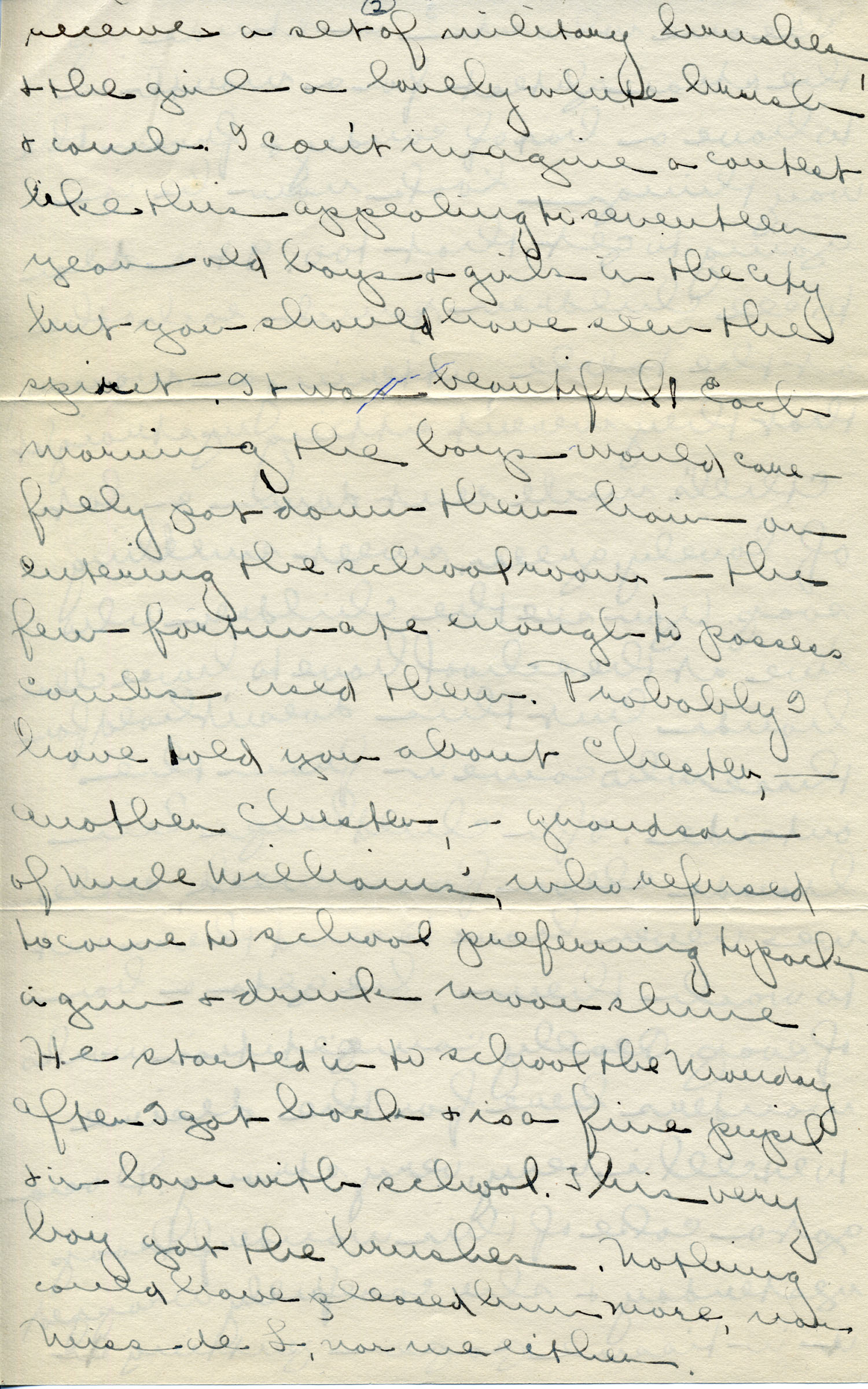 I wonder if I told you about our competitions in school. Several weeks ago Miss De Long came down and we decided that at the end of two weeks the boy whose hair had made the greatest improvement would receive a set of military brushes, and the girl a lovely white brush and comb. I can’t imagine a contest like this appealing to seventeen-year-old boys and girls in the city but you should have seen the spirit. It was beautiful! Each morning the boys would carefully pat down their hair on entering the schoolroom — the few fortunate enough to possess combs used them. Probably I have told you about Chester — another Chester — grandson of Uncle William’s, who refused to come to school preferring to pack a gun and drink moonshine. He started in to school the Monday after I got back and is a fine pupil and in love with school. This very boy got the brushes. Nothing could have pleased him more, nor Miss de L[ong], nor me either. The one who sits or stands up the straightest for a month is to have a box of candy and from the way things look now he is going to get that, too. It is dear to see the children punch each other at the table, uttering a warning that they weren’t sitting up straight. Ethel’s uncle sent down a lot of lovely, green, sweet smelling soap. You see, the children who live at the school have to have clean hands but this doesn’t hold for those who come in from the outside. If a child keeps his hands clean for a week, so clean we never have to send them out to wash them, he gets a bar of soap. Really competition works wonders here for the desire to excel is very, very strong. Dosia got a cake of this wonderful soap yesterday and she carefully wrapped it in tissue paper, putting it on her shelf.