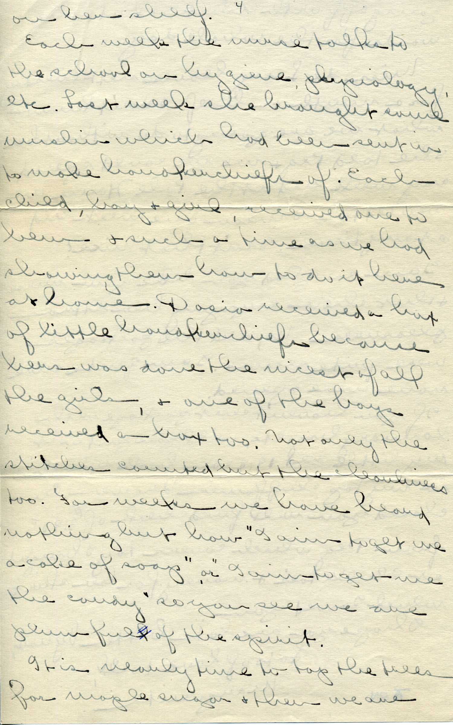 Each week the nurse talks to the school on hygiene, physiology, etc. Last week she brought some muslin which had been sent in to make handkerchiefs of. Each child, boy and girl, received one to hem and such a time as we had showing them how to do it here at home. Dosia received a box of little handkerchiefs because hers was done the best of all the girls, and one of the boys received a box too. Not only the stitches counted but the cleanliness too. For weeks we have heard nothing but how “I aim to get me a cake of soap” or “I aim to get me the candy” so you see we are plum full of the spirit.