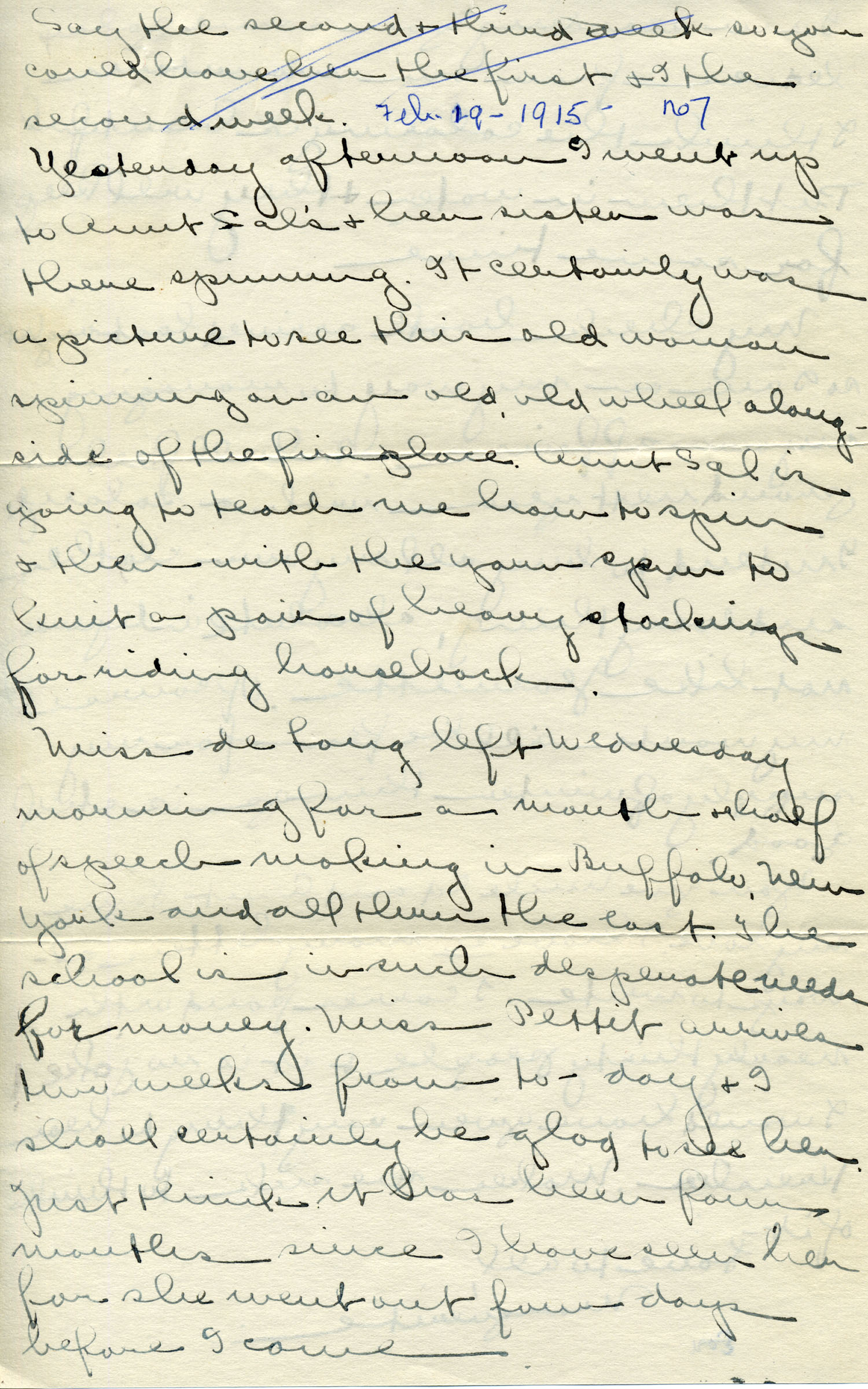 Yesterday afternoon I went up to Aunt Sal’s and her sister was there spinning. It certainly was a picture to see this old woman spinning on an old, old wheel alongside of the fireplace. Aunt Sal is going to teach me how to spin and then with the yarn spun to knit a pair of heavy stockings for riding horseback. Miss de Long left Wednesday morning for a month, half of speech making in Buffalo, New York and all thru the east. The school is in such desperate need for money. Miss Pettit arrives two weeks from today and I shall certainly be glad to see her. Just think it has been four months since I have seen her for she went out four days before I came.