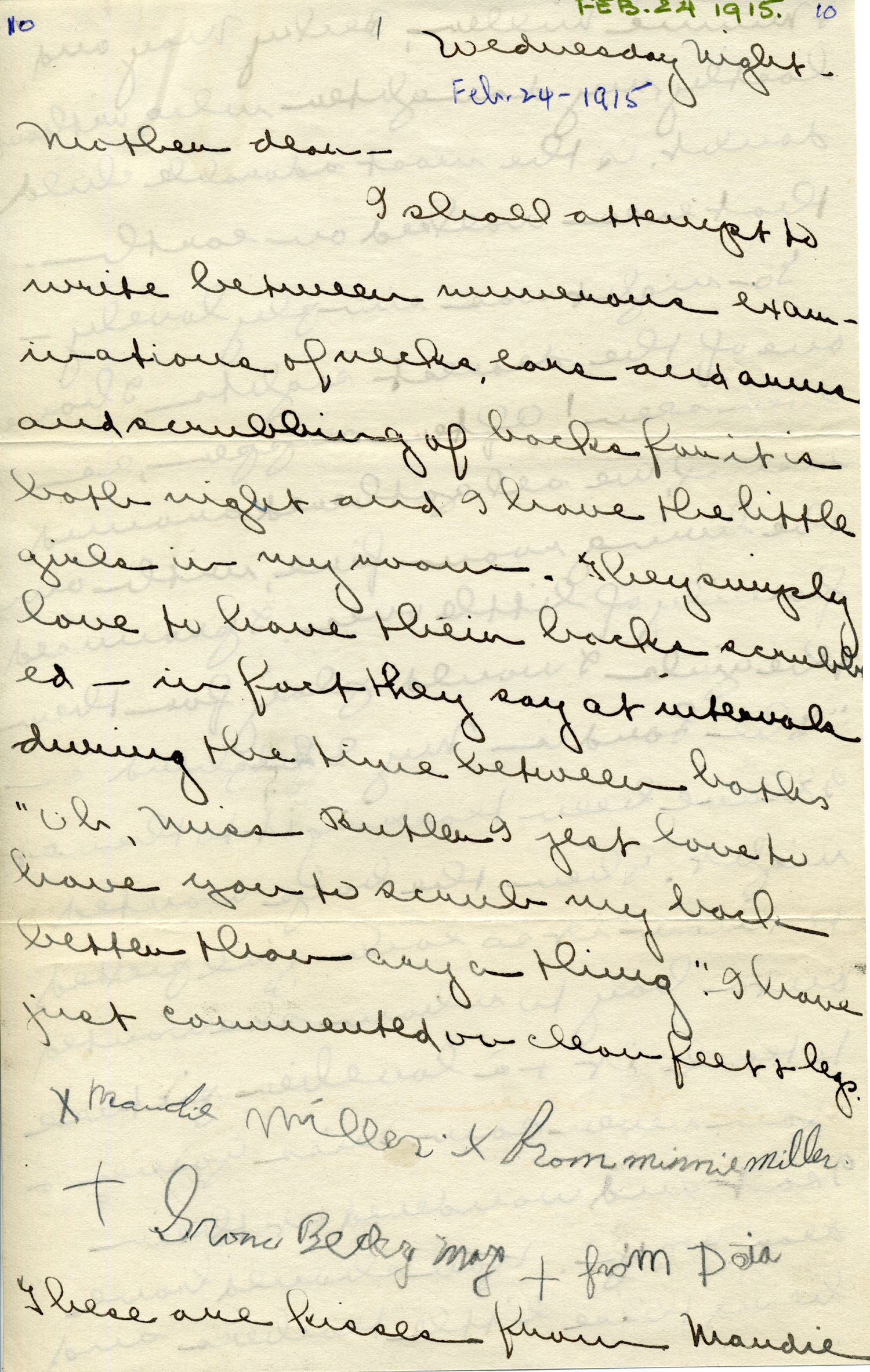 Mother, dear — I shall attempt to write between numerous examinations of necks, ears and arms and scrubbing of backs for it is bath night and I have the little girls in my room. They simply love to have their backs scrubbed — in fact they say at intervals during the time between baths “Oh, Miss Butler, I jest love to have you scrub my back better than anything.” I have just commented on clean feet and legs.