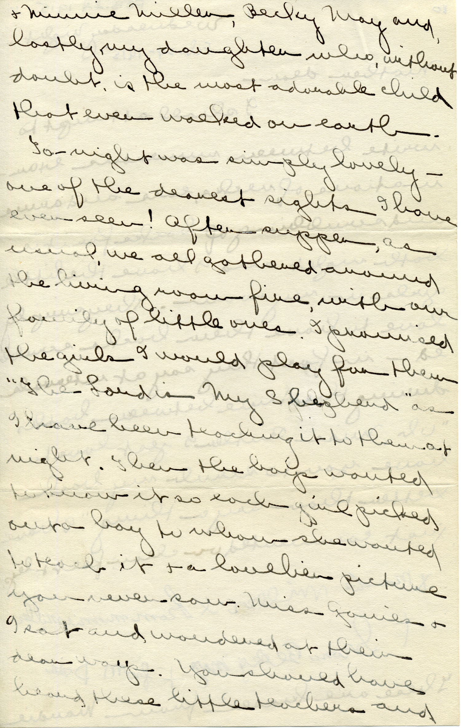 Tonight was simply lovely — one of the dearest sights I have ever seen! After supper, as usual, we all gathered around the living room fire with our family of little ones. I promised the girls I would play for them “The Lord is my Shepherd” as I have been teaching it to them at night. Then the boys wanted to know it so each girl picked out a boy to whom she wanted to teach it and a lovelier picture you never saw. Miss Gaines and I sat and wondered at their dear ways. You should have heard these little teachers and little scholars endeavoring to master “he restoreth my soul,” “Yea, tho’ I walk thru the valley of the shadow of death,” and “thou anointest my head…” Their earnestness was shown in their facial expressions. Really I don’t know when I have seen anything more impressive than these little groups trying to learn that lovely psalm. After seven minutes all the boys stood around us and repeated the psalm and then the girls did. They had learned it quite well too.