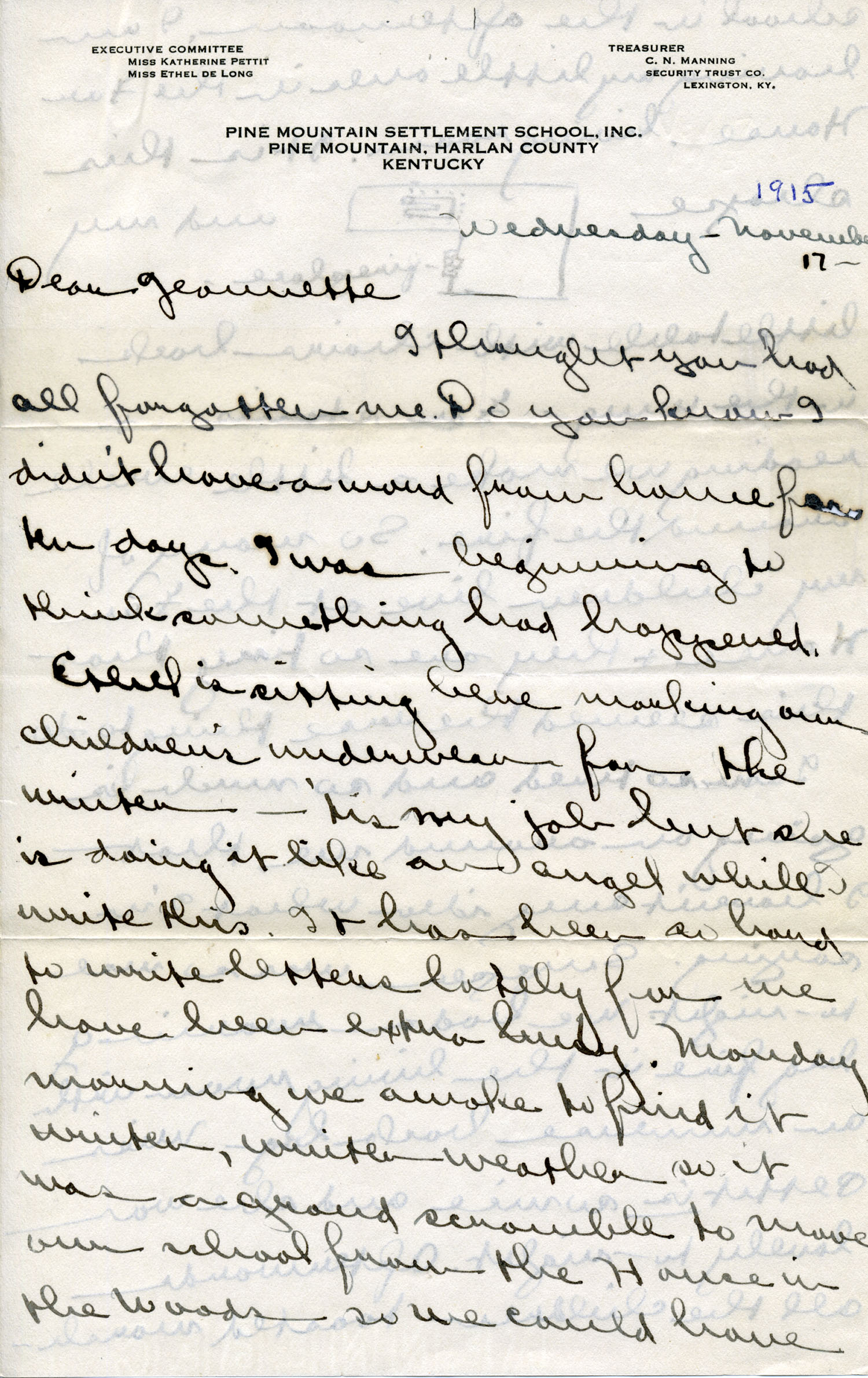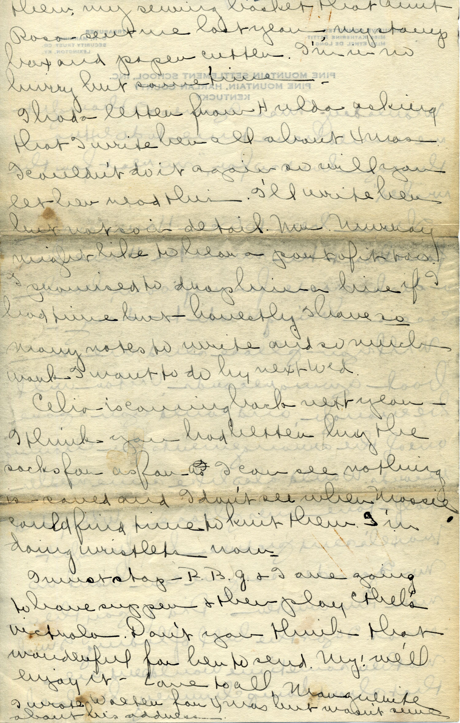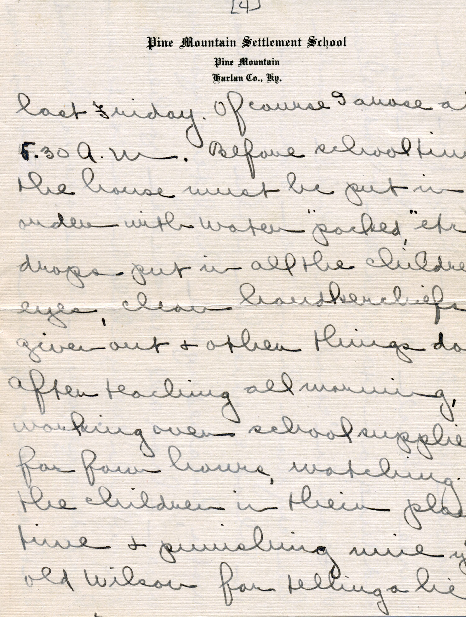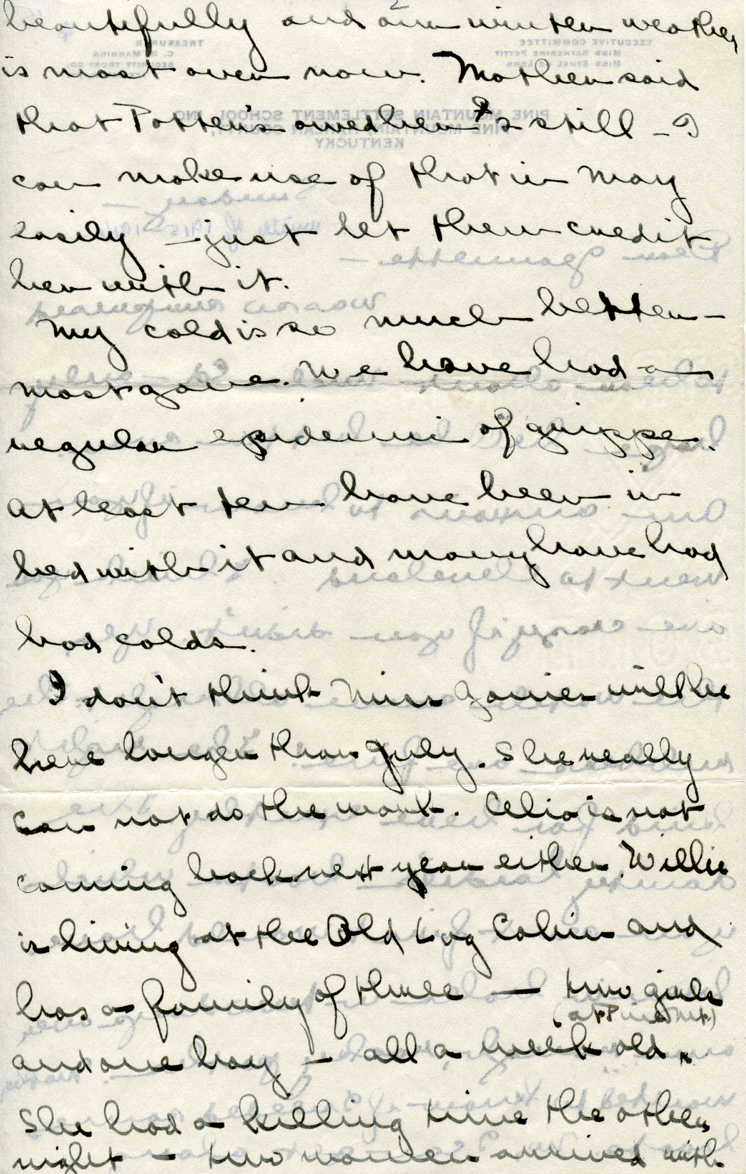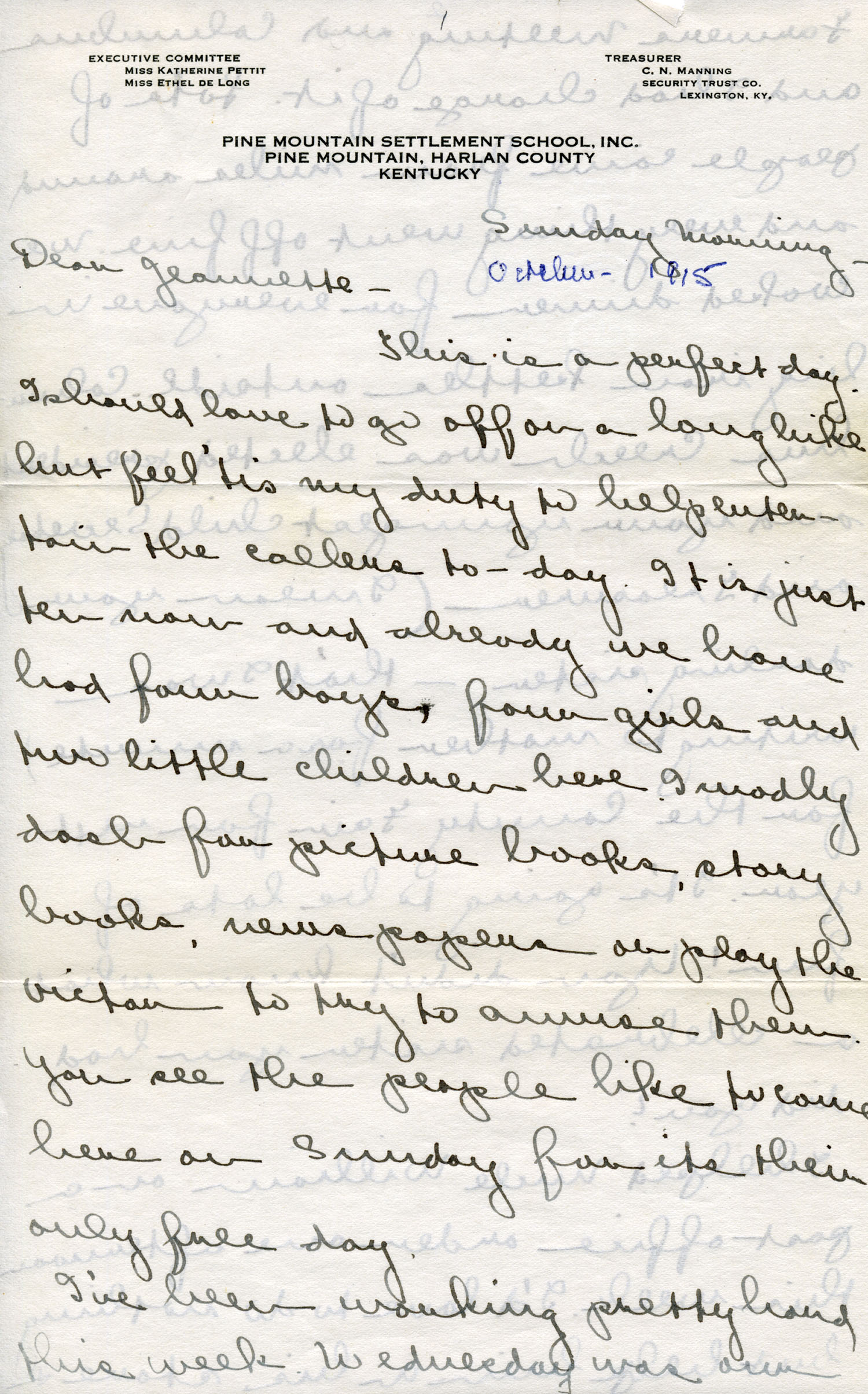 Dear Jeannette — It is just nine thirty and every bit of the housework is done. The children are all out playing for about a half hour until it’s time for Sunday School, so unless K. P. [Katherine Pettit] comes I’m good for a little while. I wonder if Celia called you up. She sent me a box of Mullove’s candy with a note “I wish you were here!” Even Uncle William thought she might have gone to some other place besides Cincinnati. He didn’t think it was quite right. Miss Gaines and I are to leave Thursday morning, reaching Cumberland Gap about six that night. Celia joins us there about noon on Friday. I haven’t been across Pine Mt. since January 4th so am looking forward to the trip. We’ll be back Sunday. Mrs. Light [Mrs. Ella Sue Light, housemother] is taking my children in school for two days and I guess K. P. will have to take the house.