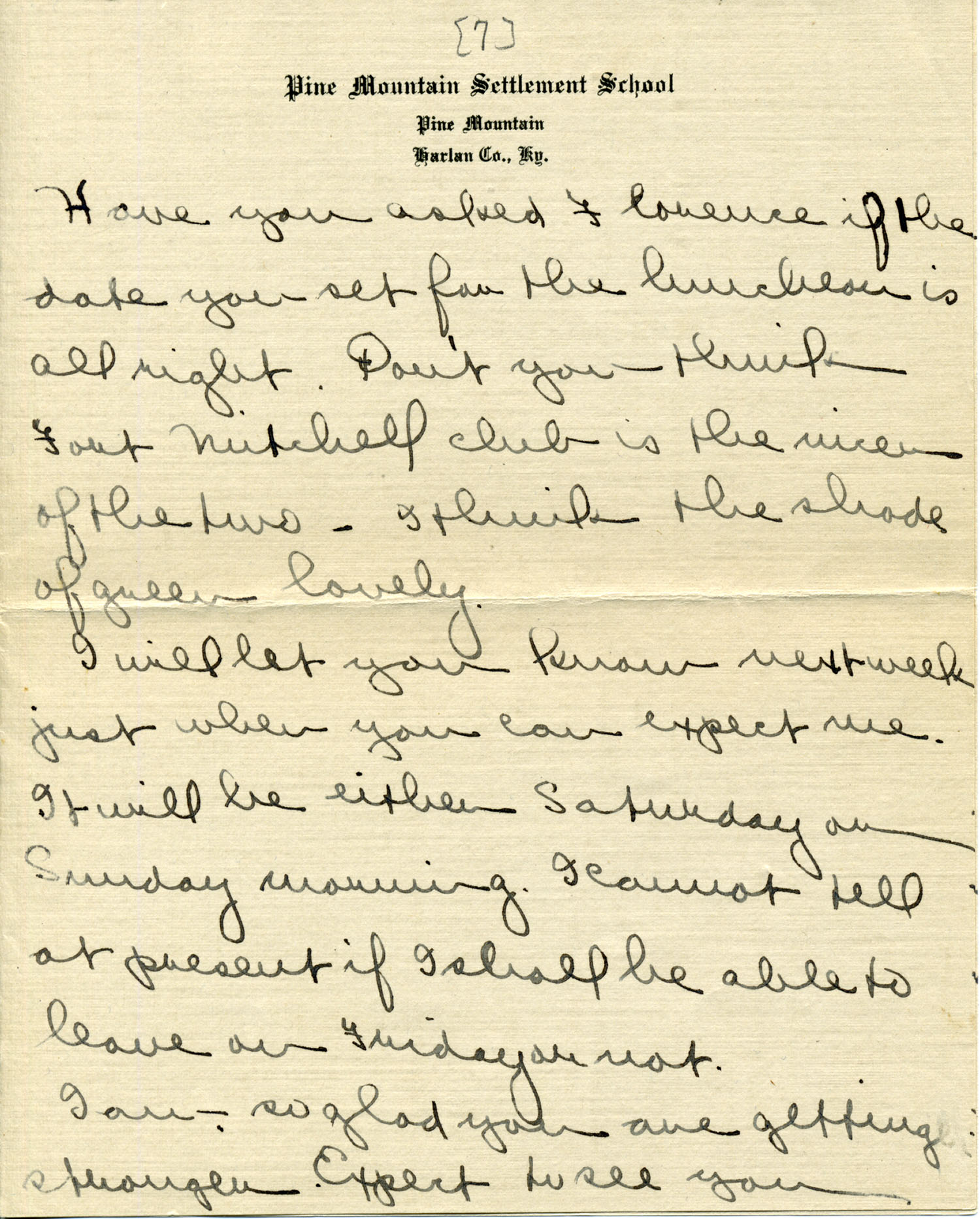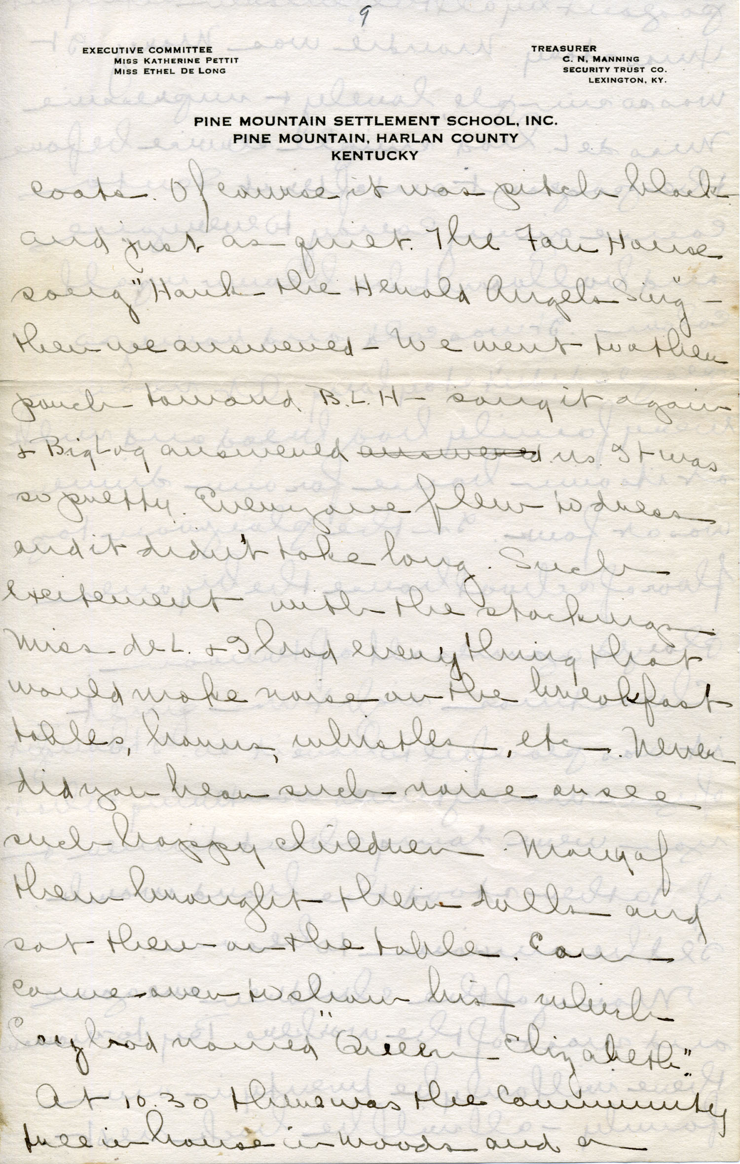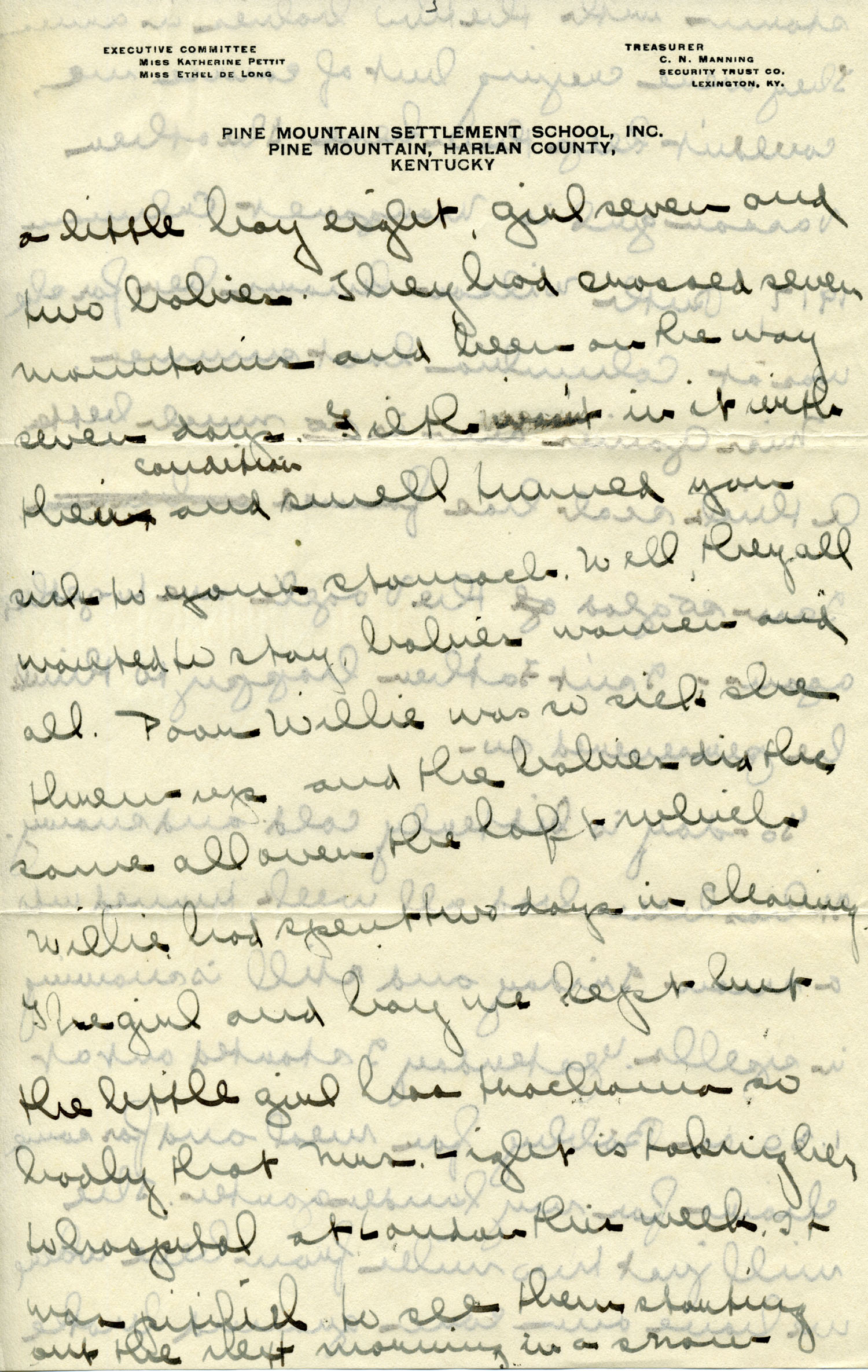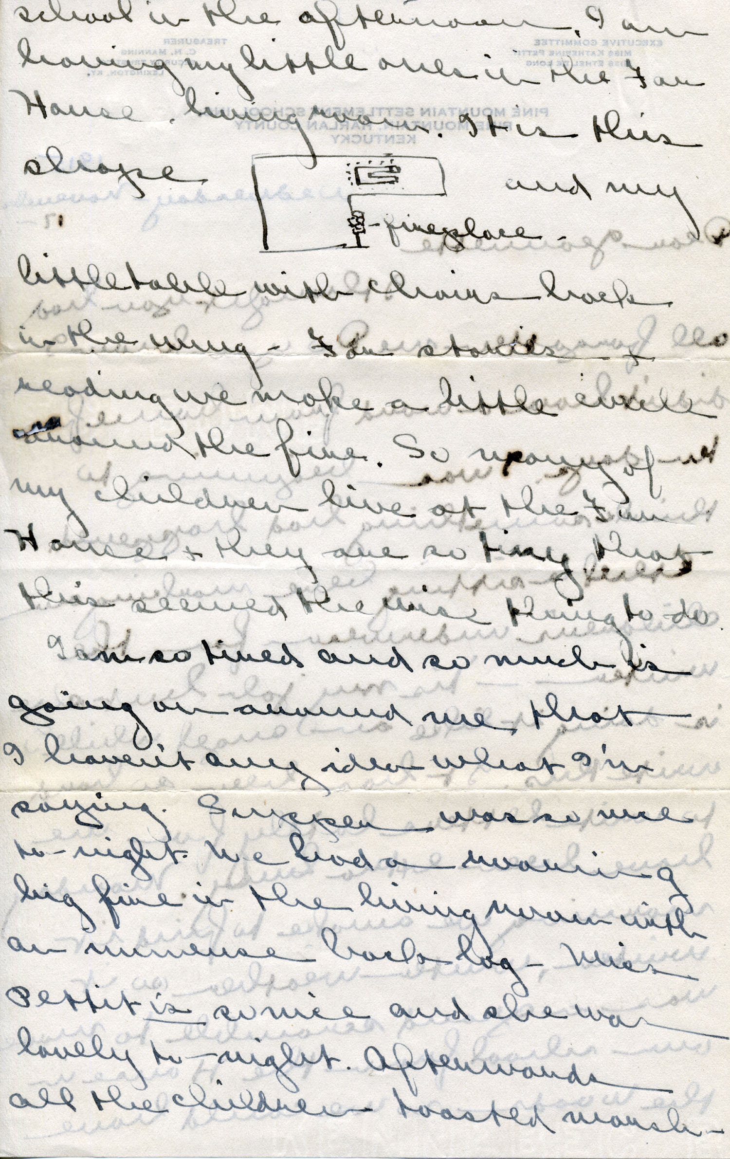 Dear Jeannette — It is just nine thirty and every bit of the housework is done. The children are all out playing for about a half hour until it’s time for Sunday School, so unless K. P. [Katherine Pettit] comes I’m good for a little while. I wonder if Celia called you up. She sent me a box of Mullove’s candy with a note “I wish you were here!” Even Uncle William thought she might have gone to some other place besides Cincinnati. He didn’t think it was quite right. Miss Gaines and I are to leave Thursday morning, reaching Cumberland Gap about six that night. Celia joins us there about noon on Friday. I haven’t been across Pine Mt. since January 4th so am looking forward to the trip. We’ll be back Sunday. Mrs. Light [Mrs. Ella Sue Light, housemother] is taking my children in school for two days and I guess K. P. will have to take the house.