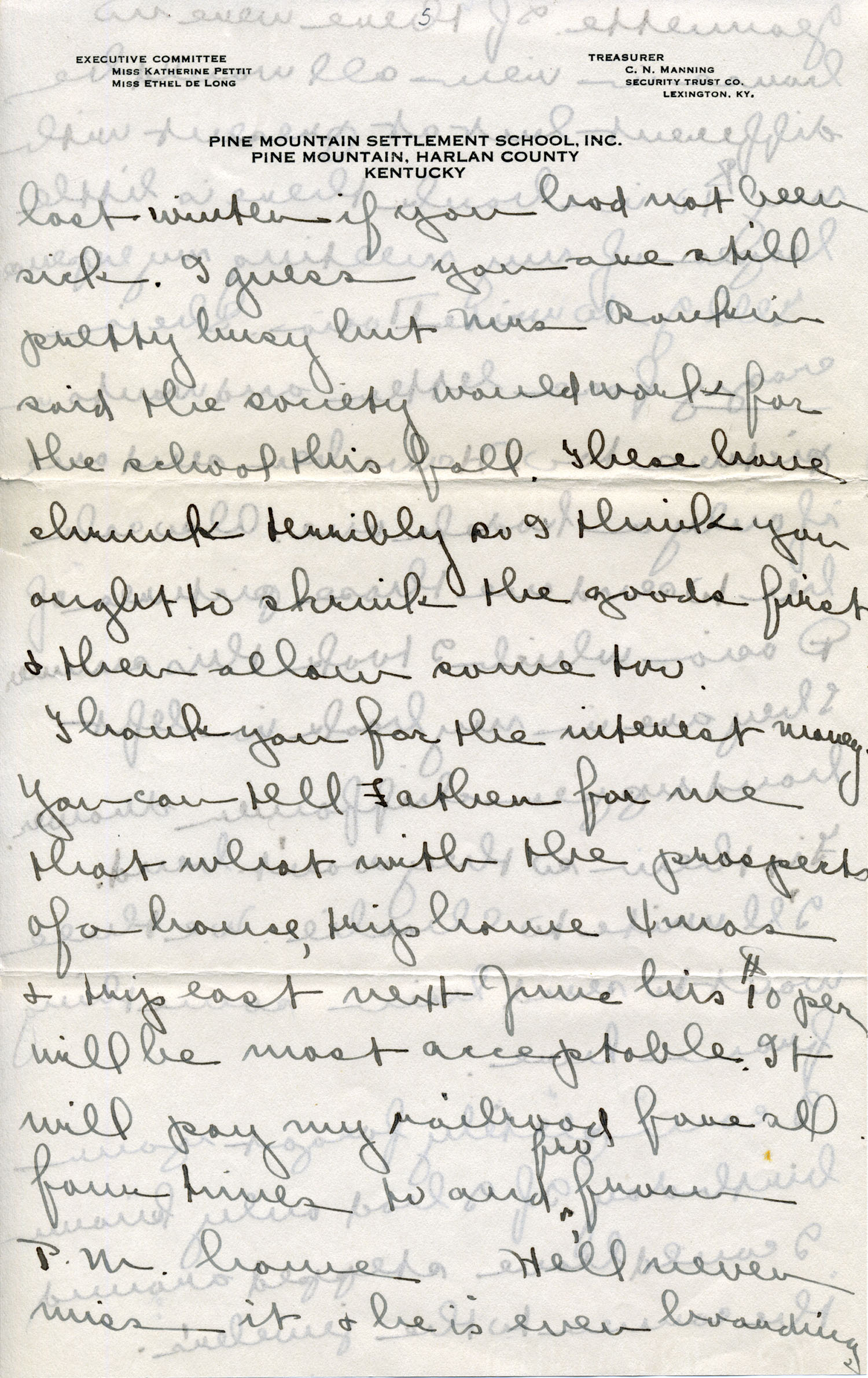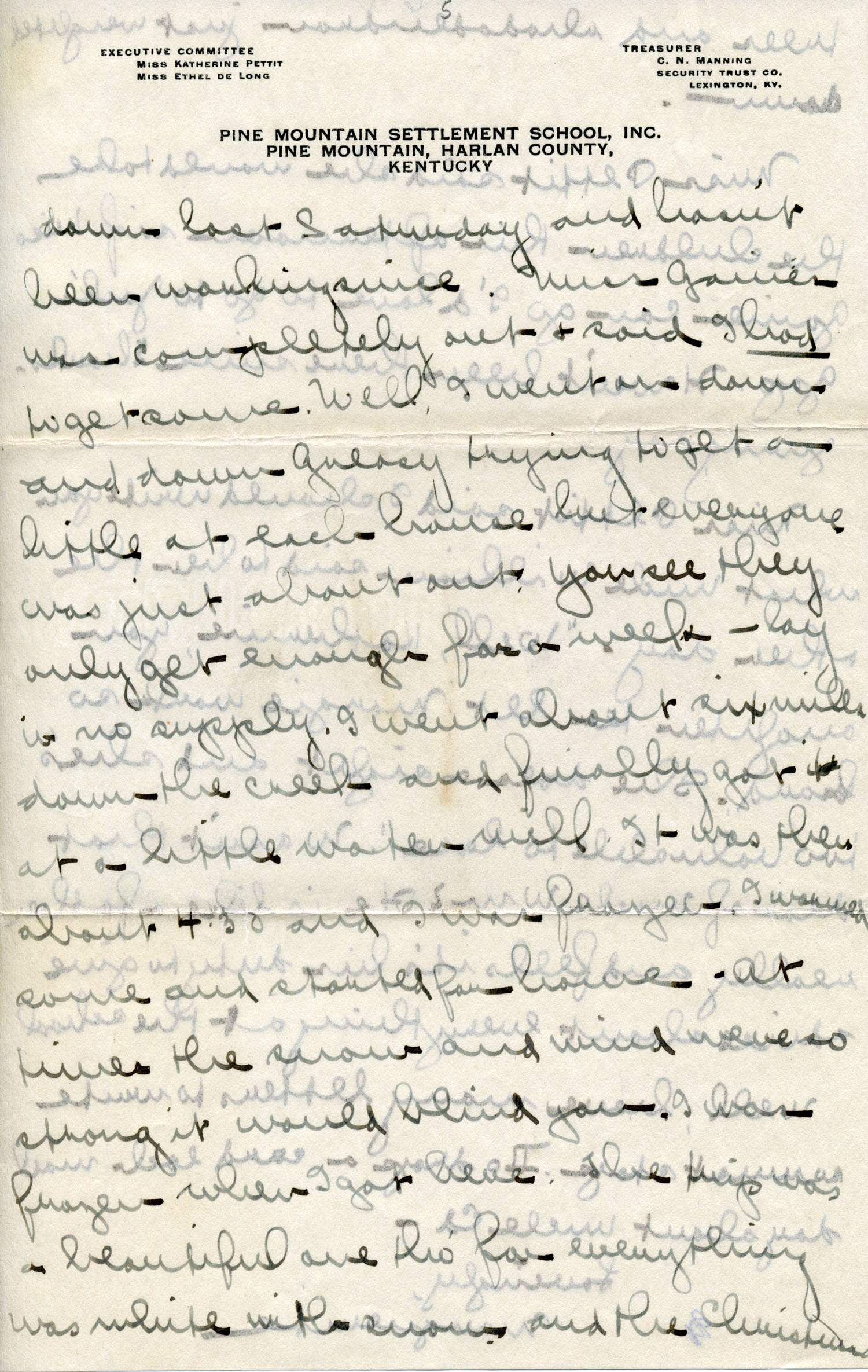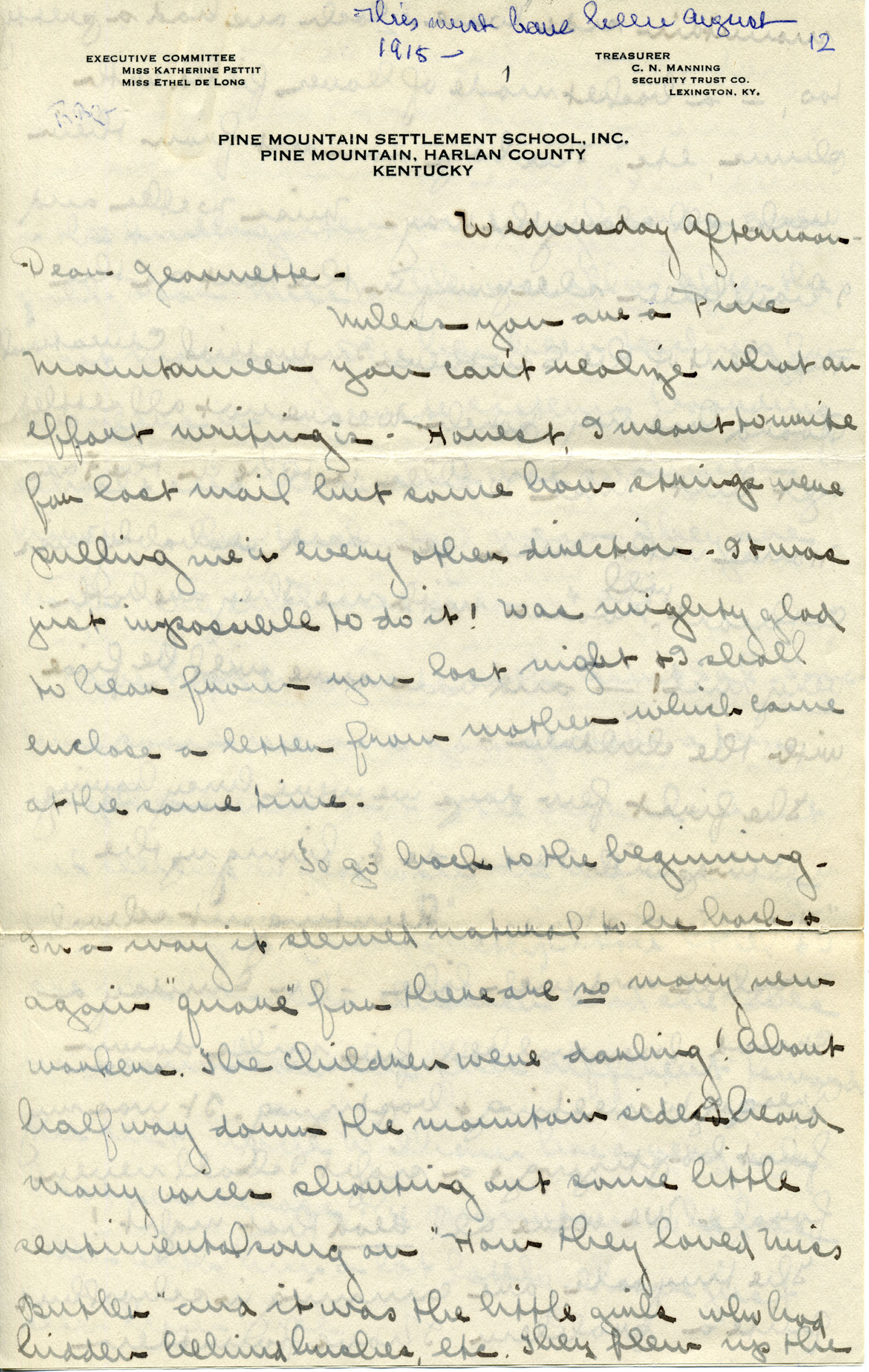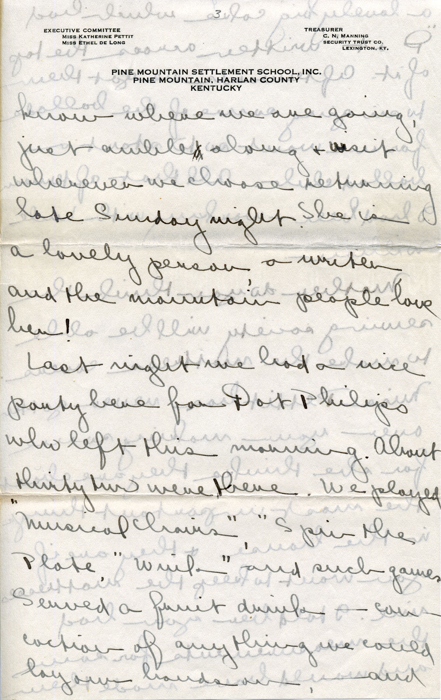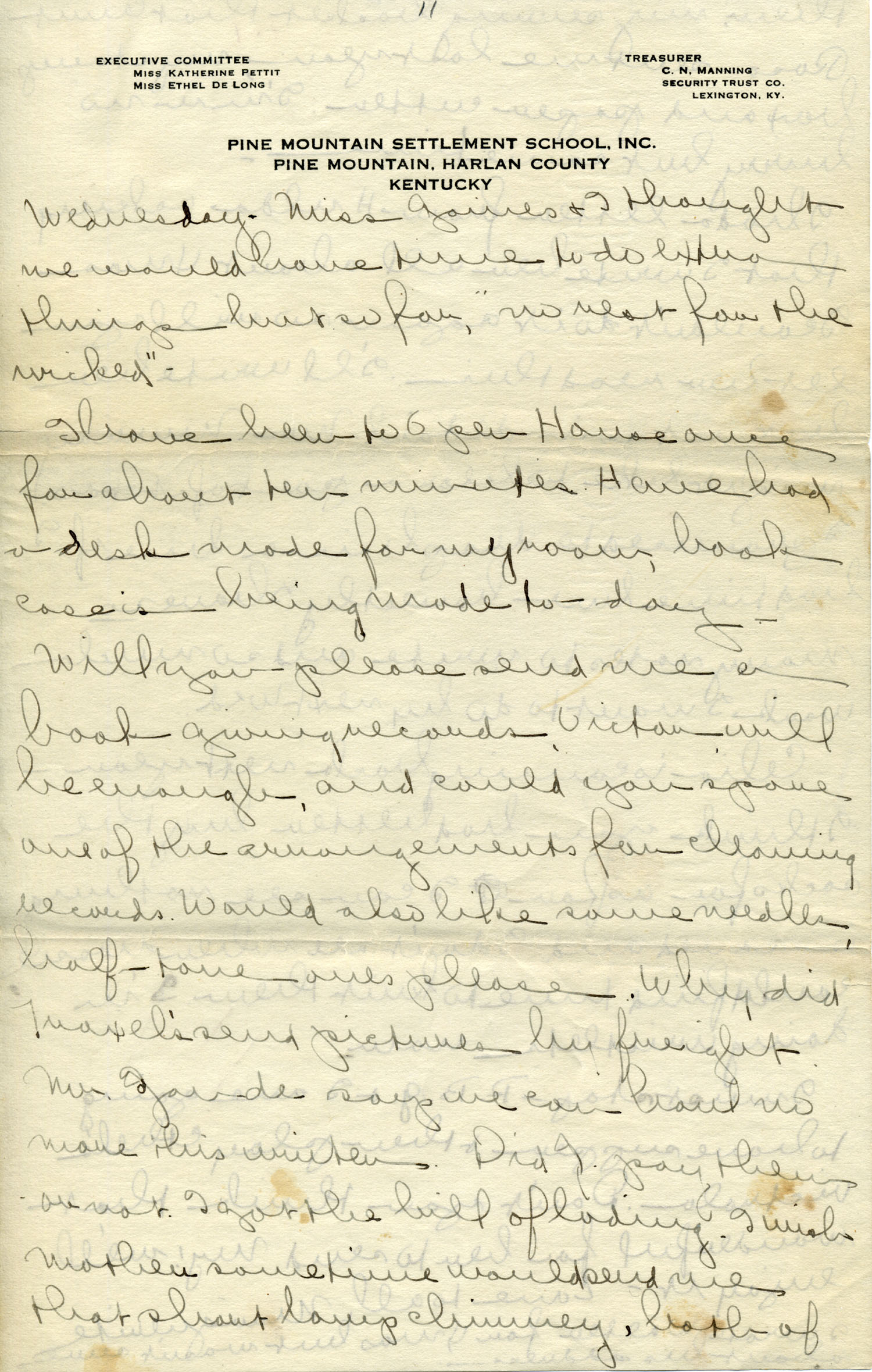 Dear Jeannette — It is just nine thirty and every bit of the housework is done. The children are all out playing for about a half hour until it’s time for Sunday School, so unless K. P. [Katherine Pettit] comes I’m good for a little while. I wonder if Celia called you up. She sent me a box of Mullove’s candy with a note “I wish you were here!” Even Uncle William thought she might have gone to some other place besides Cincinnati. He didn’t think it was quite right. Miss Gaines and I are to leave Thursday morning, reaching Cumberland Gap about six that night. Celia joins us there about noon on Friday. I haven’t been across Pine Mt. since January 4th so am looking forward to the trip. We’ll be back Sunday. Mrs. Light [Mrs. Ella Sue Light, housemother] is taking my children in school for two days and I guess K. P. will have to take the house.