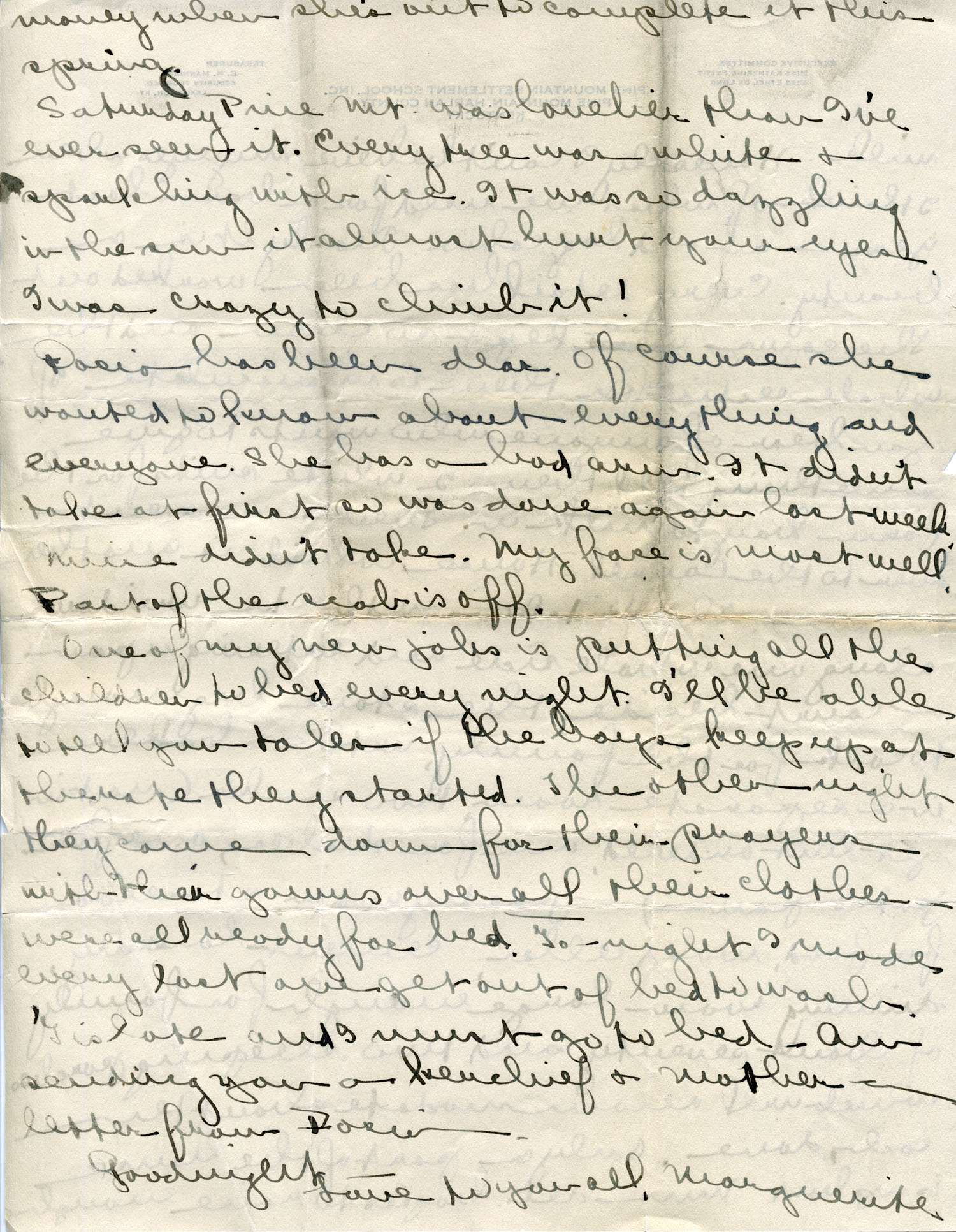 Dear Family — I hardly know to whom to write so shall make it a purely family letter. As the box of food was opened first I shall begin there. Everything was lovely but nothing could come up to that steak! Friday night after the children were all tucked in bed Miss [Ruth] Gaines, Peg, Margaret Rothary [teacher], Eve Newman [Secretary] and I had a grand supper cooking the steak before the living room fire. We couldn’t bear the thought of frying it so broiled on a home-made arrangement right on top of the hot coals. Nothing less than a moving picture could do justice to the scene – but it would have to include sounds too. Honestly we all sat there giving cheers to John Butler – they did mostly between great mouthfuls of it — never did anything ever taste so good. If you only knew, Father, the many nice things said about you. Miss Gaines insists your name has to go down in “Who’s Who.” I never heard such yells and cheers. I am sure we vied with a national baseball game. I recommend everyone a year in the mountains so they will appreciate food. However we have plenty of eggs now. They come in by the nice dozens so we have them nearly every morning.