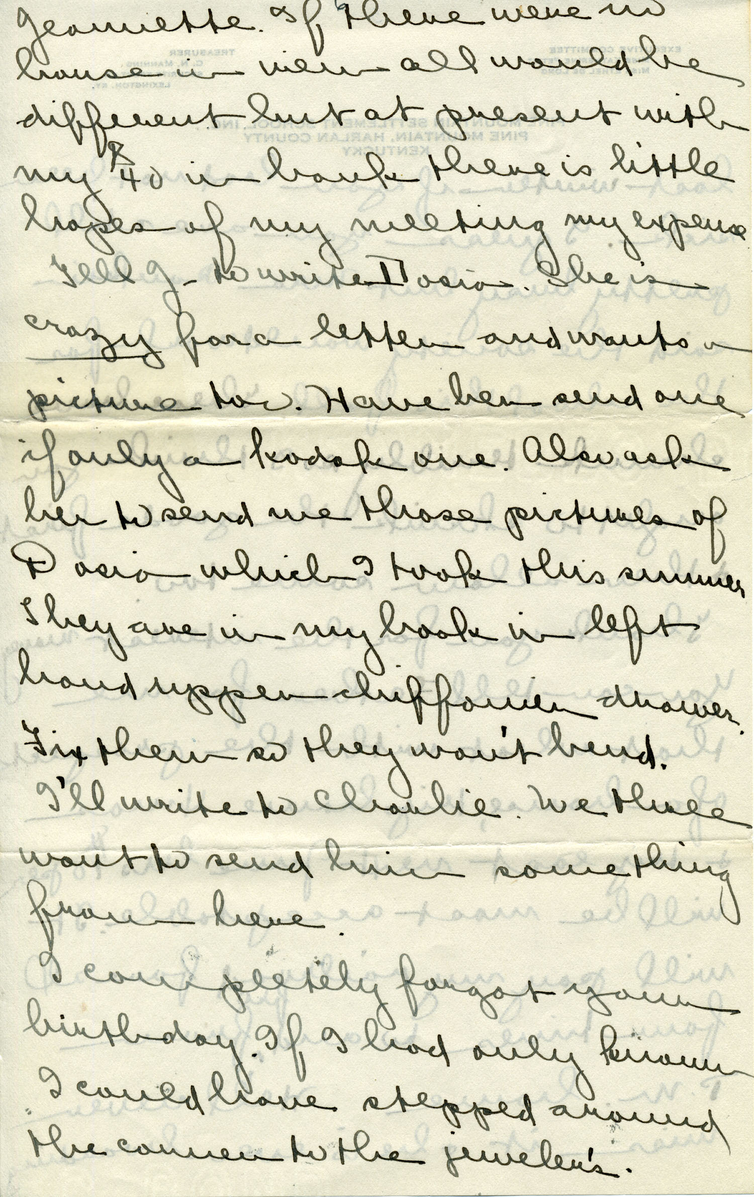 Tell J[eannette] to write to Docia. She is crazy for a letter and wants a picture too. Have her send one, if only a Kodak one. Also ask her to send me those pictures of Docia which we took this summer. They are in my book in left hand upper chiffonier drawer. Fix them so they won’t bend. I’ll write to Charlie. We three want to send him something from here.