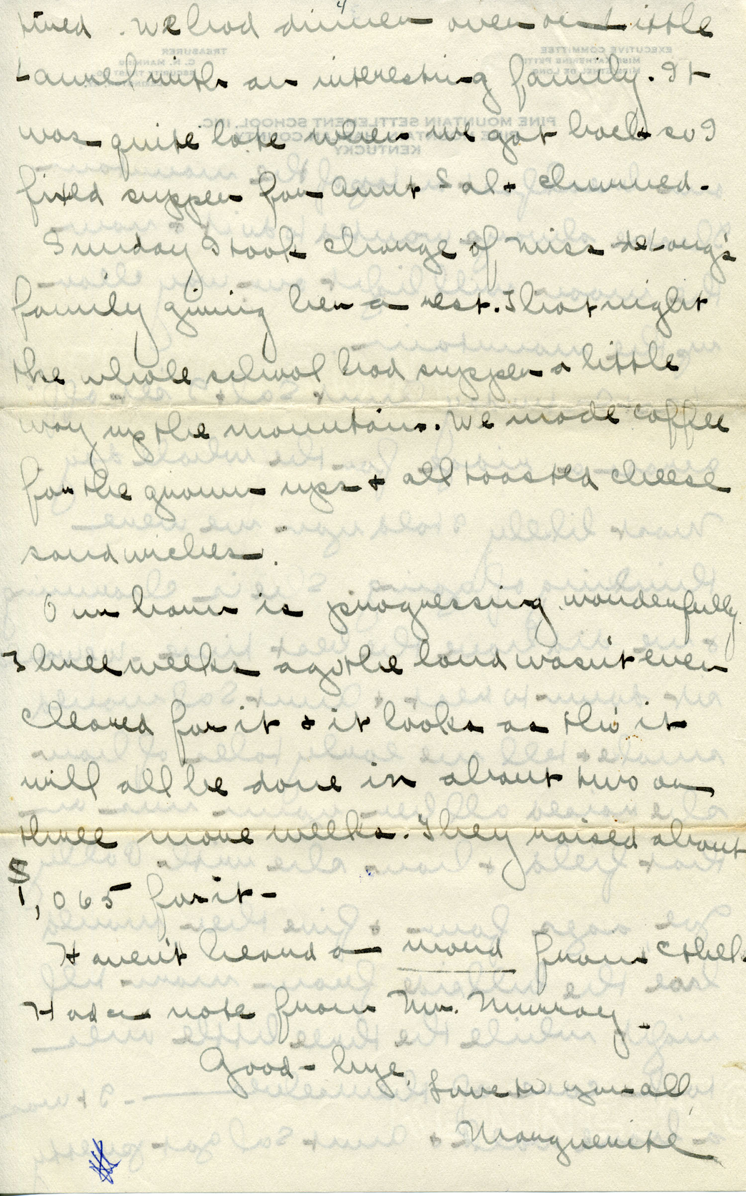 Last Saturday [Dorothy] ‘Dot’ Philips and I walked across the mountain and took the train for Harlan. Miss Gaines came in Sunday morning and we went over to meet her. Really had a lovely time shopping for everyone at the school, seeing the county superintendent of schools, judge and all high mucky mucks for Miss Pettit, etc. We feasted, stuffed ice cream, went to the movies and reveled in two hot baths. Two of the older boys of the school walked over Saturday night clear to Harlan — eighteen miles — reaching there at eleven o’clock. After a day’s work on the farm they started out at six P.M. Miss Gaines looks very rested and she was eager to get back. I never experienced a hotter walk than ours was Sunday over the mountain. We had lots of