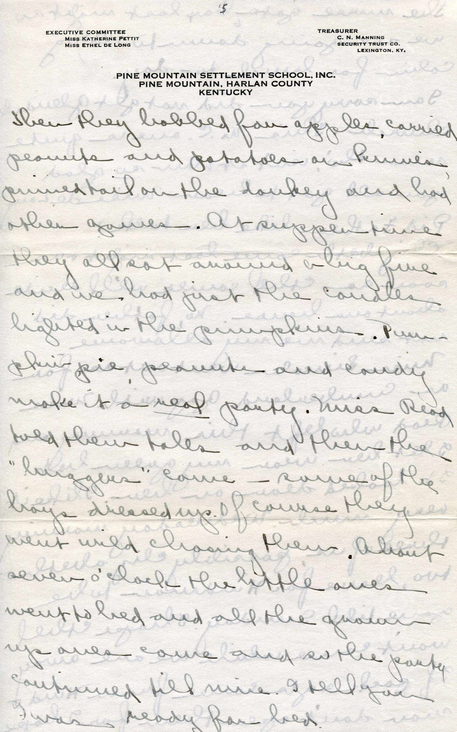 Perfect day ; Farmer’s Meeting with Columbus Creech ; helped Uncle William with Post Office management ; Elizabeth Goodale Read and Marguerite have supper with Delia ; Halloween party in new Far House living room ; Uncle William’s birthday ; Miss Lincoln and Elizabeth Goodale Read to Cumberland Gap ; trip to Hindman ; Miss Read’s departure ;