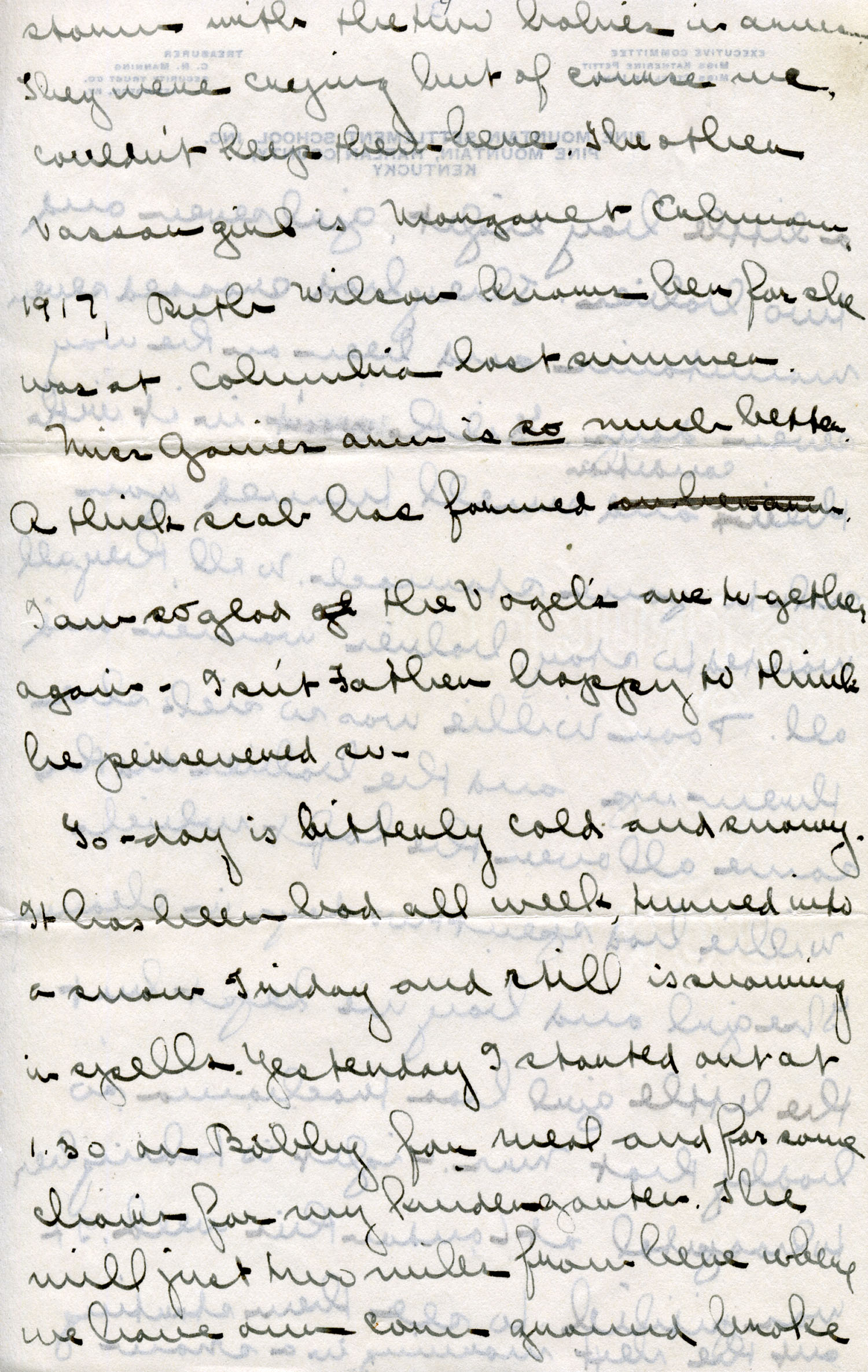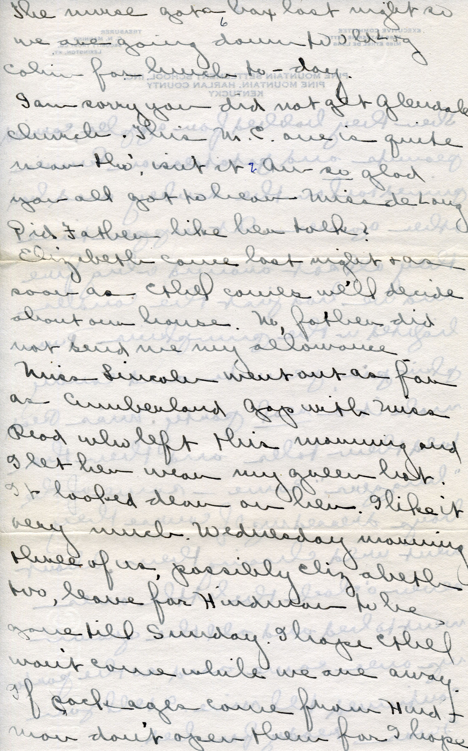 Miss Lincoln [Margaret Lincoln] went out as far as Cumberland Gap with Miss Read who left this morning and I let her wear my green hat. It looked dear on her. I like it very much. Wednesday morning three of us, possibly Elizabeth too, leave for Hindman to be gone till Sunday. I hope Ethel won’t come while we’re away. If packages come from Hindman don’t open them for I hope to do some Christmas shopping there. Put them up in the storeroom.