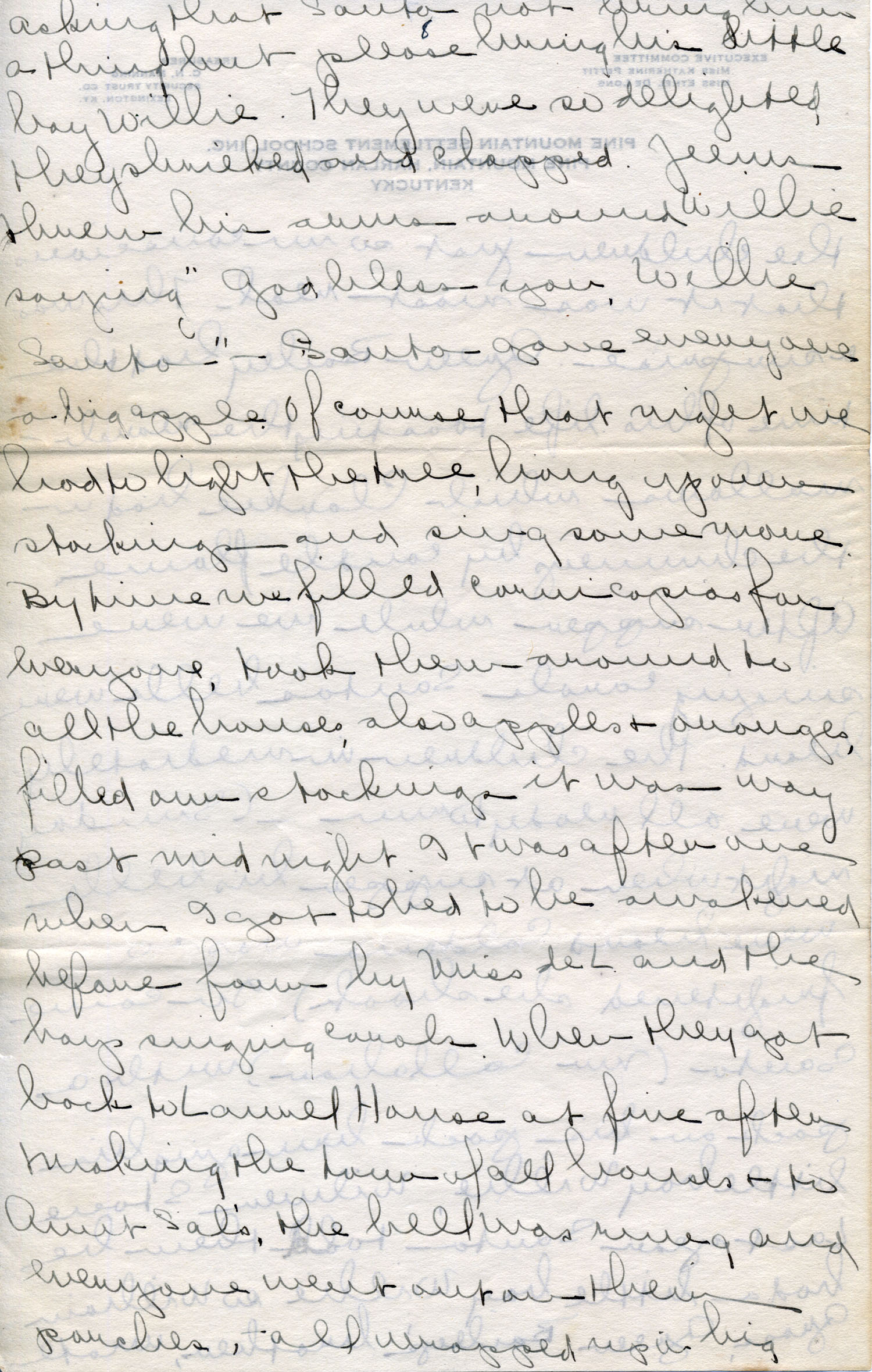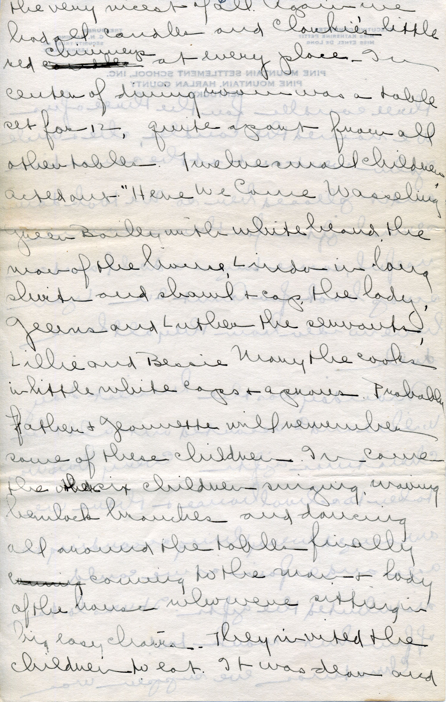 Christmas eve supper was the very nicest of all. Again we had all candles and Clarkie’s little red chimneys at every place. In center of the dining room was a table set for 12, quite apart from all other tables. Twelve small children acted out “Here We Come Wassaling,” Green Bailey [Gross] with white beard the man of the house, Linda in long skirts and shawl and cap the lady, J_______ i and Luther the servants, Lillie and Bessie Mary the cooks in little white caps and aprons. Probably Father and Jeannette will remember some of these children. In came the other six children singing, waving hemlock branches and dancing all around the tables, finally coming to the man and lady of the house who were sitting in big easy chairs. They invited the children to eat. It was dear and the children just so unconscious that it was most real. This was a surprise. Green Bailey had the time of his life toasting the marshmallows which Clarkie had in the chimneys by candle flame. After supper while we were singing carols Santa’s bells were heard. The children immediately were all ready to run. (Sunday night when at supper his bells were heard Coldona was so frightened she shook.) In came Santa (Mr. Callahan) with a pack on his back bringing his little boy, Willie, (Wilmen Stoere). Last year Santa told them he had a little boy Willie so William Gross, Green Bailey’s brother, wrote asking that Santa not bring him a thing but please bring his little boy Willie. They were so delighted they shrieked and clapped. Jeems threw his arms around Willie saying “God bless you, Willie Santa”. Santa gave everyone a big apple. Of course that night we had to light the tree, hang up our stockings and sing some more. By time we filled cornucopias for everyone, took them around to all the houses, also apples and oranges, filled our stockings it was way past midnight. It was after one when I got to bed, to be awakened before four by Miss de L[ong] and the boys singing carols. When they got back to Laurel House at five after making the tour of all houses and to Aunt Sal’s, the bell was rung and everyone went out on their porches, all wrapped up in big coats. Of course it was pitch black and just as quiet. The Far House sang “Hark, the Herald Angels Sing” — then we answered . We went to other porch toward Big Log House, sang it again, and Big Log answered us. It was so pretty. Everyone flew to dress and it didn’t take long. Such excitement with the stockings. Miss de L[ong] and I had everything that would make noise on the breakfast tables, horns, whistles, etc. Never did you hear such noise or see such happy children. Many of them brought their dolls and sat them on the table. Cam came over to show his which Gary had named “Queen Elizabeth.”