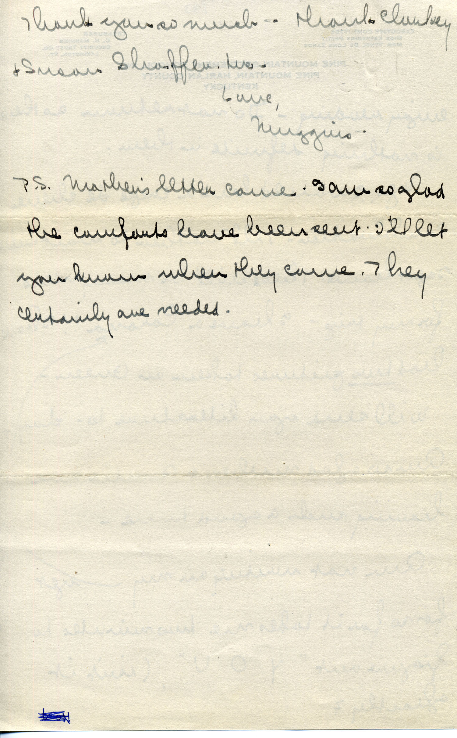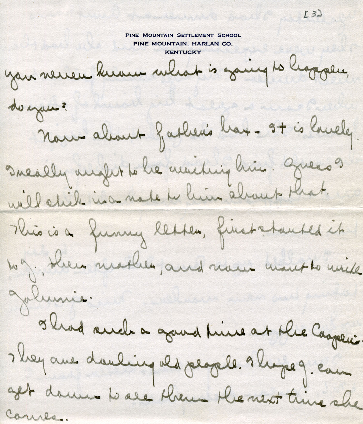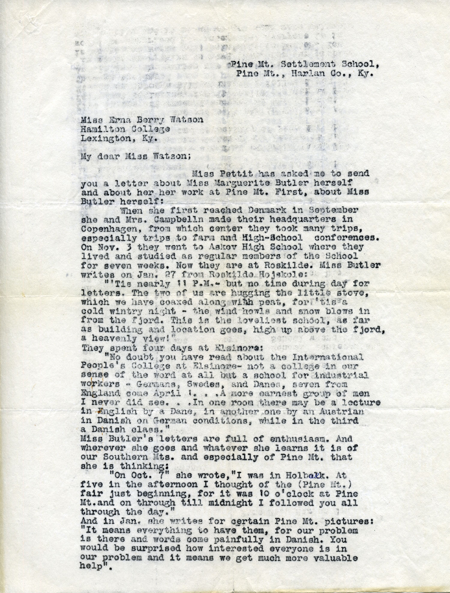 7. 1922 LETTER 7 – [no date] – typewritten letter to Miss Erna Berry Watson, Hamilton College, Lexington, Ky. from [?] – “My dear Miss Watson: Miss Pettit has asked me to send you a letter about Miss Marguerite Butler herself and about her work at Pine Mt. First, about Miss Butler herself:….” HAND-WRITTEN NOTATION at end of letter: “Thought this might interest you.” [images 027-028]