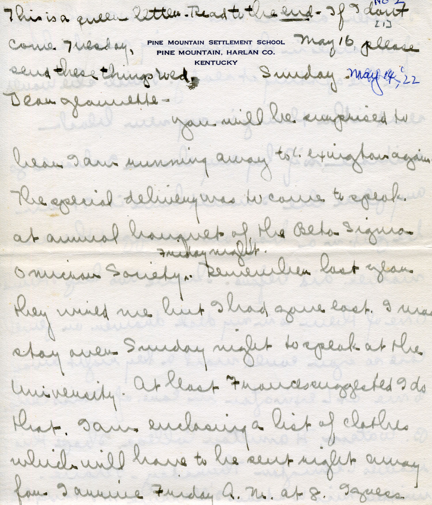 5. 1922 LETTER 5 – Sunday, May 16 (14?), 1922 – (“This is a queer letter. Read to the end. If I don’t come Tuesday, please send these things Wed.”) “Dear Jeannette — You will be surprised to hear I am running away to Lexington again…” [images 019-024]