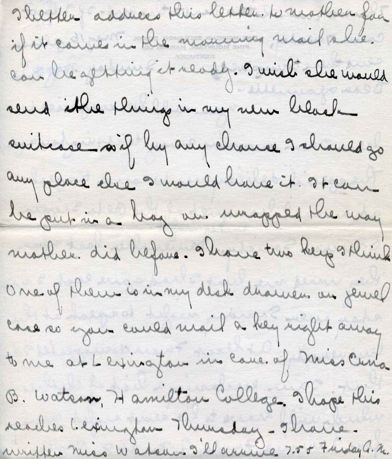 I am enclosing a list of clothes which will have to be sent right away for I arrive Friday a.m. at 8. I guess I better address this letter to Mother for if it comes in the morning mail she can be getting it ready. I wish she would send the things in my new black suitcase so if by any chance I should go anyplace else I would have it. It can be put in a bag or wrapped the way Mother did before. I have two keys I think. One of them is in my desk drawer or jewel case so you could mail a key right away to me at Lexington in care of Miss Erna B. Watson, Hamilton College. I hope this reaches Lexington Thursday. I have written Miss Watson I’ll arrive 7:55 Friday a.m. You never know what is going to happen, do you?