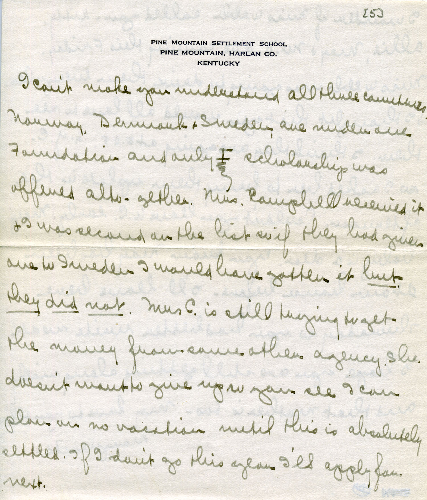 I am enclosing a card and letter from E. and M.L. You can destroy both. I can’t make you understand all three countries, Norway, Denmark & Sweden, are under one Foundation and only 1 scholarship was offered altogether. Mrs. [John C.] Campbell received it and I was second on the list so if they had given one to Sweden I would have gotten it but they did not. Mrs. C. [Campbell] is still trying to get the money from some other agency. She doesn’t want to give up so you see I can plan on no vacation until this is absolutely settled. If I don’t go this year I’ll apply for next.
