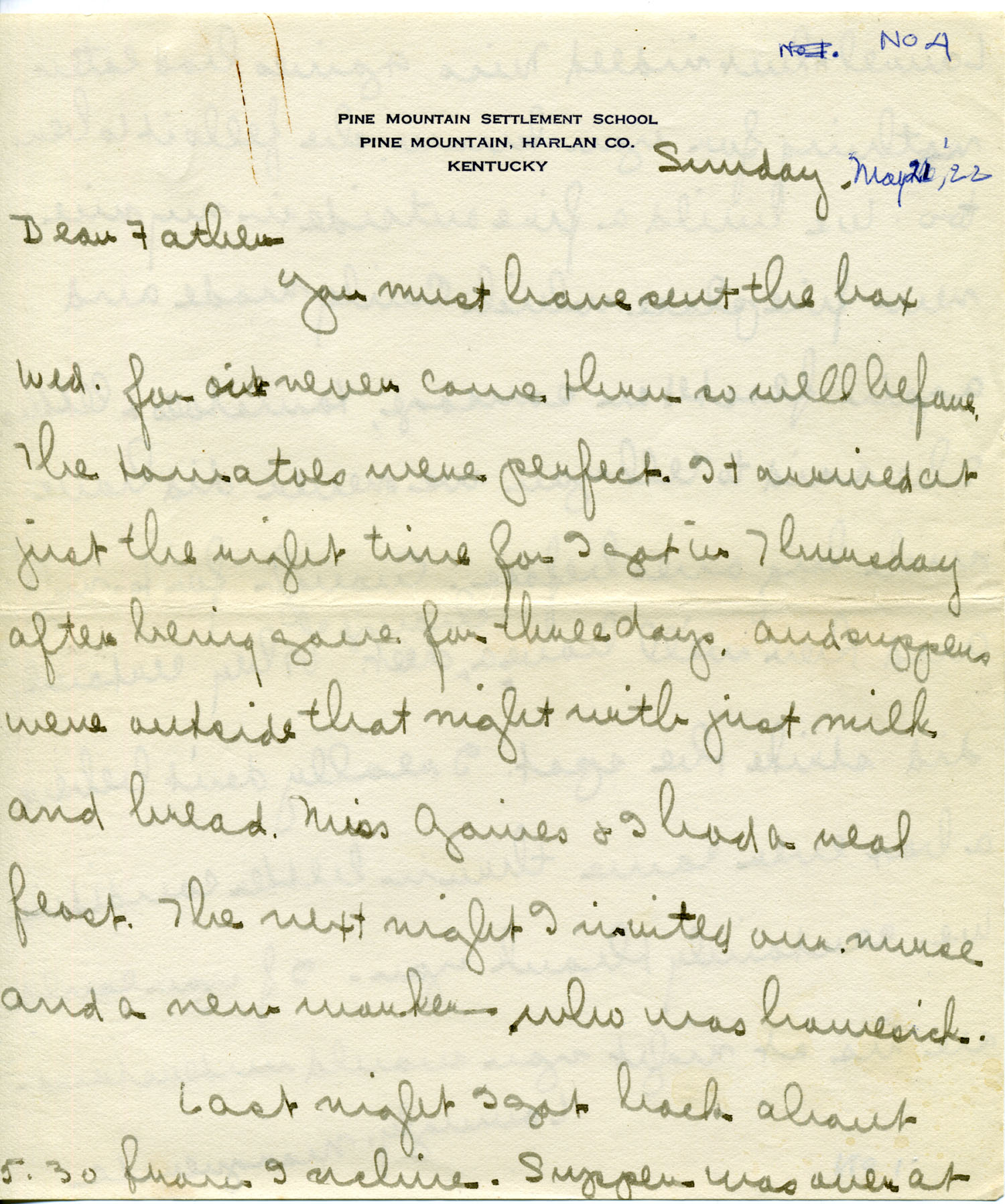 Dear Father — You must have sent the box Wednesday for it never came thru so well before. The tomatoes were perfect. It arrived at just the right time for I got in Thursday after being gone for three days, and suppers were outside that night with just milk and bread. Miss Gaines and I had a real feast. The next night I invited our nurse and a new worker who was homesick.