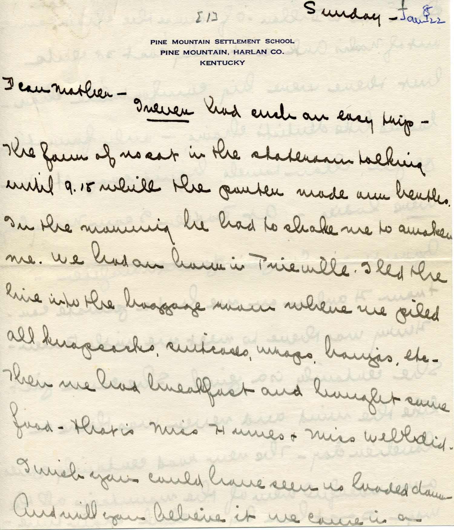 1. 1922 LETTER 1 – Sunday, January 22 – “Dear Mother — I never had such an easy trip. The four of us sat in the state room talking until 9:15 while the porter made our berths….” [images 001-005]