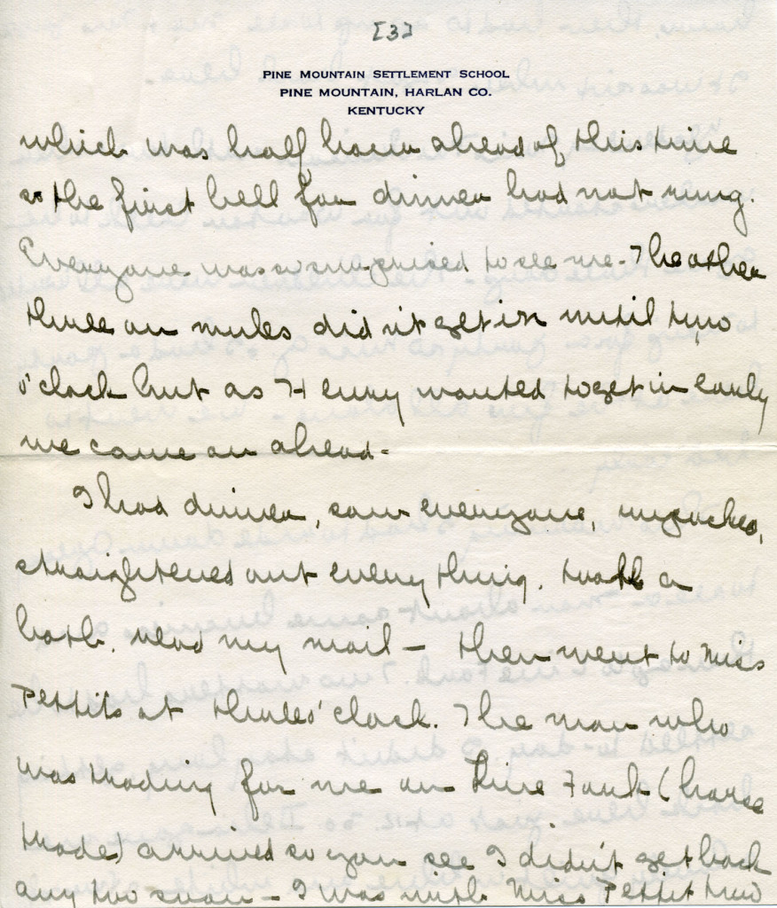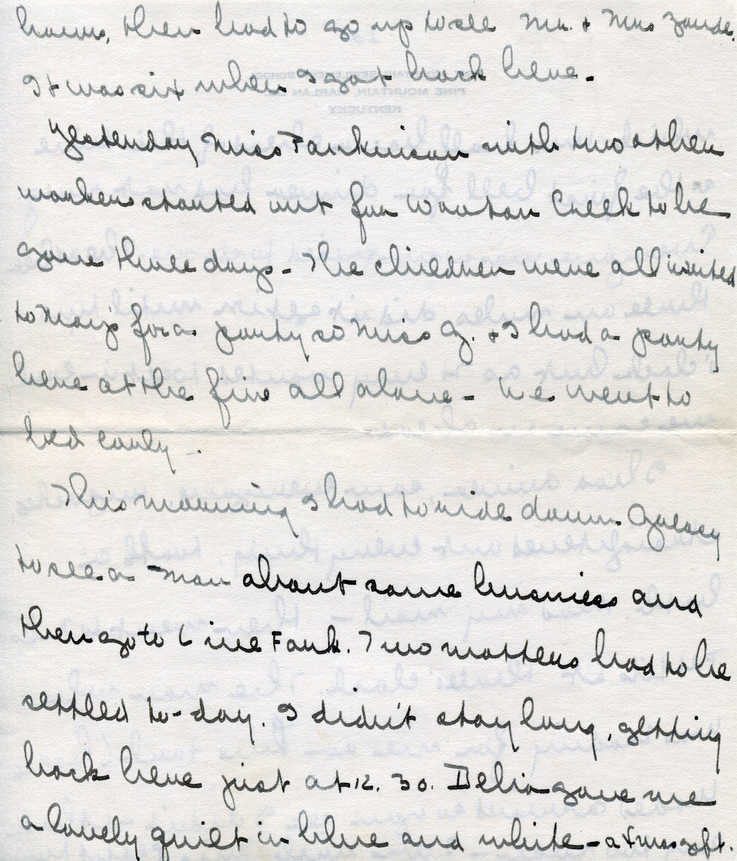 I had dinner, saw everyone, unpacked, straightened out everything, took a bath, read my mail — then went to Miss Pettit’s at three o’clock. The man who was trading for me on Line Fork (horse trade) arrived so you see I didn’t get back any too soon. I was with Miss Pettit two hours, then had to go up to see Mr. and Mrs. Zande. It was six when I got back here.