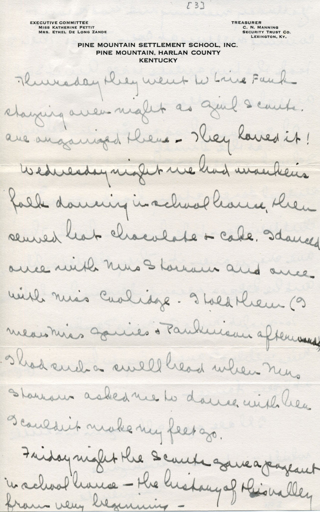 Wednesday night we had workers folk dancing in school house, then served hot chocolate and cake. I danced once with Mrs. Sharrow and once with Miss Coolidge. I told them (I mean Miss Gaines and Parkinson afterwards) I had such a swell[ed] head when Mrs. Sharrow asked me to dance with her I couldn’t make my feet go.