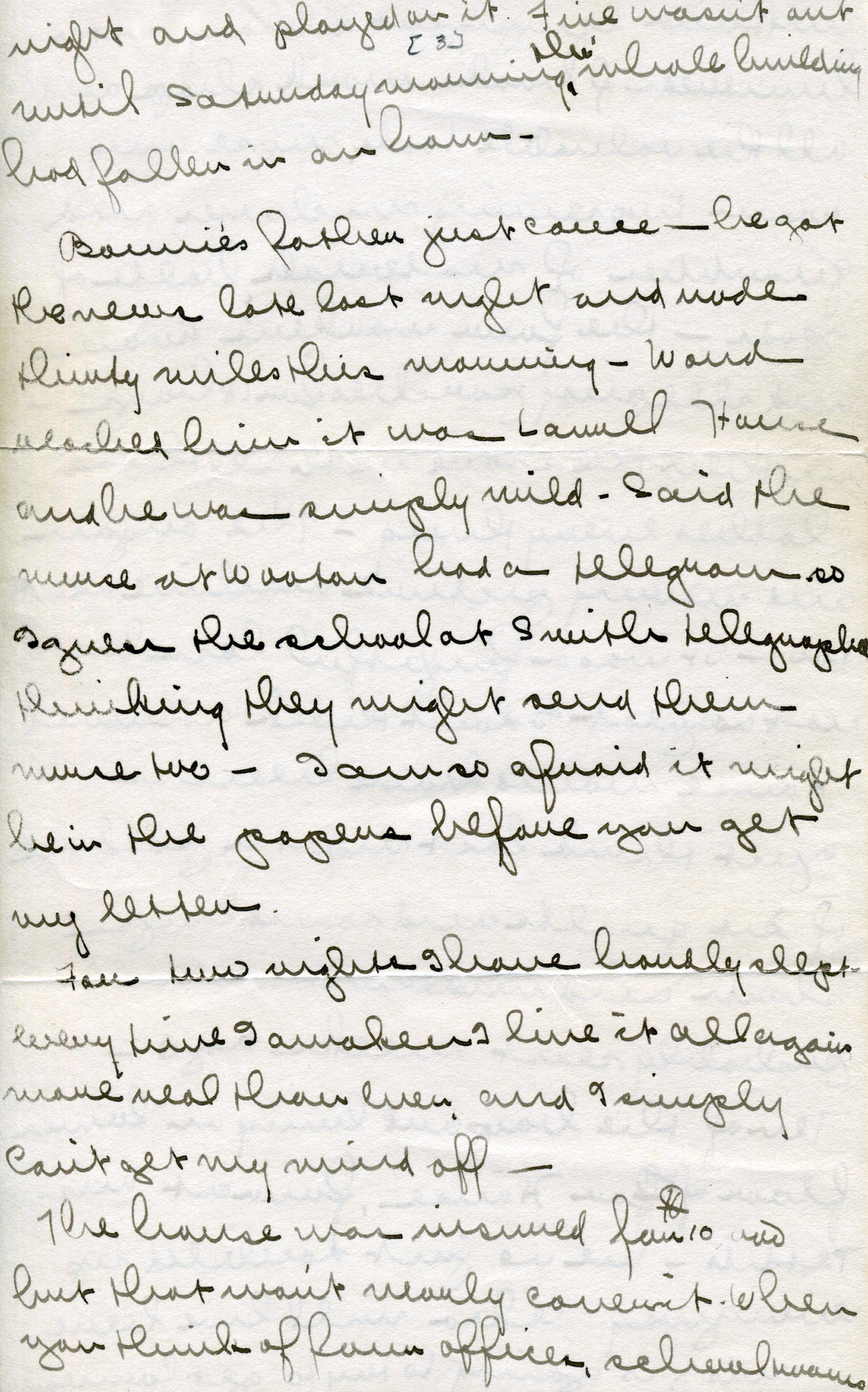 Bonnie’s father just came. He got the news late last night and made thirty miles this morning. Word reached him it was Laurel House and he was simply wild. Said the nurse at Wooton had a telegram so I guess the school at Smith telegraphed thinking they might send their nurse too. I am so afraid it might be in the papers before you get my letter.