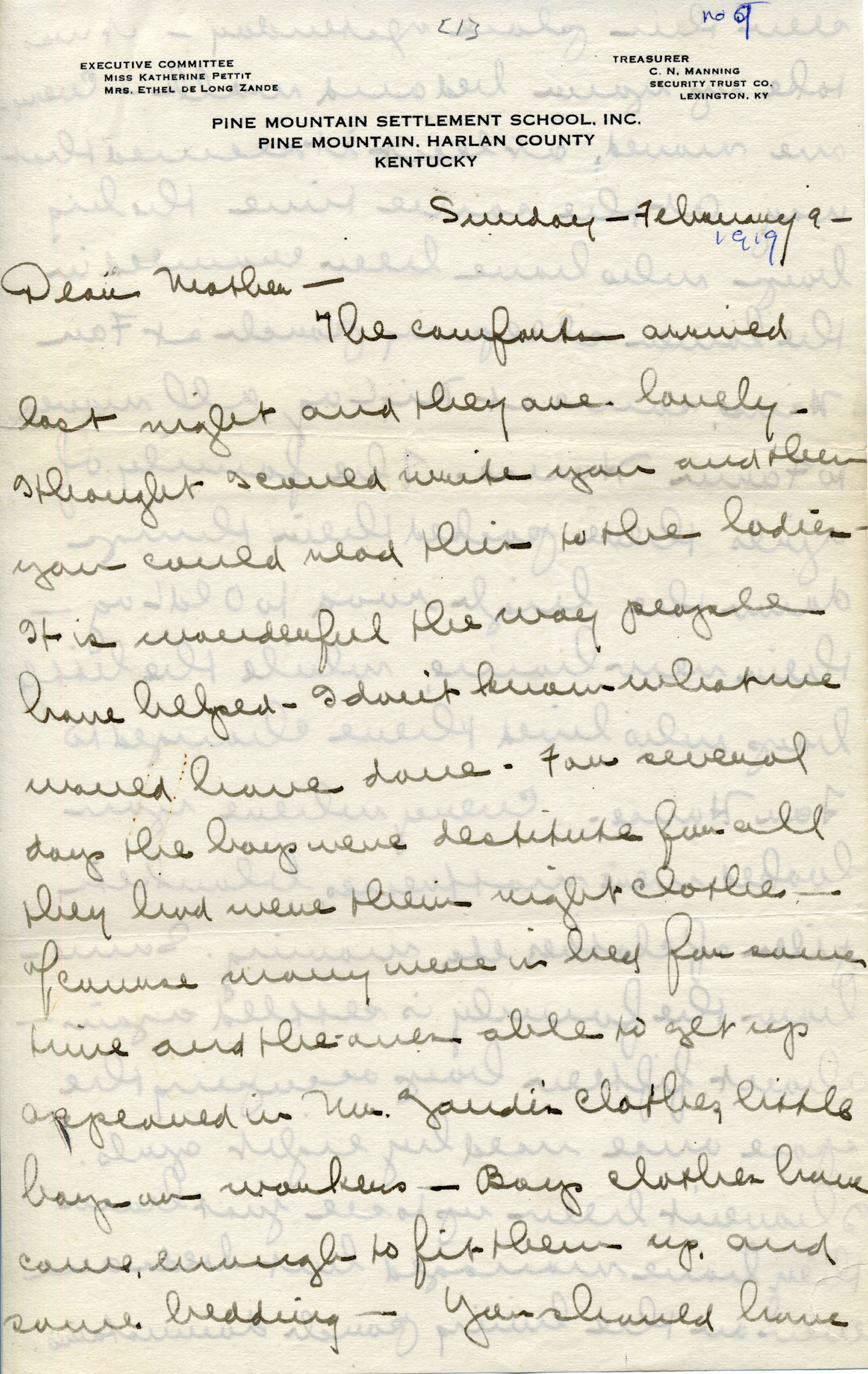 3. 1919 LETTER 3 – Sunday, February 9, 1919 – “Dear Mother — The comforts arrived last night and they are lovely. I thought I could write you and then you could read this to the ladies….” [images 009-013]