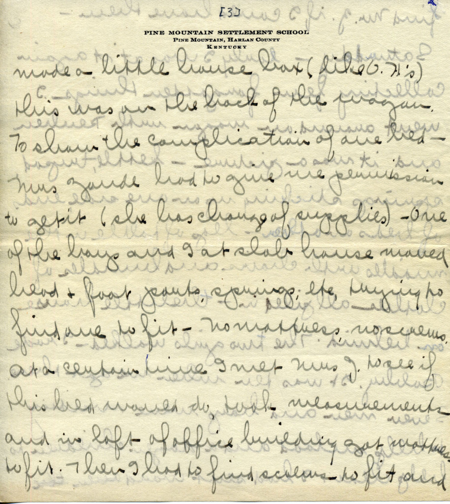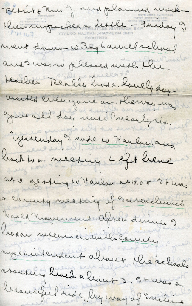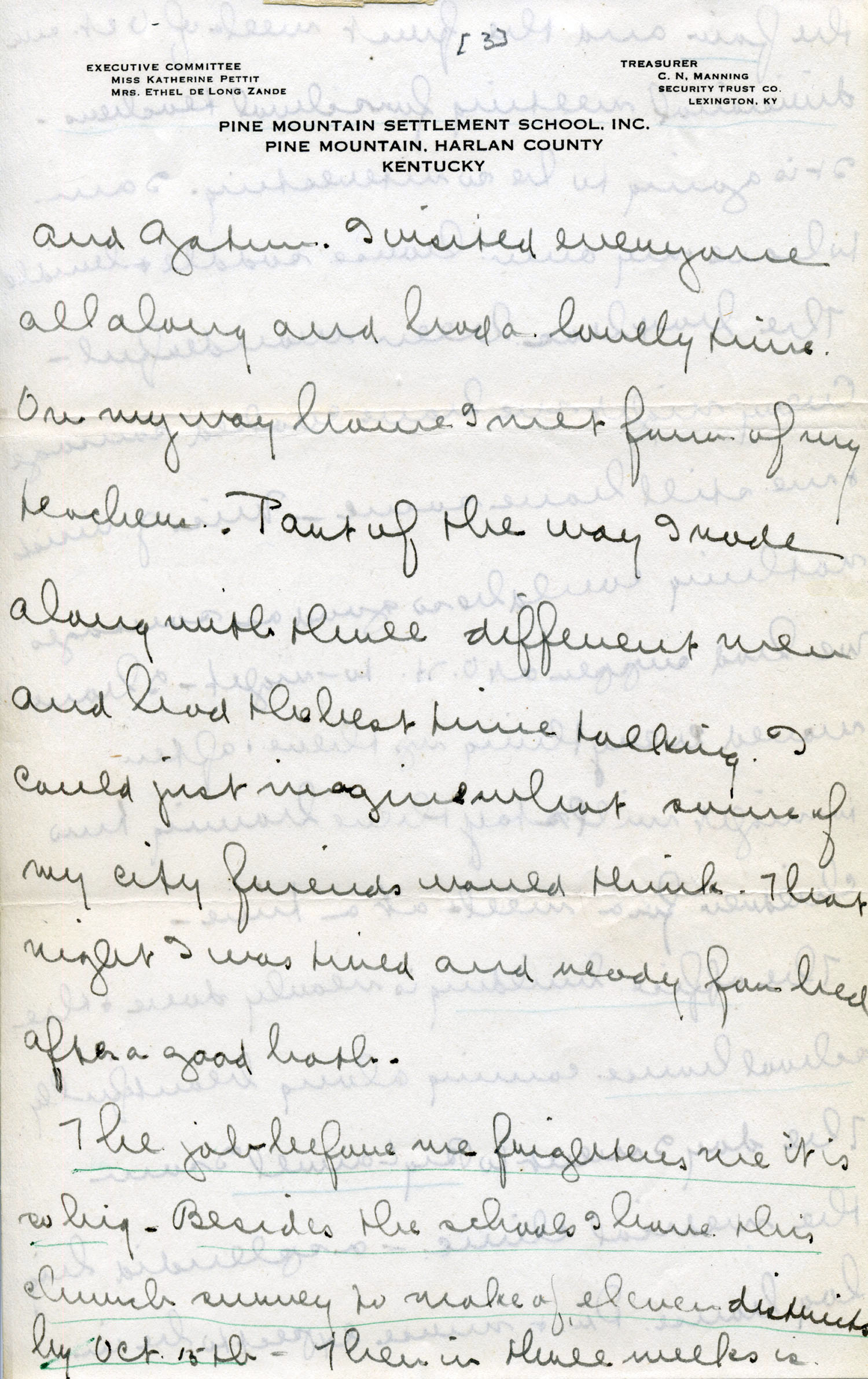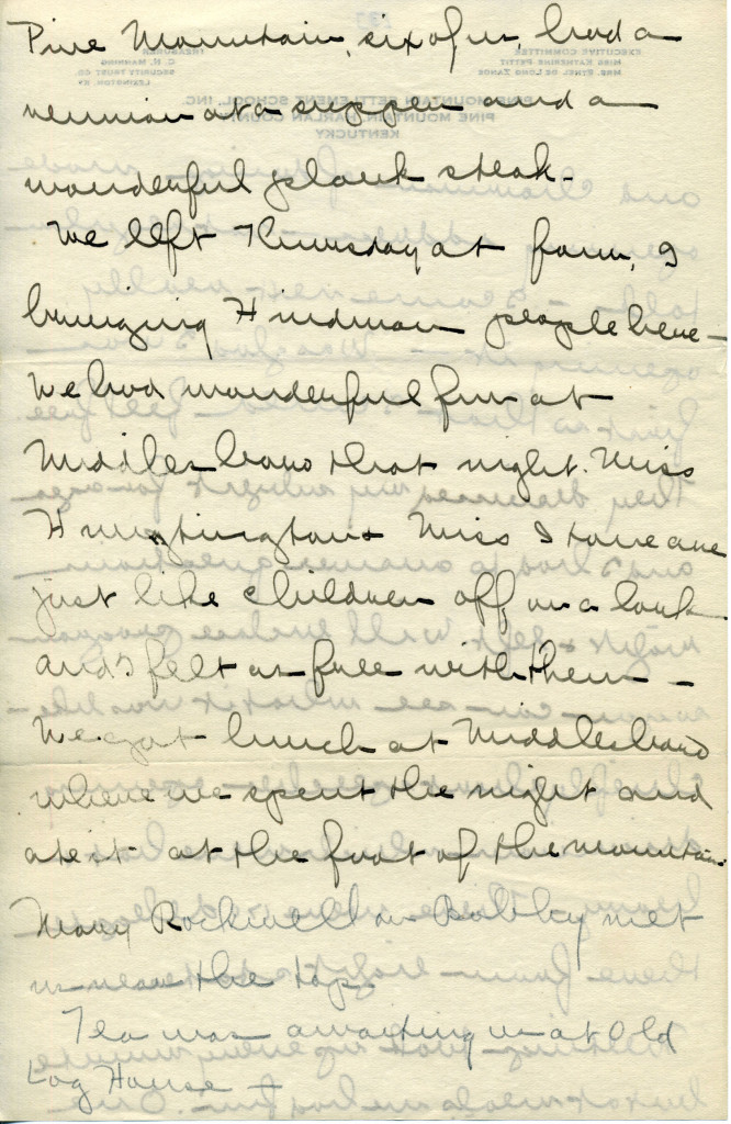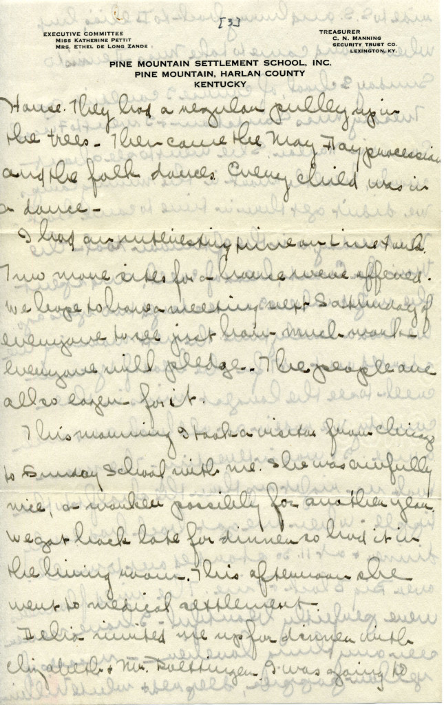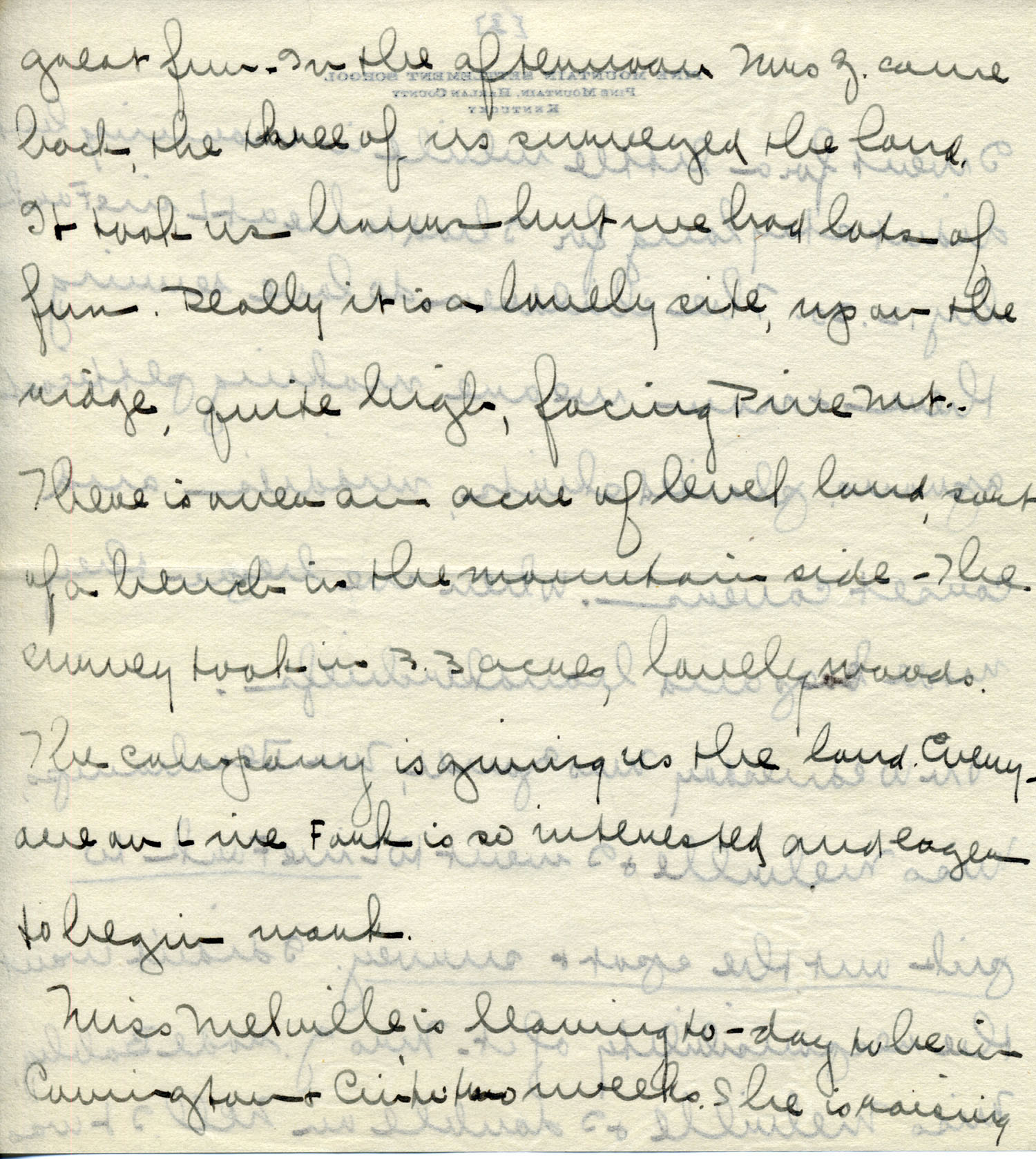 On Wednesday Mrs. Zande, Mr. [Leon] Deschamps, Miss [Angela] Melville and I went to Line Fork to pick out the spot and survey. I didn’t want the responsibility of it. Mrs. Z. rode Bobby, Miss Melville and I double on Nell. It was great fun. In the afternoon Mrs. Z. came back, the three of us surveyed the land. It took us hours but we had lots of fun. Really it is a lovely site, up on the ridge, quite high, facing Pine Mt. There is over an acre of level land, sort of a bench in the mountain side. The survey took in 3.3 acres, lovely woods. The company is giving us the land. Everyone on Line Fork is so interested and eager to begin work.