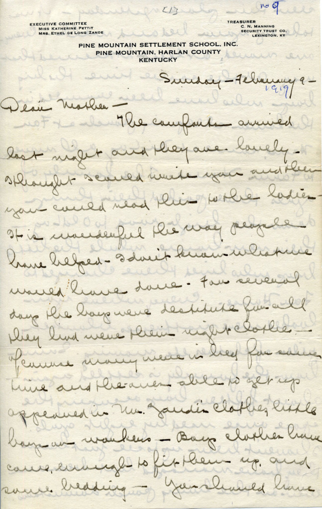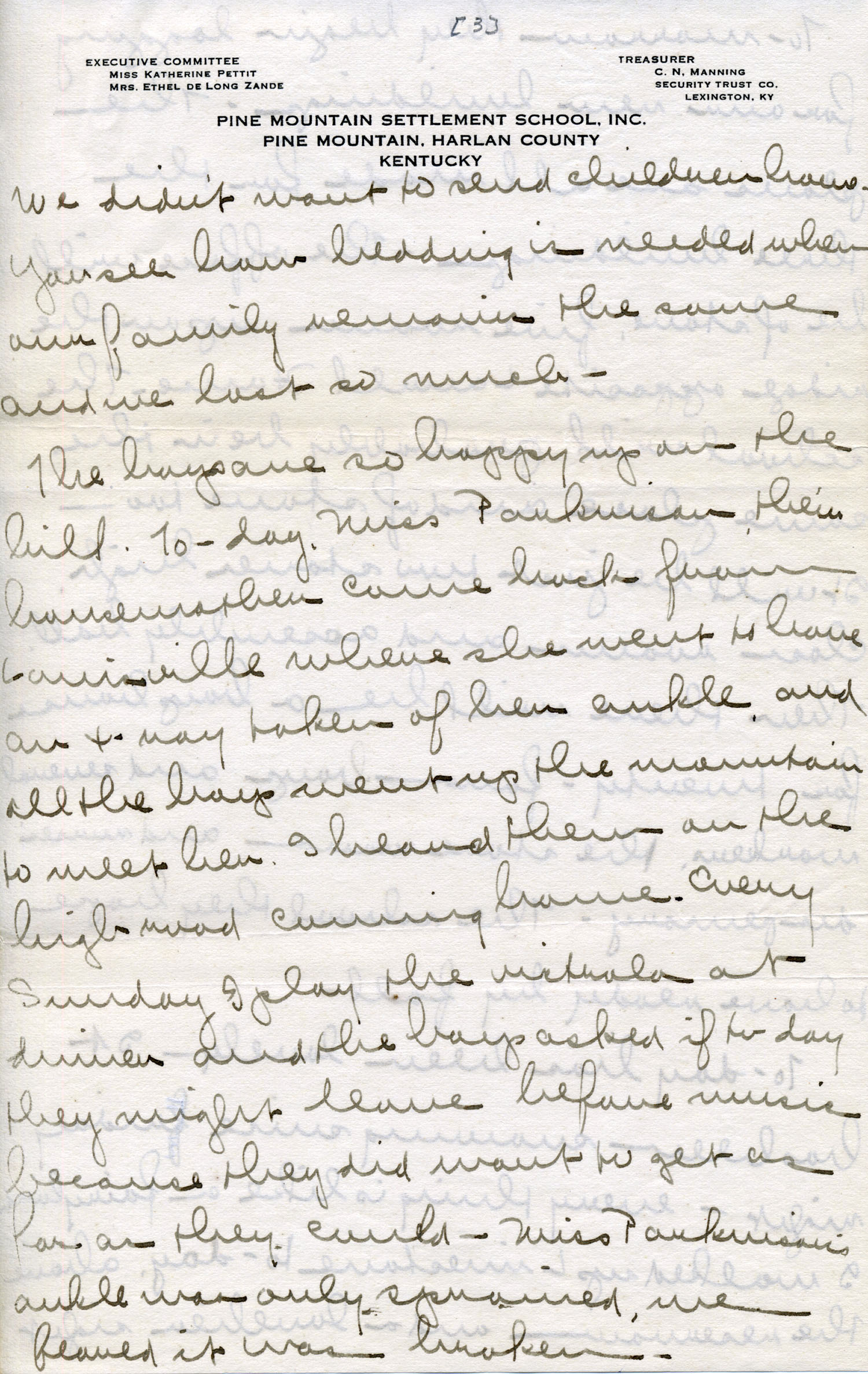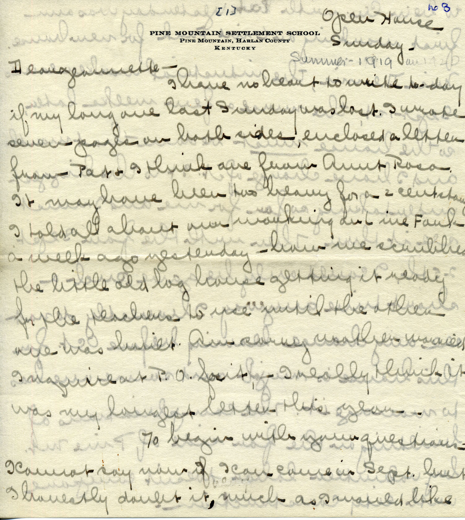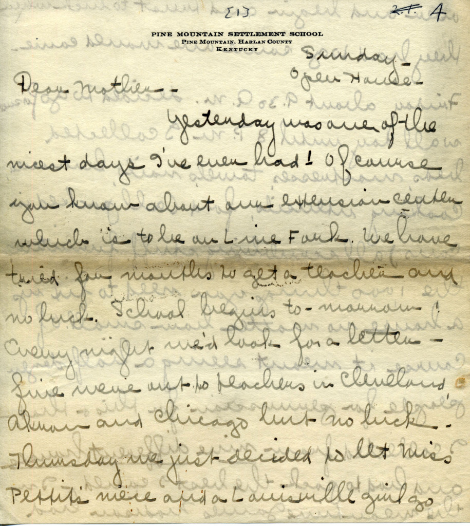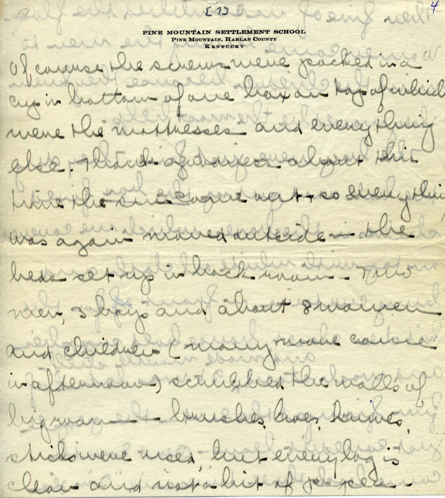 On Wednesday Mrs. Zande, Mr. [Leon] Deschamps, Miss [Angela] Melville and I went to Line Fork to pick out the spot and survey. I didn’t want the responsibility of it. Mrs. Z. rode Bobby, Miss Melville and I double on Nell. It was great fun. In the afternoon Mrs. Z. came back, the three of us surveyed the land. It took us hours but we had lots of fun. Really it is a lovely site, up on the ridge, quite high, facing Pine Mt. There is over an acre of level land, sort of a bench in the mountain side. The survey took in 3.3 acres, lovely woods. The company is giving us the land. Everyone on Line Fork is so interested and eager to begin work.