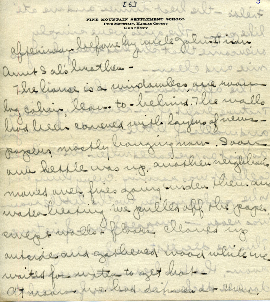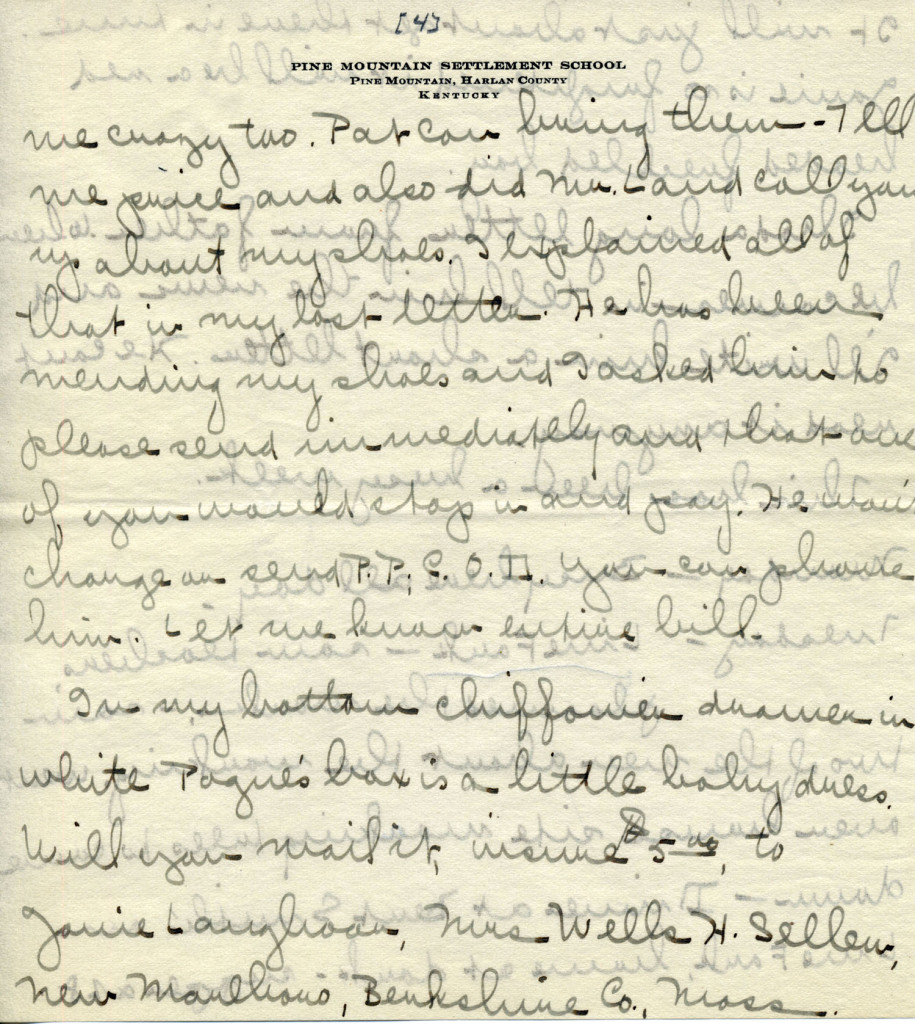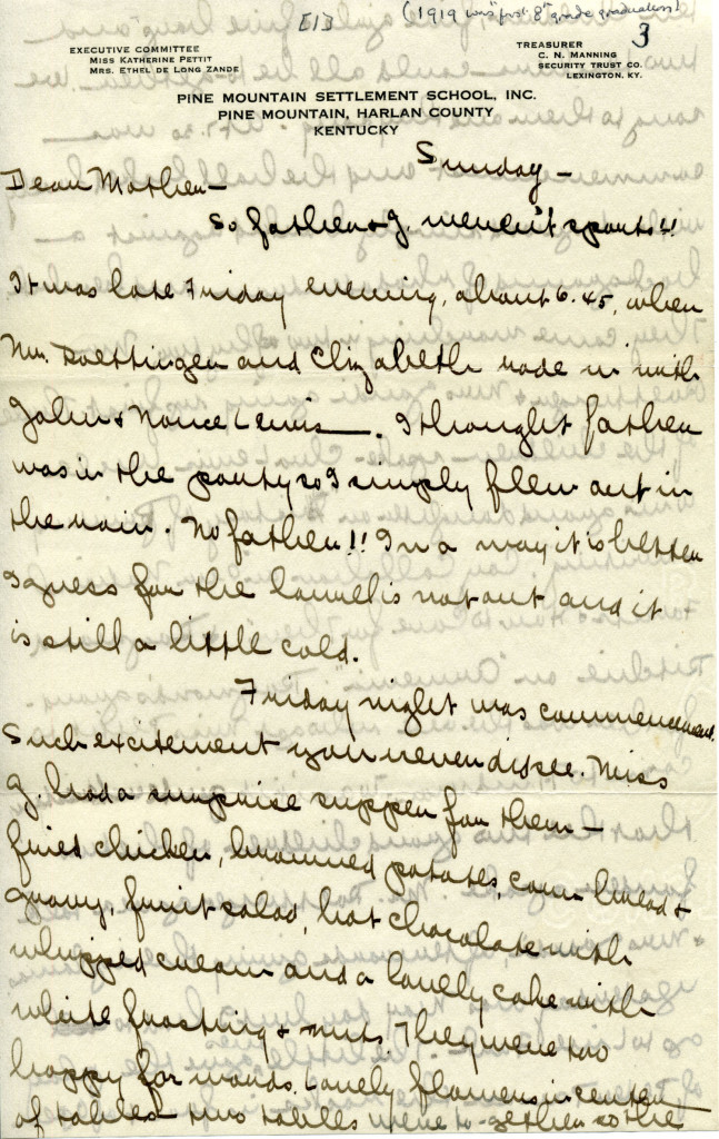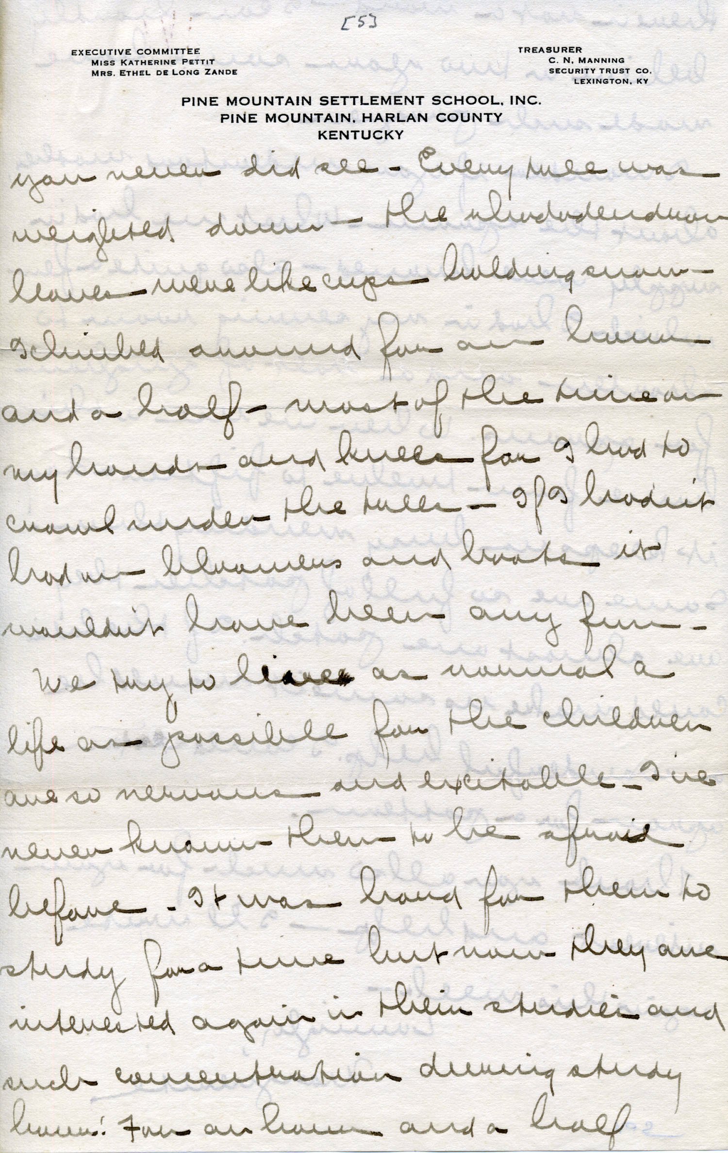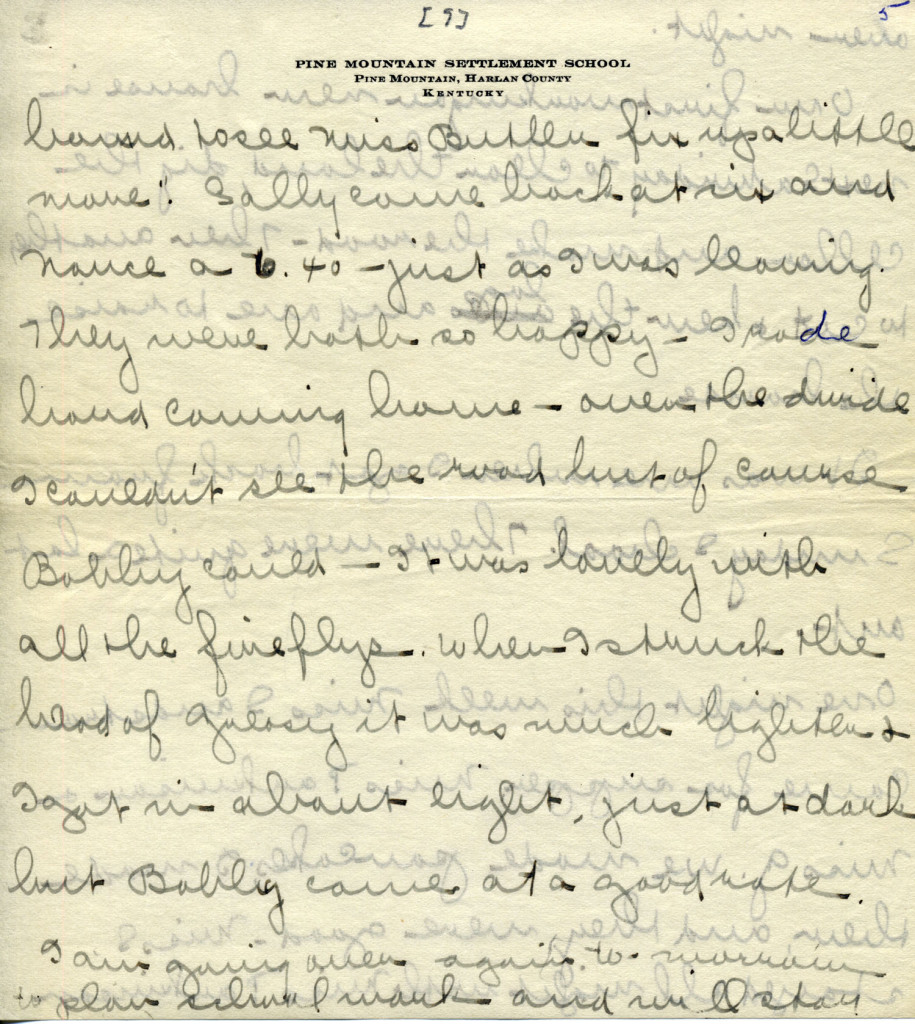 On Wednesday Mrs. Zande, Mr. [Leon] Deschamps, Miss [Angela] Melville and I went to Line Fork to pick out the spot and survey. I didn’t want the responsibility of it. Mrs. Z. rode Bobby, Miss Melville and I double on Nell. It was great fun. In the afternoon Mrs. Z. came back, the three of us surveyed the land. It took us hours but we had lots of fun. Really it is a lovely site, up on the ridge, quite high, facing Pine Mt. There is over an acre of level land, sort of a bench in the mountain side. The survey took in 3.3 acres, lovely woods. The company is giving us the land. Everyone on Line Fork is so interested and eager to begin work.