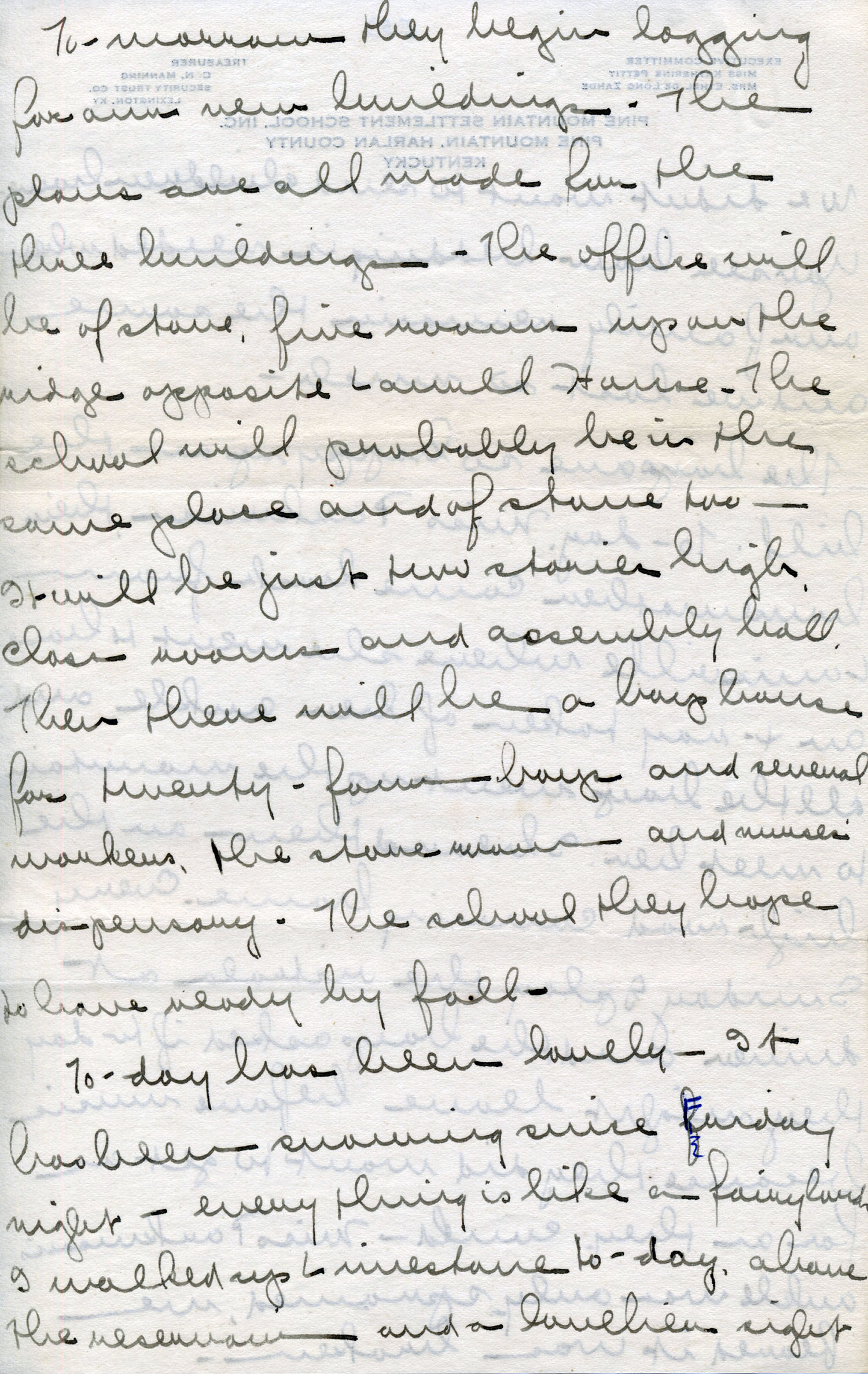 Tomorrow they begin logging for our new buildings. The plans are all made for the three buildings. The office will be of stone, five rooms up on the ridge opposite Laurel House. The school will probably be in the same place and of stone too — It will be just two stories high, classrooms and assembly hall. Then there will be a boys house for twenty-four boys and several workers, the storeroom and nurse’s dispensary. The school they hope to have ready by fall.