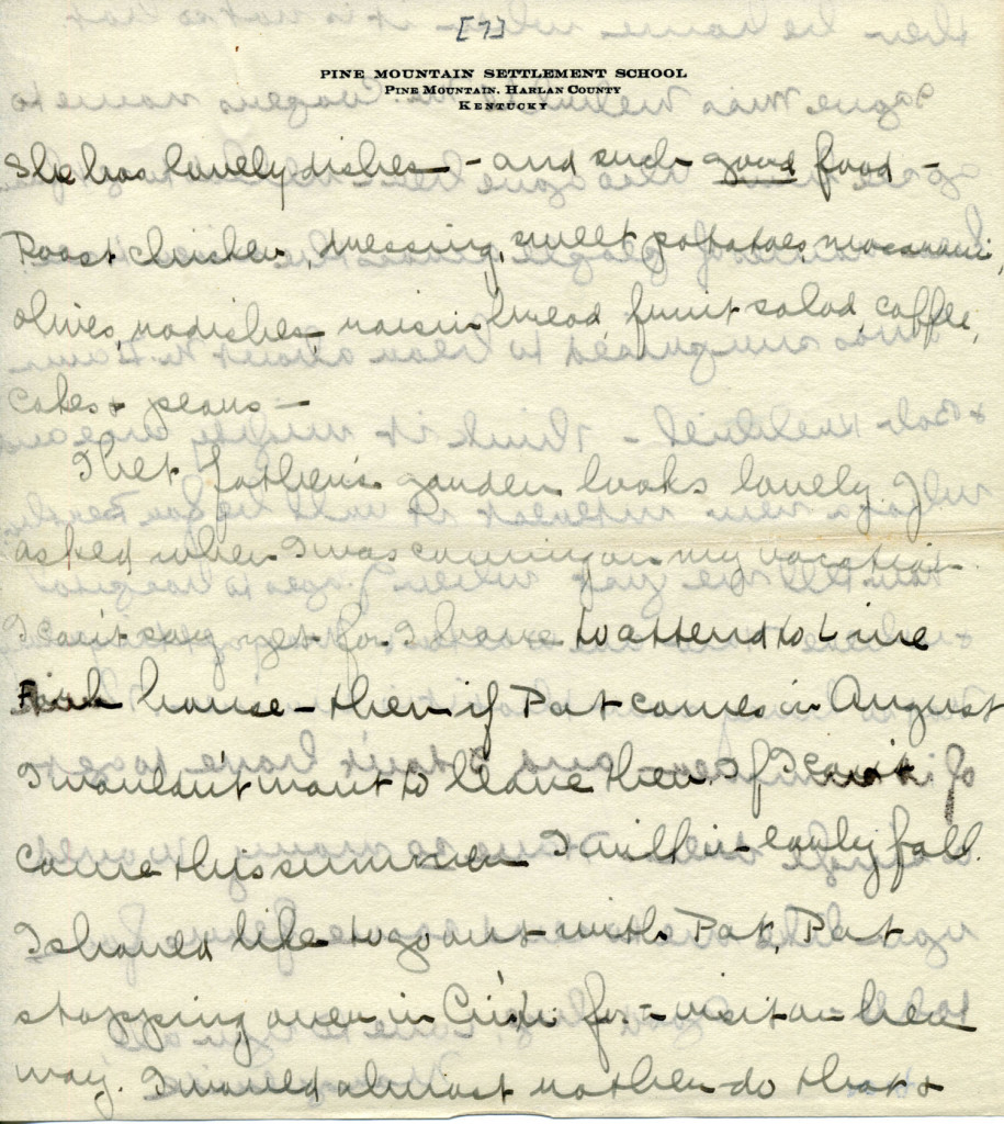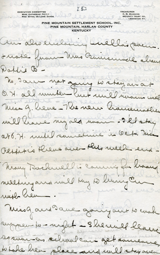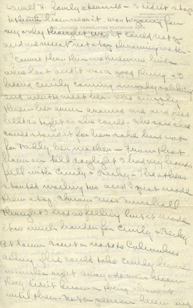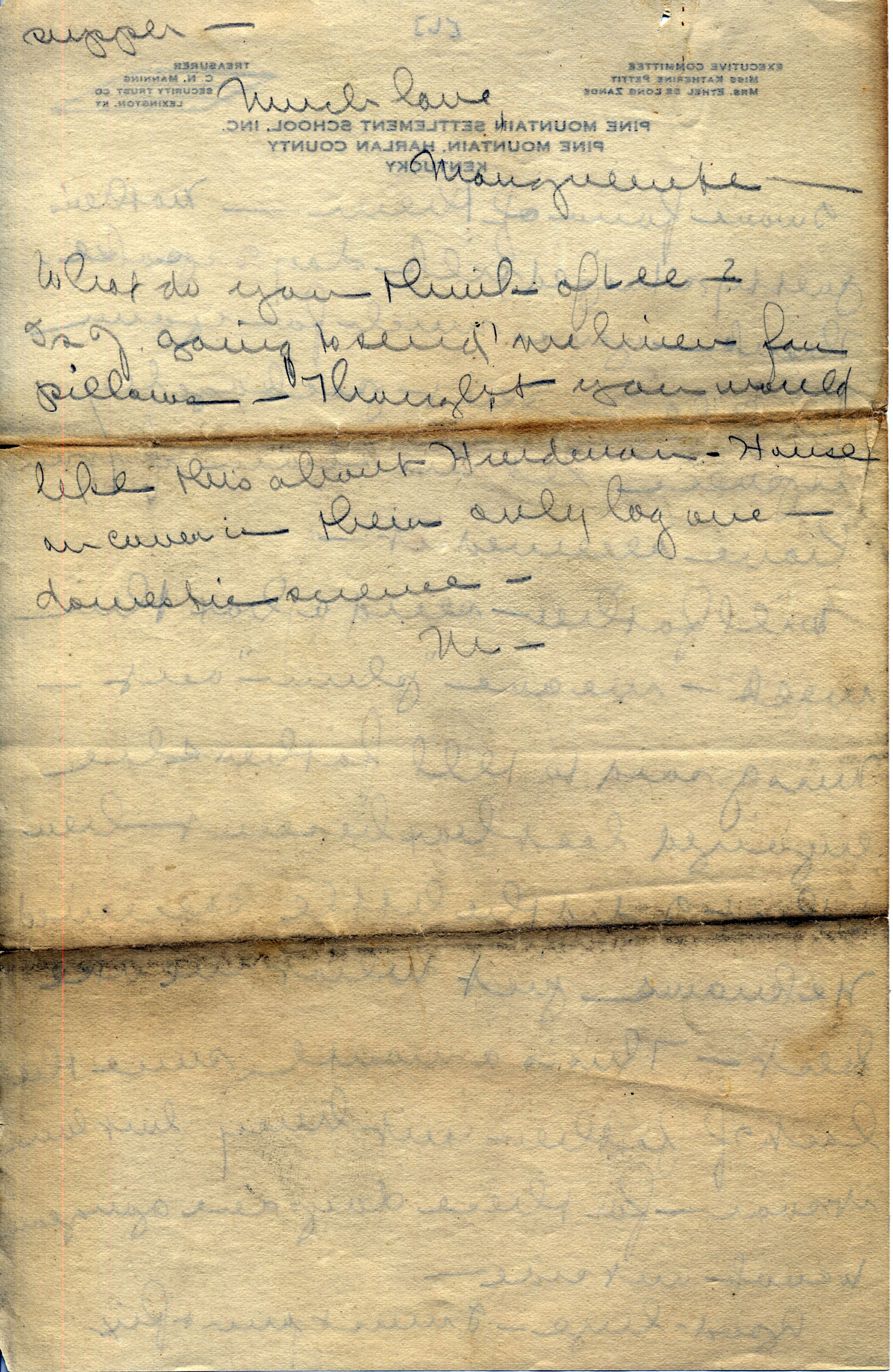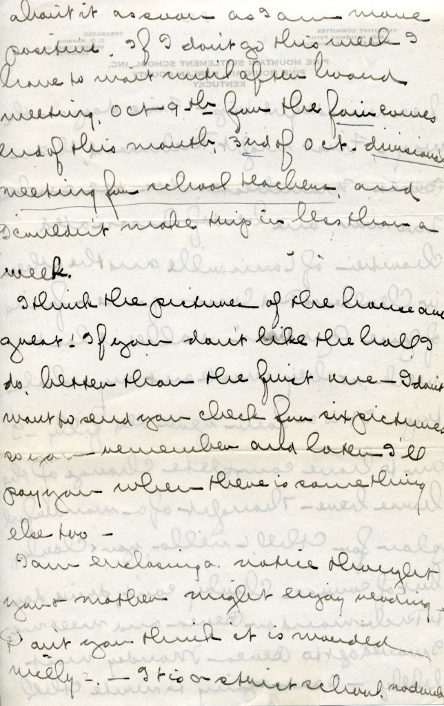 Now about Pat’s stopping over. I told her she must hurry and come and that she could shop on her way out. She is due here Sat. or Sunday. I will hear definitely this week. Whenever she writes don’t change it by persuading her to stay over as I am going to Dillon to meet her and I don’t want to get clear there and no Pat. I can not meet her that Monday as I have a meeting planned at mouth of Abner’s Branch for extension worker of University of Louisville. Do you understand? If she writes she will arrive Sunday – ship her off Sat. night. I won’t hear from her in time to write you again.