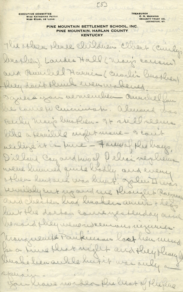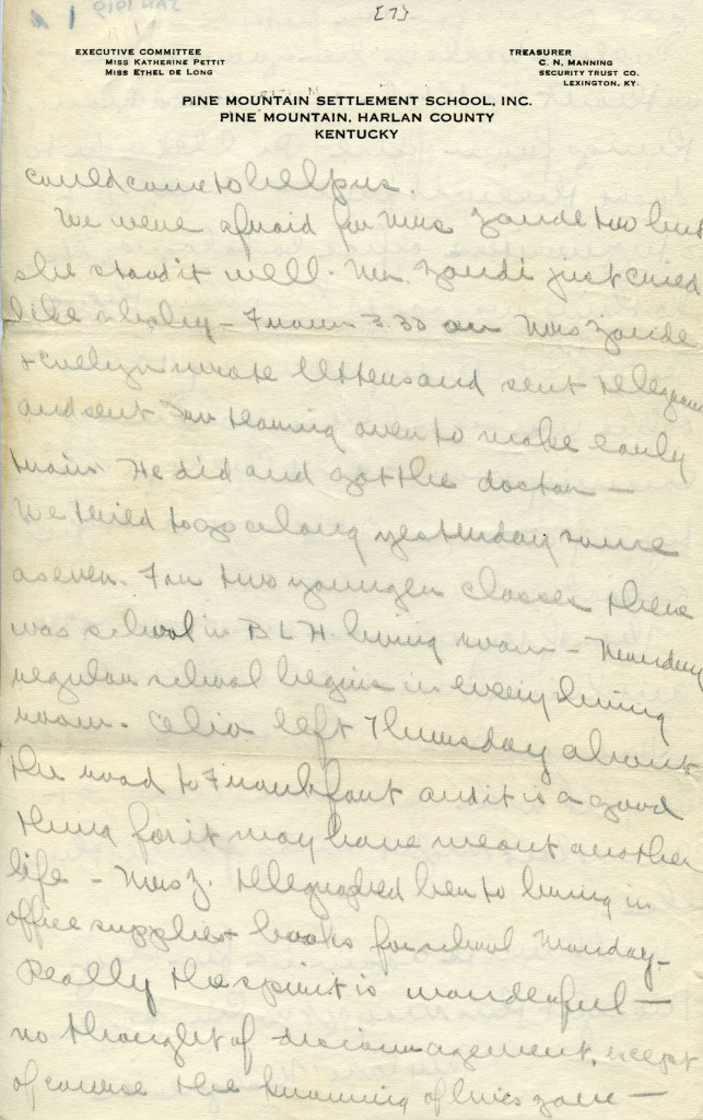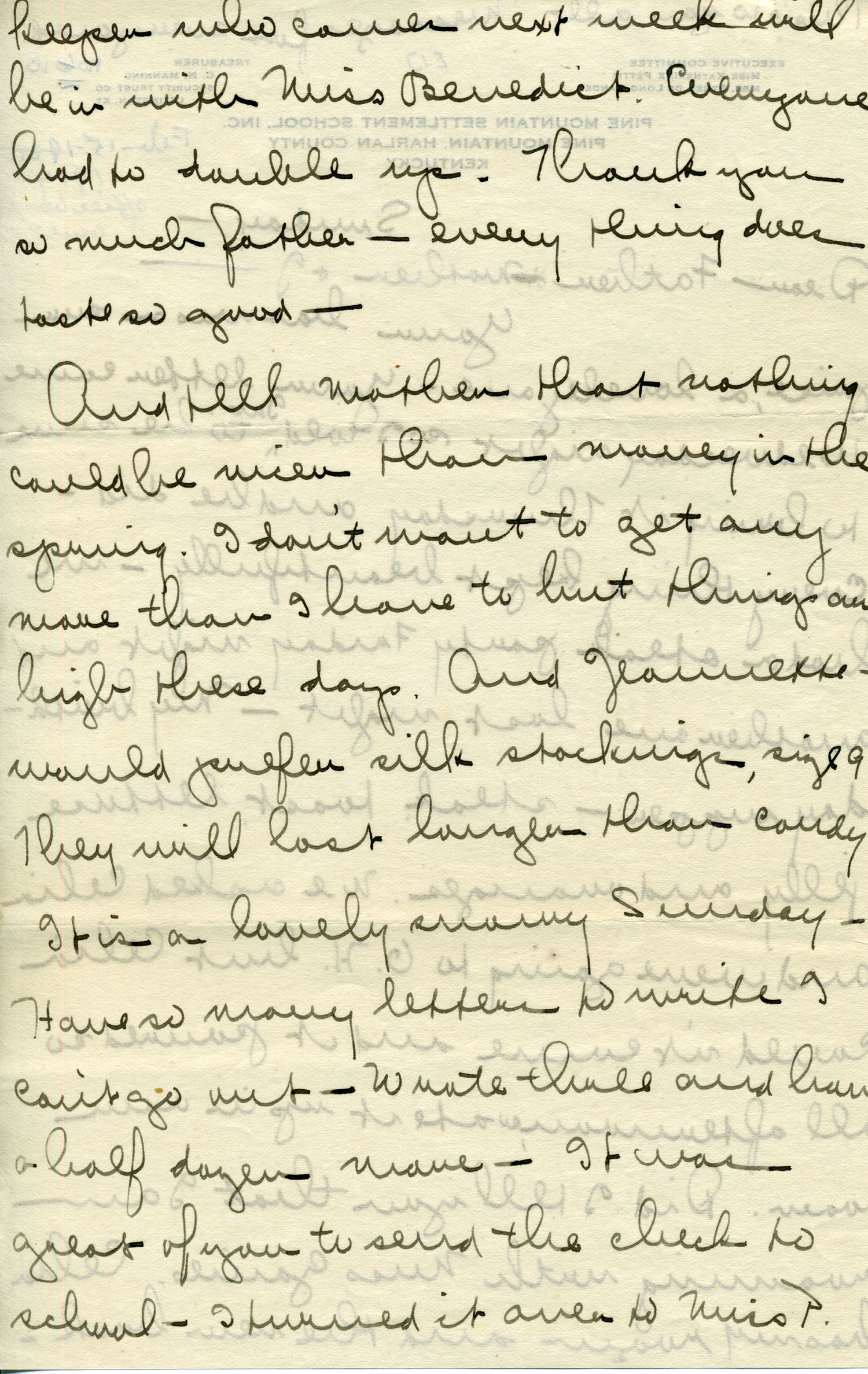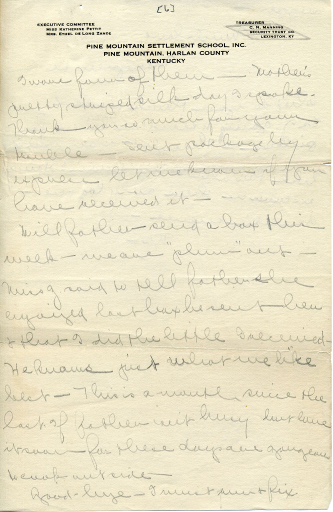Now about Pat’s stopping over. I told her she must hurry and come and that she could shop on her way out. She is due here Sat. or Sunday. I will hear definitely this week. Whenever she writes don’t change it by persuading her to stay over as I am going to Dillon to meet her and I don’t want to get clear there and no Pat. I can not meet her that Monday as I have a meeting planned at mouth of Abner’s Branch for extension worker of University of Louisville. Do you understand? If she writes she will arrive Sunday – ship her off Sat. night. I won’t hear from her in time to write you again.