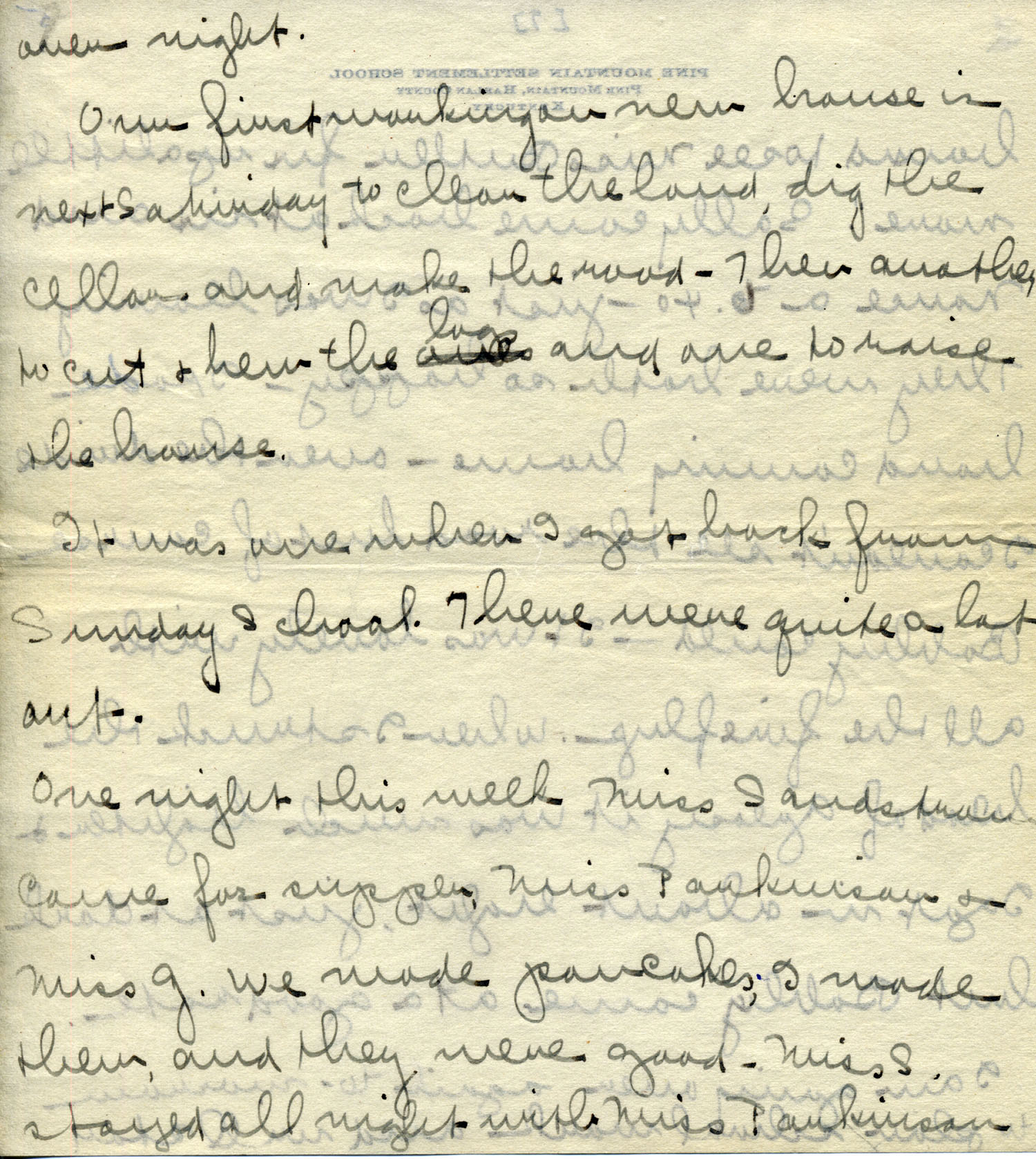 One night this week Miss Sandstrom came for supper, Miss Parkinson and Miss G[aines]. We made pancakes; I made them, and they were good. Miss S[andstrom] stayed all night with Miss Parkinson and me.