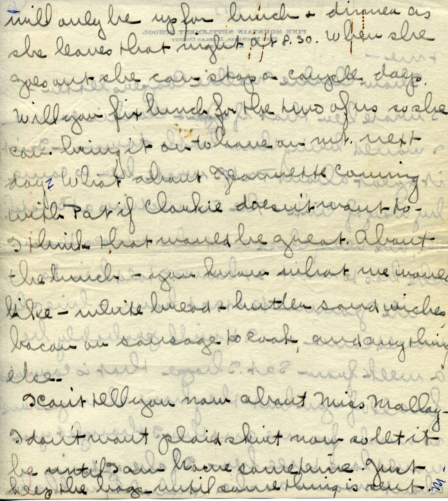 Show Clarkie Mallie Cooper’s letter. I wrote her that if J[eannette] and Clarkie came I would bring them both down. Isn’t it great about Pat? I wrote her to come by way of Cin’ti [Cincinnati]. The connections at Bristol, Va., are very close and [if] she misses train she has to wait 24 hours. I told her to write Jeannette exact hour and line she would come in. It will probably be a week from Sat. I hope that is convenient for all of you but they have always done so much for me and then I thought you would love to see her. If she gets in about noon as she probably will she will only be up for lunch and dinner as she leaves that night at 8:30. When she goes out she can stop a couple days. Will you fix lunch for the two of us so she can bring it on to have on m[ountain] next day? What about Jeannette coming with Pat if Clarkie doesn’t want to – I think that would be great. About the lunch — you know what we would like – white bread and butter sandwiches, bacon or sausage to cook, and anything else.