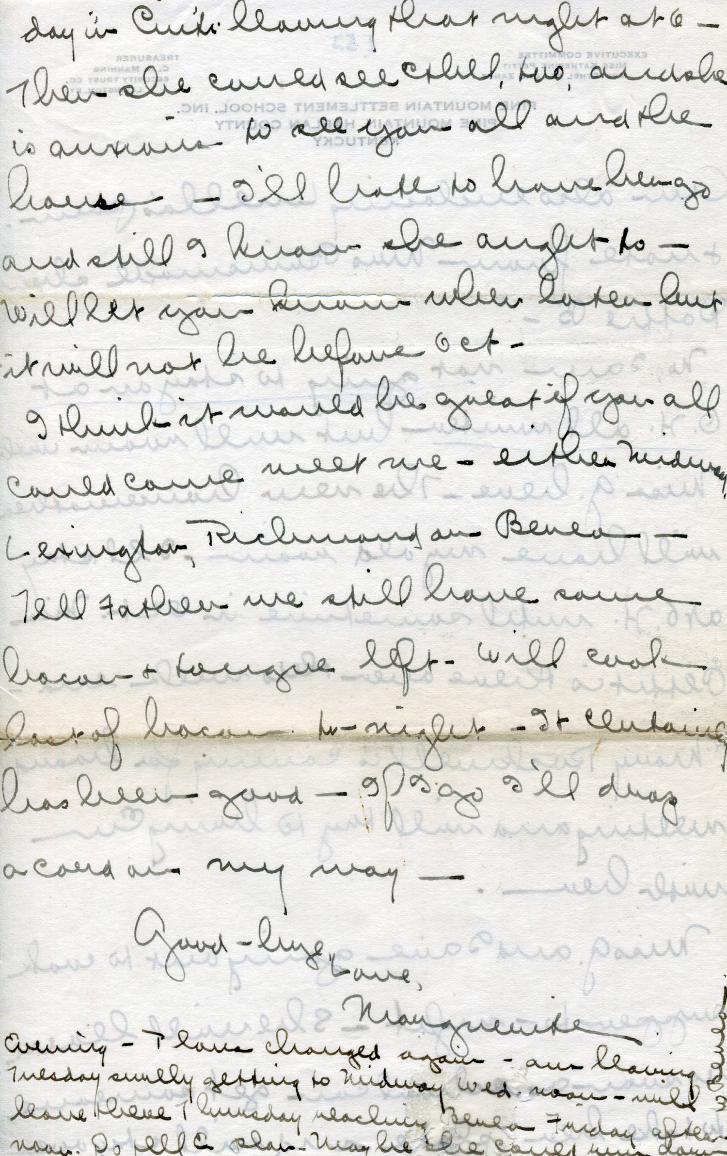 I think it would be great if you all could come meet me – either Midway, Lexington, Richmond or Berea. Tell Father we still have some bacon and tongue left. Will cook last of bacon tonight. It certainly has been good. If I go I’ll drop a card on my way. Good-bye, Love, Marguerite