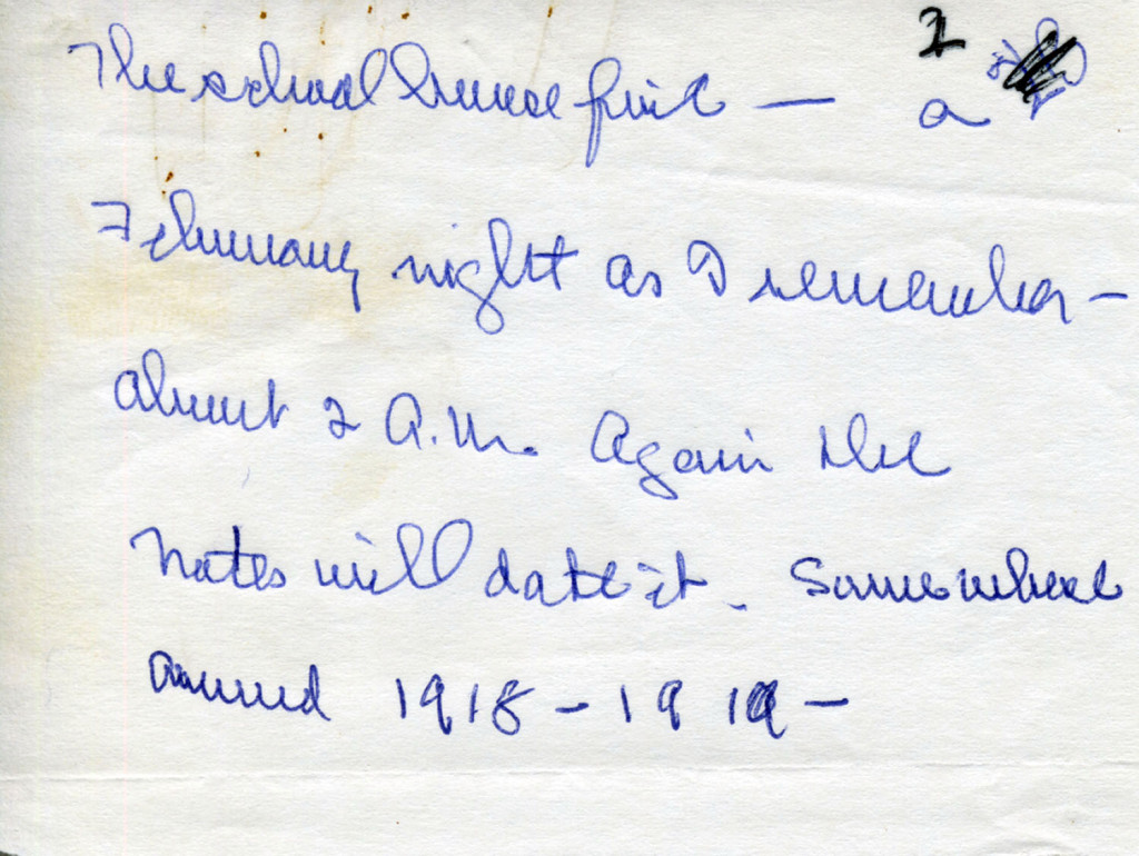 The schoolhouse fire, a February [sic] night as I remember — about 2 a.m. Again the notes will date it. Somewhere around 1918-1919. [January 1919]