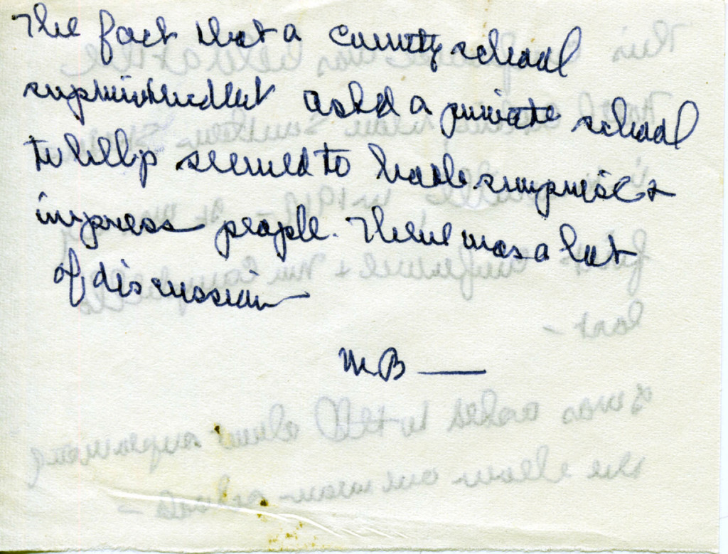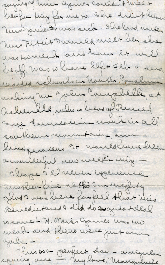 Was to have left Feb. 9 and visited schools in North Carolina, making Mr. John Campbell‘s, at Asheville, who is head of Russell Sage Foundation, work in all southern mountains our headquarters. It would have been a wonderful two week’s trip. [This would have been MBB’s first direct contact with John C. Campbell and the Folk School where she would spend the last part of her life. Miss Gaines would eventually leave for the John C. Campbell Folk School, as well. HW]