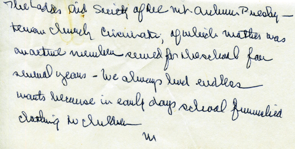 The Ladies Aid Society* of the Mt. Auburn Presbyterian Church, Cincinnati, of which mother was an active member, sewed for the school for several years. We always had endless wants because in early days school furnished clothing to children.