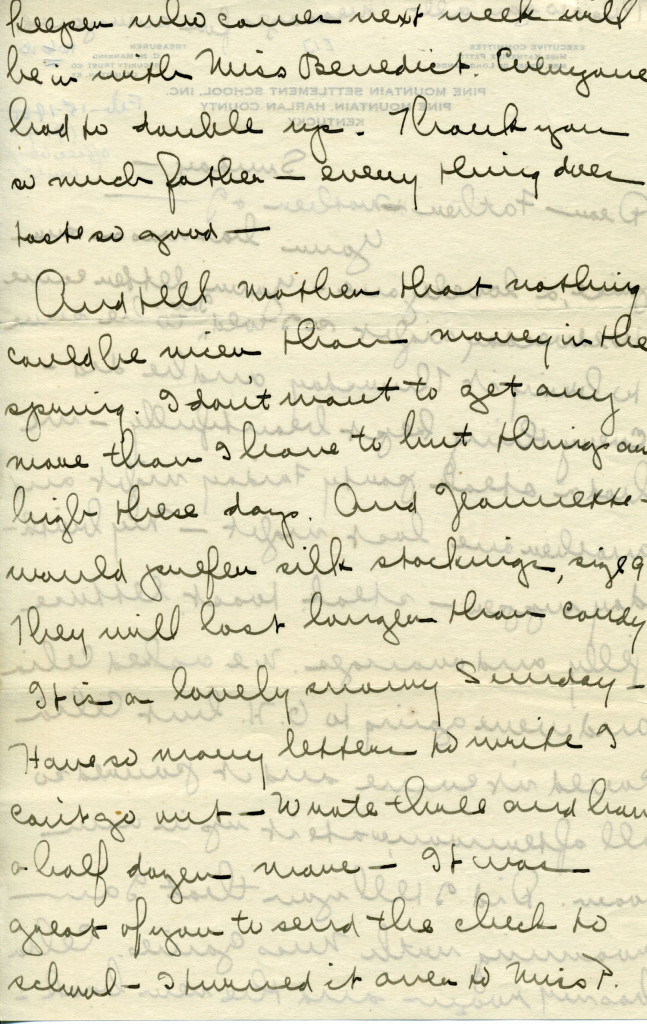 And tell Mother that nothing could be nicer than money in the spring. I don’t want to get any more than I have to ,but things are high these days. And Jeannette — would prefer silk stockings, size 9. They will last longer than candy.