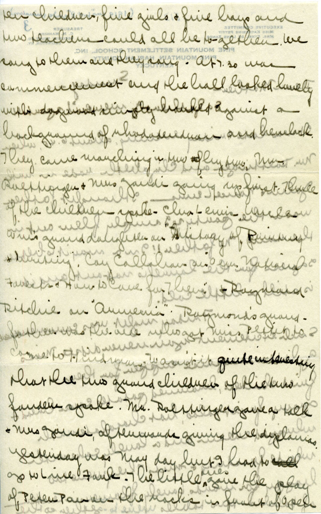 At 7:30 was commencement and the hall looked lovely with dogwood simply banked against a background of rhododendron and hemlock. They came marching in two by two, and Mrs. Zande going up first. Three of the children spoke — Elva Lewis, Uncle Wm’s granddaughter on “History of Printing and Writing,” Coy Callahan on “Our National Forests and How to Care for Them,” and Raymond Ritchie on “America.” Raymond’s grandfather was the one who got Miss Pettit to come to Hindman. Wasn’t it quite interesting that the two grandchildren of the two founders spoke? Mr. Roettinger gave a talk and Mrs. Zande, afterwards giving the diplomas.