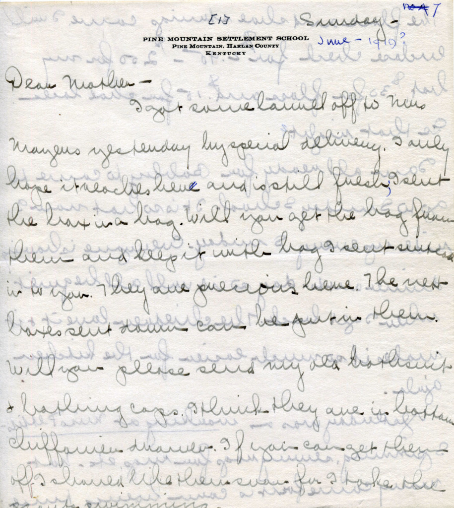 Dear Jeannette — I have no heart to write today if my long one last Sunday was lost. I wrote seven pages on both sides, enclosed a letter from Pat and I think one from Aunt Rosa. It may have been too heavy for a 2 cent stamp. I told all about our working on Line Fork a week ago yesterday – how we scrubbed the little old log house getting it ready for the teachers to use until the other one was built. Am sorry mother worried. Inquire at P. O. for it. I really think it was my longest letter this year.