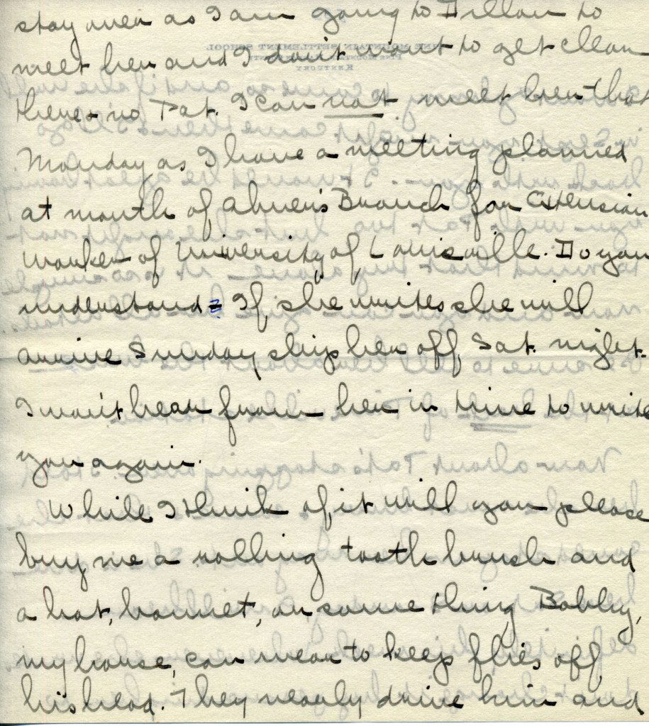 While I think of it will you please buy me a rolling tooth brush and a hat, bonnet, or something Bobby, my horse, can wear to keep flies off his head. They nearly drive him and me crazy too. Pat can bring them. Tell me price and also did Mr. Land call you up about my shoes. I explained all of that in my last letter. He has been mending my shoes and I asked him to please send immediately and that one of you would stop in and pay. He won’t charge or send P.O.C.O.D. You can phone him. Let me know entire bill.