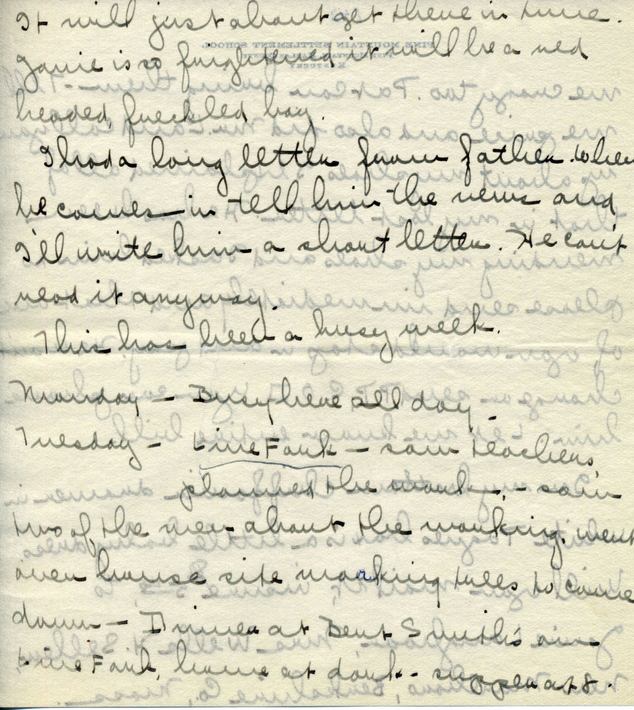 It seems as though nothing has happened this week. Everything is started now and winter school running smoothly. I am enclosing a note to Jeannette, the heading of letter to show your daughter’s name in print, and