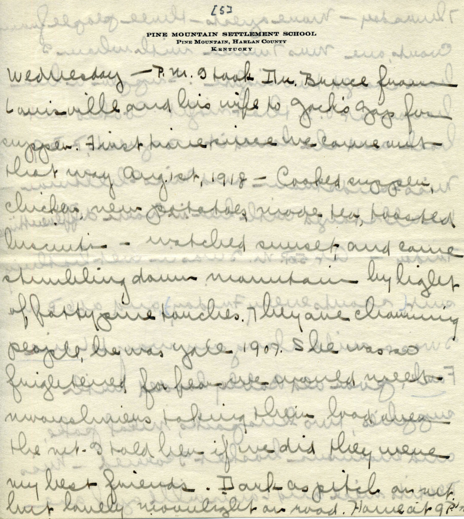 Wednesday — P.M. I took Dr. Bruce from Louisville and his wife to Jack’s Gap for supper. First time since we came out that way Aug. 1st, 1918. Cooked supper, chicken, new potatoes, made tea, toasted biscuits – watched sunset and came stumbling down mountain by light of fatty pine torches. They are charming people, he was Yale 1907. She was so frightened for fear we would meet moonshiners taking their load over the mt. I told her if we did they were my best friends. Dark as pitch on mountain but lovely moonlight on road. Home at 9 p.m.