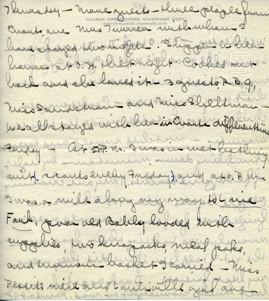 Thursday — More guests — three people from Evarts, one Mrs. Turner with whom I have stayed two nights. Supper in her honor at O. H. that night. Cooked out back and she loved it – 3 guests, R.B.G[aines], Miss Sandstrom and Miss Sheltman. We all stayed with her in Evarts different times.