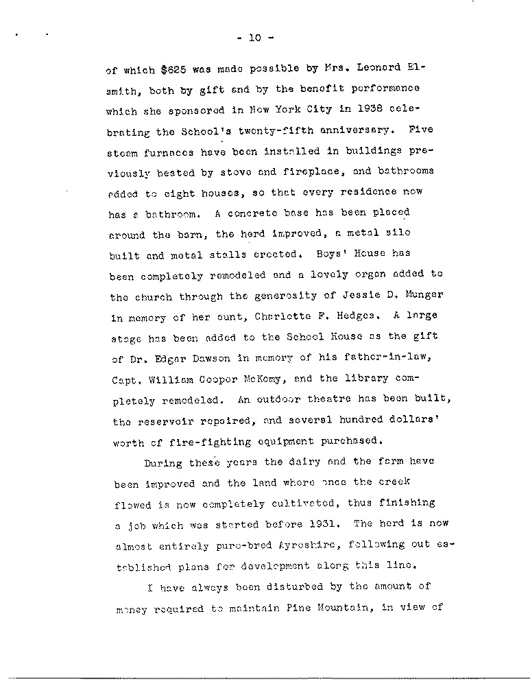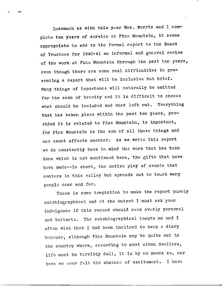 Inasmuch as with this year Mrs. Morris and I complete ten years of service at Pine Mountain, it seems appropriate to add to the formal feport to the Bo9ard of Trustees for 1940-41 an informal and general review of the work at Pine Mountain through the past ten years, even though there are some real difficulties in presenting a report- that will be inclusive but brief. Many things of inportance will naturally be omitted for the sake of brevity and it is difficult to choose what should be included and what left out. Everything that has taken plac3ee within the past ten years, provided it is related to Pine Moiuntain, is important, for Pine Mountain is the sum of all these things and one event affects another. As we write this report we do constantlly have in mind the work that has been done which is not mentioned here, the gifts that have been made — in short, the entire play of events that centers in this valley but spreads out to touch many people near and far.