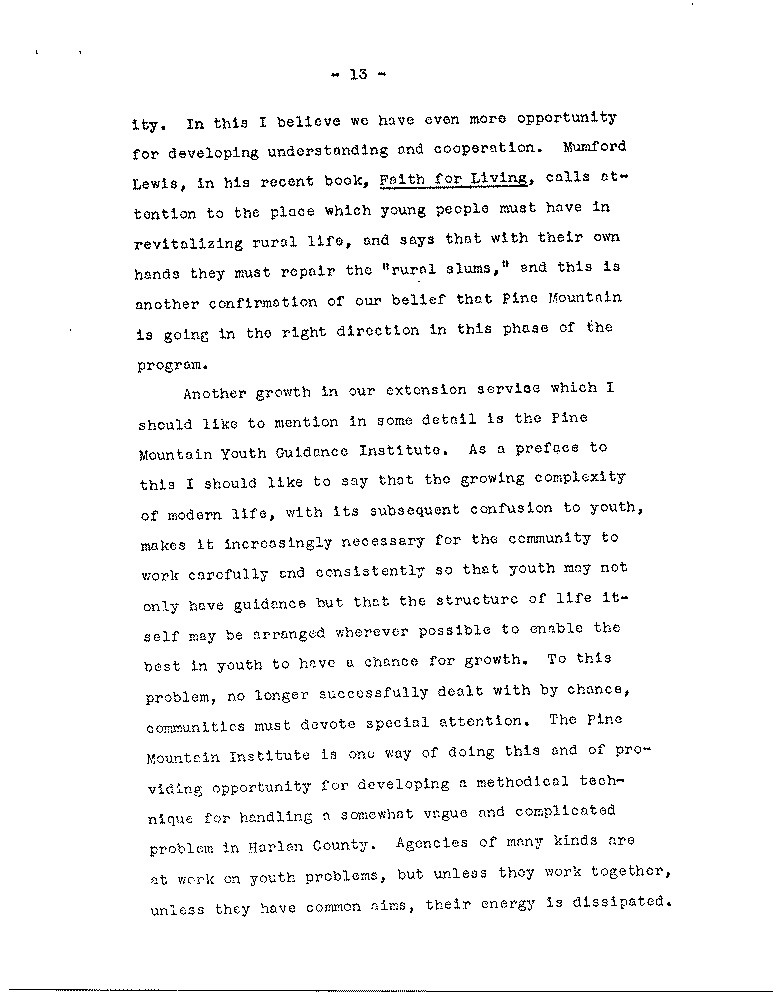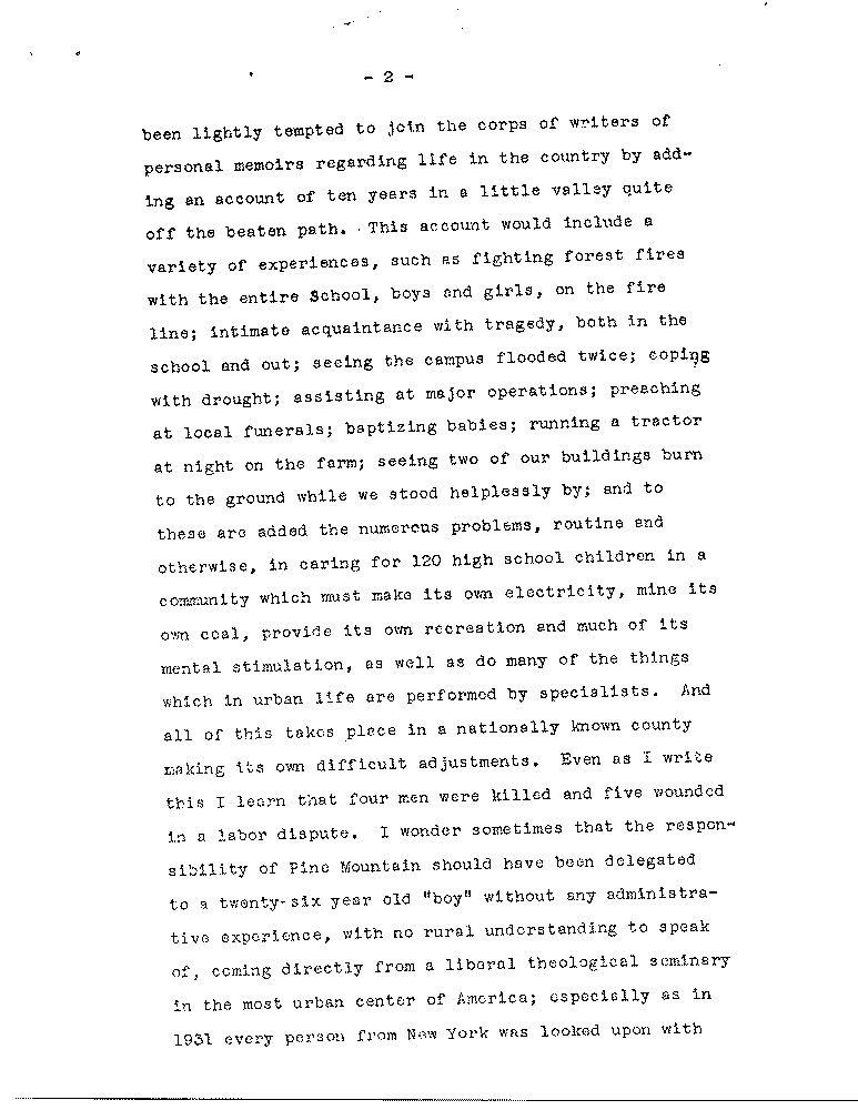 been lightly tempted to join the corps of writers of personal memoirs regarding life in the country by adding an account of ten years in a little valley quite off the beaten path. this account would include a variety of experiences, such as fighting forest fires with the entire School, boys and girls, on the fire line; intimate acquaintance with tragedy, both in the school and out; seeing the campus flooded twice; coping with drought; assisting at major operations; preaching at local funerals; baptizing babies; running a tractor at night on the farm; seeing two of our buildings burn to the ground while we stood helplessly by; and to these are added the numerous problems, routine and otherwise, in caring for 120 high school children in a community which must make its own electricity, mine its own coal, provide its own recreation and much of its mental stimulation, as well as do many of the things which in urban life are performed by specialists. And all of this takes place in a nationally known county making its own difficult adjustments. Even as I write this I learn that four men were killed and five wounded in a labor dispute. I wonder sometimes that the responsibility of Pine Mountain should have been delegated to a twenty-six-year-old “boy” without any administrative experience, with no rural understanding to speak of, coming directly from a liberal theological seminary in the most urban center of America; especially as in 1931 every person from New York was looked upon with