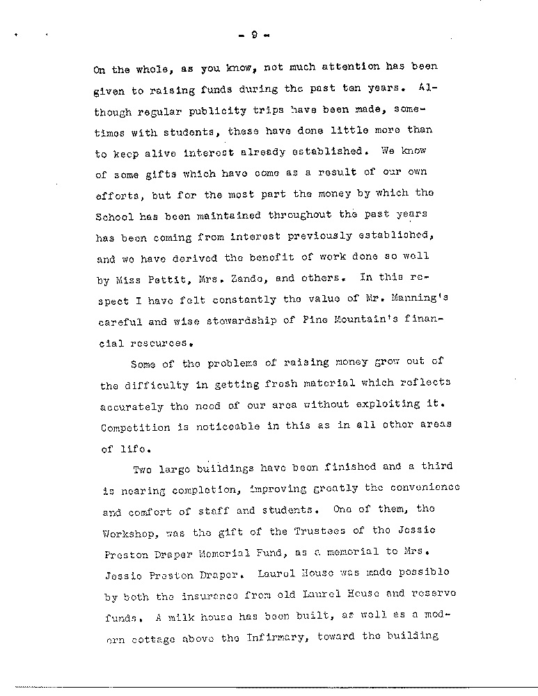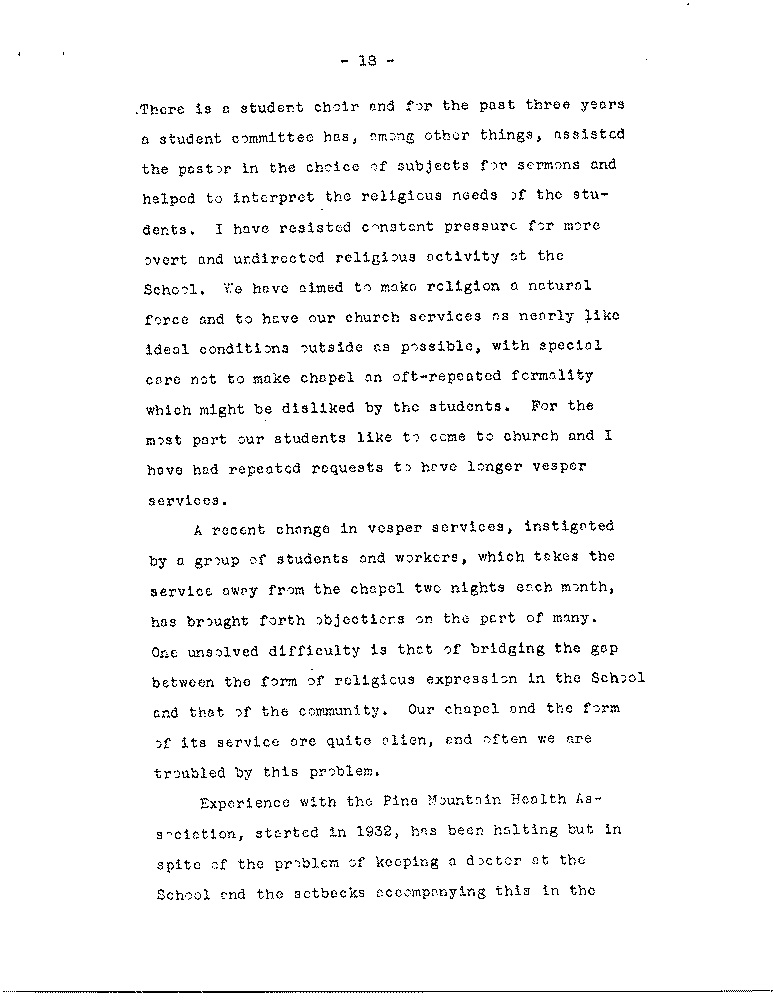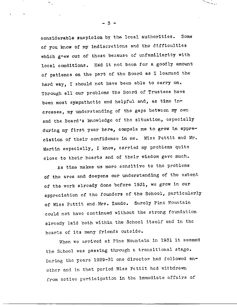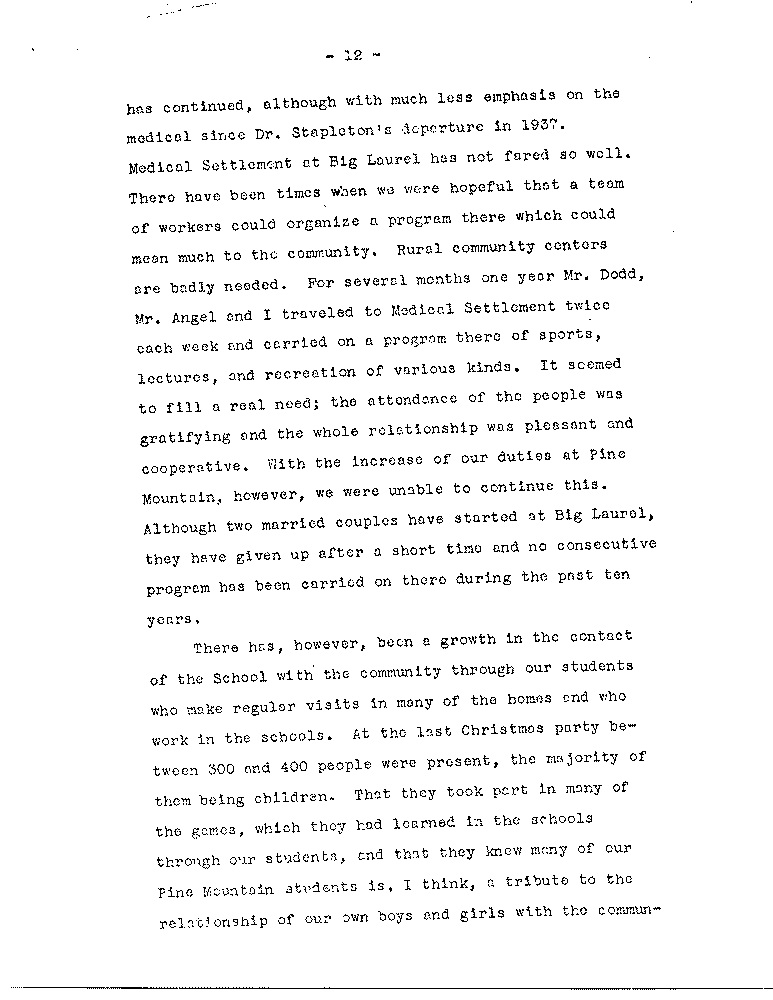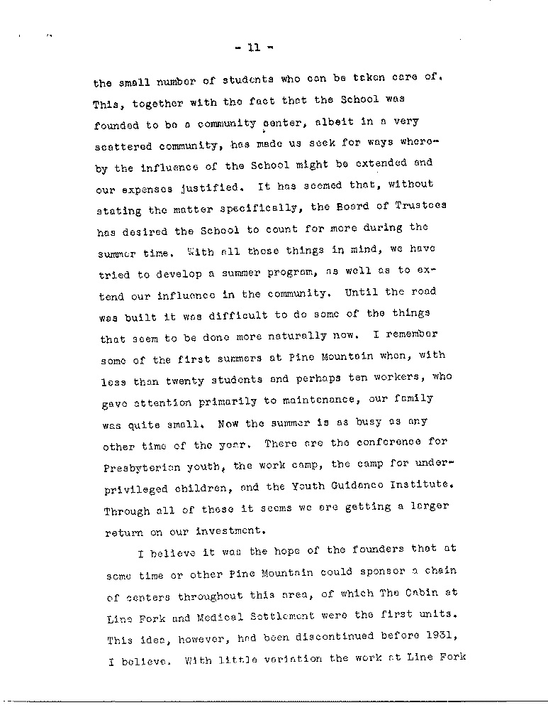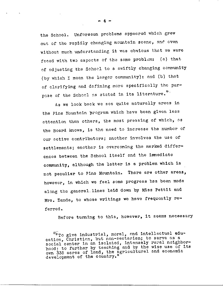 As we look back we see quite naturally areas in the Pine Mountain program which have been given less attention than others, the most pressing of which, as the Board knows, is the need to increase the number of our active contributors: another involves the use of settlements; another is overcoming the marked differences between the School itself and the immediate community, although the latter is a problem which is not peculiar to Pine Mountain. there are other areas, however, in which we feel some progress has been made along the general lines laid down by Miss Pettit and Mrs. Zande, to whose writings we have frequently referred.