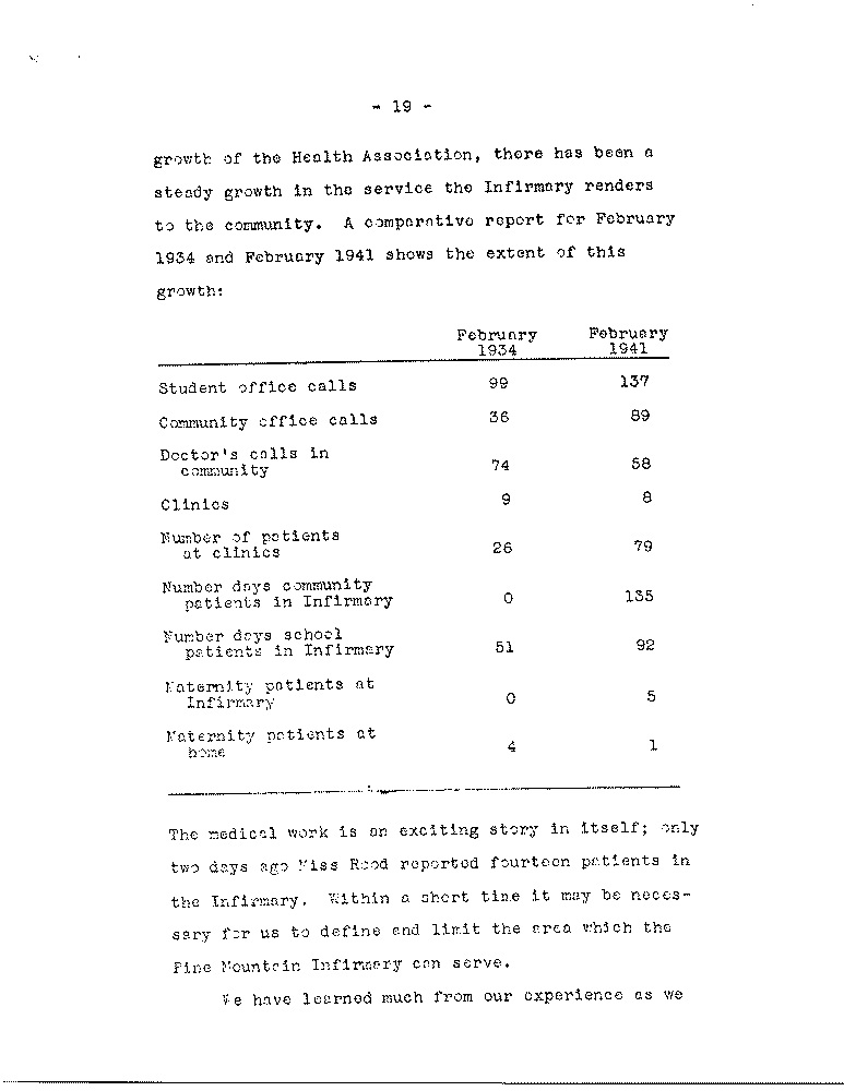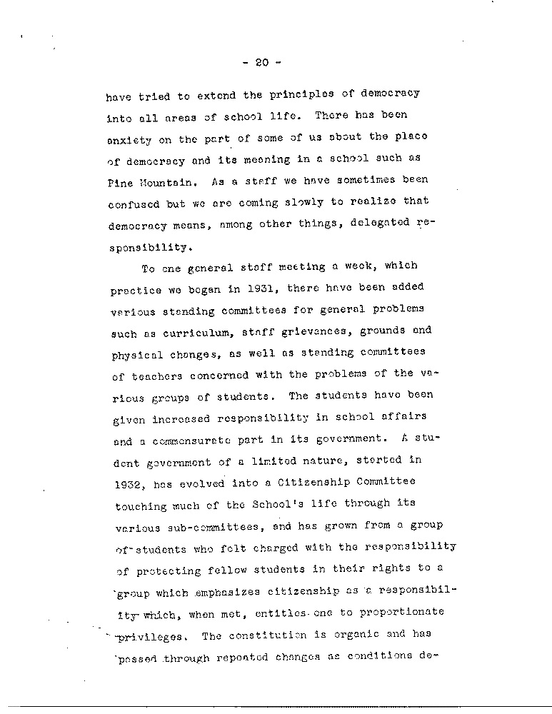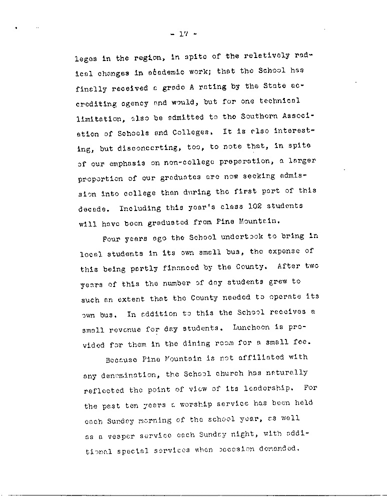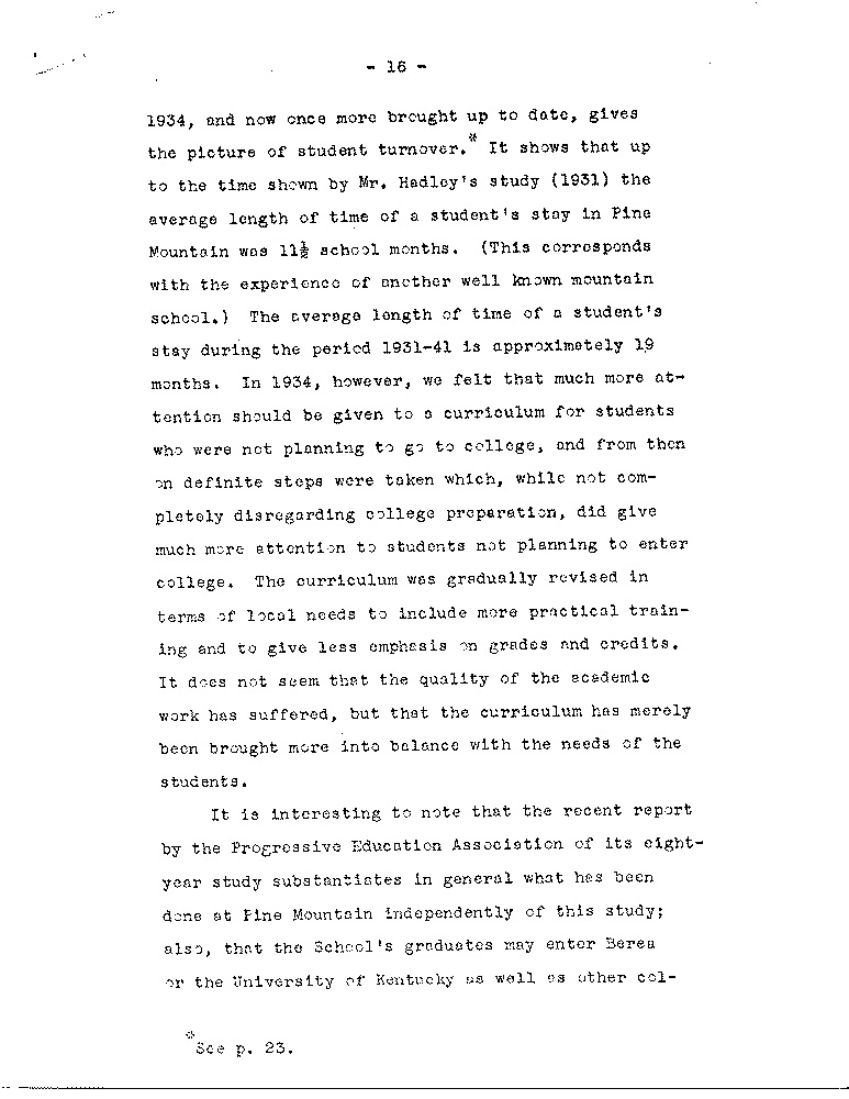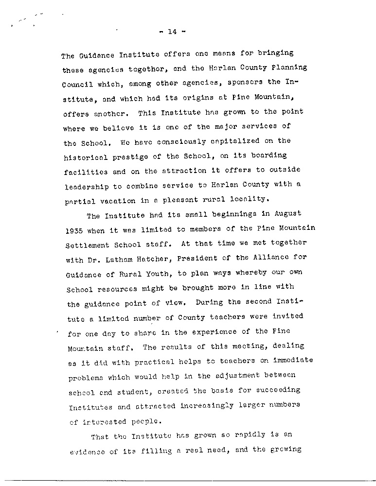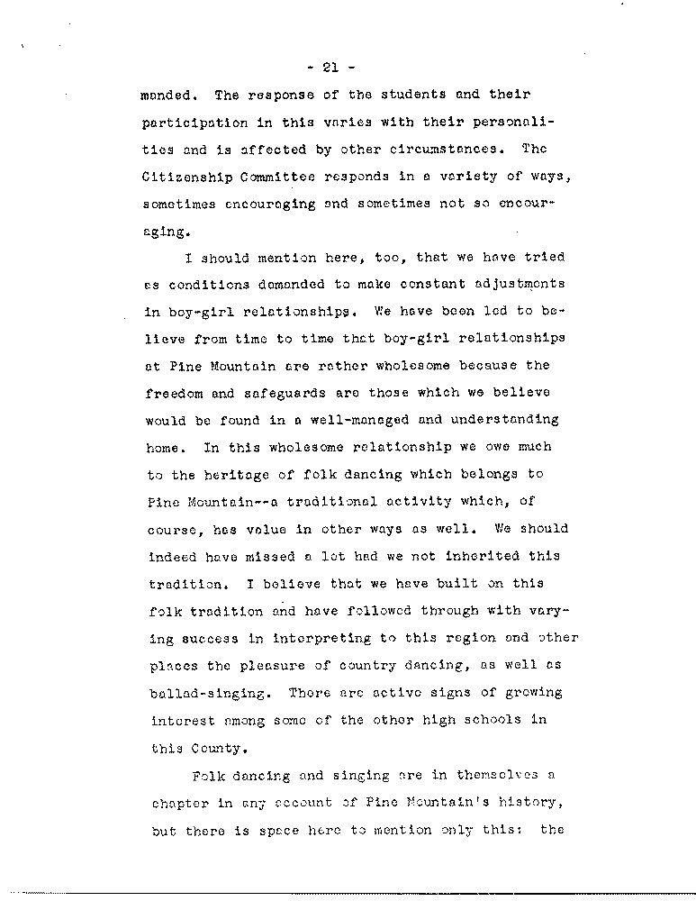 As we look back we see quite naturally areas in the Pine Mountain program which have been given less attention than others, the most pressing of which, as the Board knows, is the need to increase the number of our active contributors: another involves the use of settlements; another is overcoming the marked differences between the School itself and the immediate community, although the latter is a problem which is not peculiar to Pine Mountain. there are other areas, however, in which we feel some progress has been made along the general lines laid down by Miss Pettit and Mrs. Zande, to whose writings we have frequently referred.