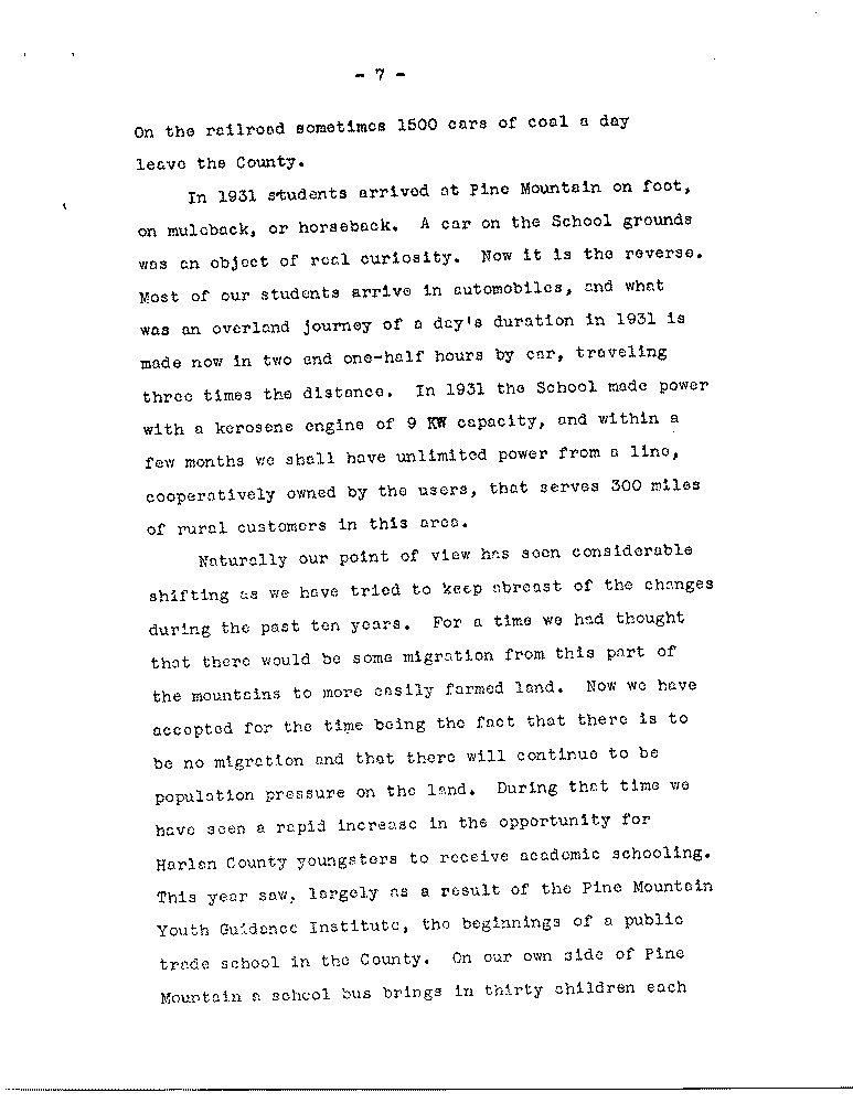 to tell something of the changes which have taken place in Harlan County through the past ten years. These changes are constantly on our minds both because they come so rapidly and are radical, and because any failure to recognize them would make the School an anachronism. even in other sections of the highlands, where the changes have been relatively more normal, many schools have either been absorbed into the public school system or have had to close, in spite of the fact that the basic problems of the area remain acute and offer a challenge to new ways of service. It is difficult to evaluate the extent of the change in Harlan County but some description may help in gauging its extent.