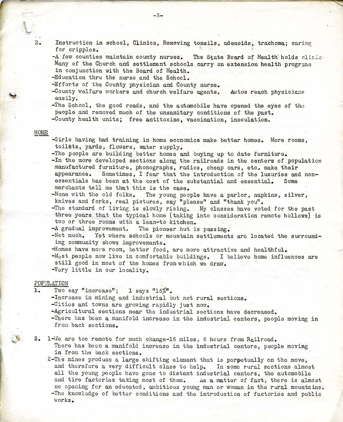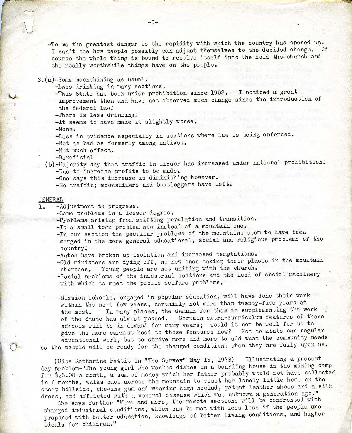 This survey, located on page 38 in the Scrapbook Before 1929, cites a comment made by Katherine Pettit in “Progress in the Hills,” an article in the magazine, The Survey, May 15, 1923. In Pettit’s comment, she focuses on several aspects that resonate with the concerns seen in the “Shifting Aspects …” survey.