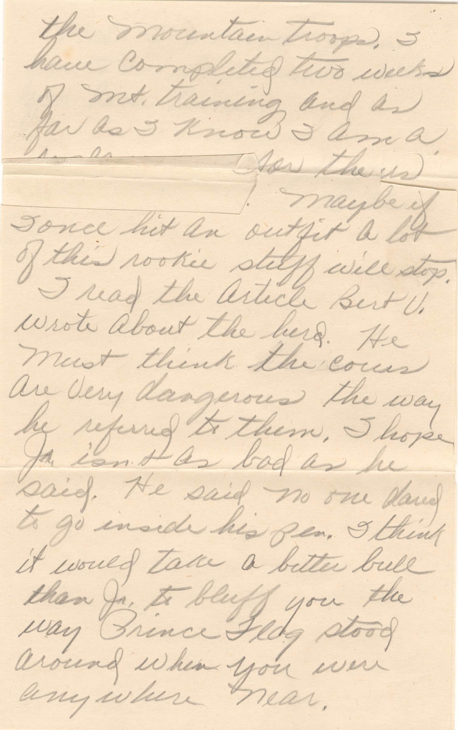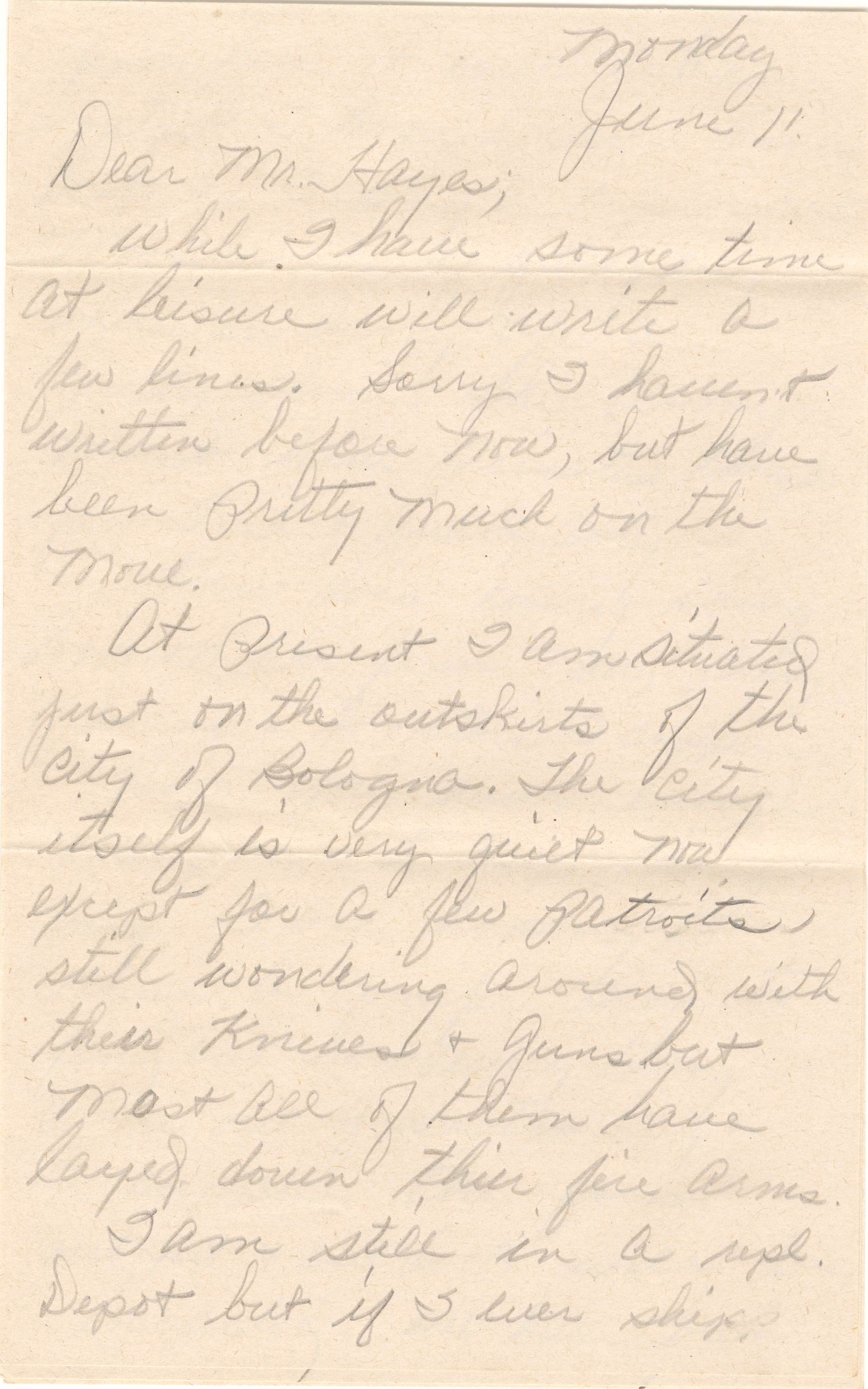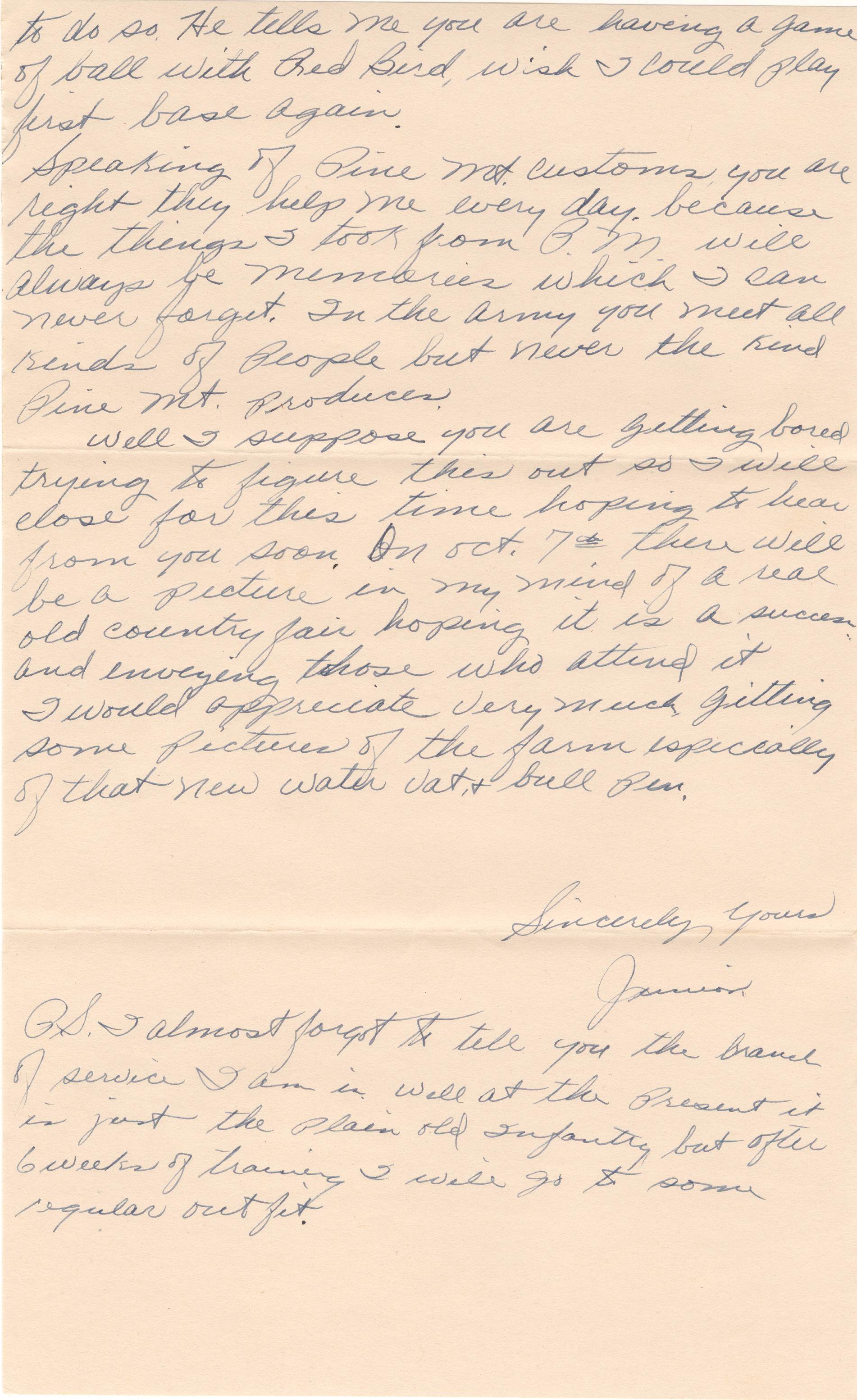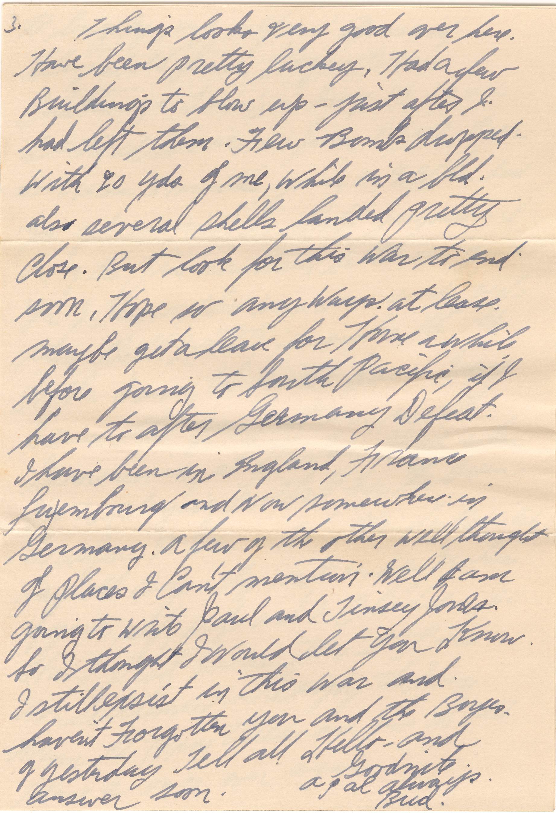 of the other well thought of places I can’t remember. Well I am going to write Paul [Paul Hayes] and Tinsey Jones [“Dan” Buck Jones] . So I thought I would let you know. I still exist in this war and haven’t forgotten you and the Boys of yesterday. Tell all Hello–and answer soon.
